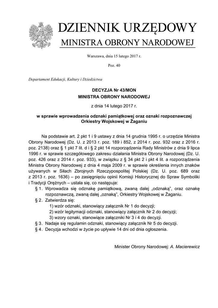 Warszawa, dnia 15 lutego 2017 r. Poz. 40 Departament Edukacji, Kultury i Dziedzictwa DECYZJA Nr 43/MON MINISTRA OBRONY NARODOWEJ z dnia 14 lutego 2017 r. w sprawie wprowadzenia odznaki pamiątkowej oraz oznaki rozpoznawczej Orkiestry Wojskowej w Żaganiu Na podstawie art. 2 pkt 1 i 9 ustawy z dnia 14 grudnia 1995 r. o urzędzie Ministra Obrony Narodowej (Dz. U. z 2013 r. poz. 189 i 852, z 2014 r. poz. 932 oraz z 2016 r. poz. 2138) oraz § 1 pkt 7 lit. d i § 2 pkt 14 rozporządzenia Rady Ministrów z dnia 9 lipca 1996 r. w sprawie szczegółowego zakresu działania Ministra Obrony Narodowej (Dz. U. poz. 426 oraz z 2014 r. poz. 933), w związku z § 34 pkt 2 i pkt 4 lit. a rozporządzenia Ministra Obrony Narodowej z dnia 4 maja 2009 r. w sprawie określenia innych znaków używanych w Siłach Zbrojnych Rzeczypospolitej Polskiej (Dz. U. poz. 689 oraz z 2013 r. poz. 1636) – po zasięgnięciu opinii Komisji Historycznej do Spraw Symboliki i Tradycji Orężnych – ustala się, co następuje: § 1 . Wprowadza się odznakę pamiątkową, zwaną dalej „odznaką”, oraz oznakę rozpoznawczą, zwaną dalej „oznaką”, Orkiestry Wojskowej w Żaganiu. § 2 . Zatwierdza się: 1) wzór odznaki, stanowiący załącznik Nr 1 do decyzji; 2) wzór legitymacji odznaki, stanowiący załącznik Nr 2 do decyzji; 3) wzory oznaki, stanowiące załączniki Nr 3 i 4 do decyzji. § 3 . Nadaje się regulamin odznaki, stanowiący załącznik Nr 5 do decyzji. § 4 . Decyzja wchodzi w życie po upływie 14 dni od dnia ogłoszenia. Minister Obrony Narodowej: A. Macierewicz Załączniki do decyzji Nr 43/MON Ministra Obrony Narodowej z dnia 14 lutego 2017 r. (poz. 40) Załącznik Nr 1 WZÓR GRAFICZNY ODZNAKI PAMIĄTKOWEJ ORKIESTRY WOJSKOWEJ W ŻAGANIU Załącznik Nr 2 WZÓR GRAFICZNY LEGITYMACJI ODZNAKI PAMIĄTKOWEJ ORKIESTRY WOJSKOWEJ W ŻAGANIU ORKIESTRA WOJSKOWA W ŻAGANIU LEGITYMACJA Rozkazem dziennym Dowódcy – Kapelmistrza Orkiestry Wojskowej w Żaganiu ORKIESTRA WOJSKOWA W ŻAGANIU Nr …………. z dnia …………….. ……………………………………….. (stopień, imię i nazwisko) LEGITYMACJA Nr …………….. nadaję ODZNAKĘ PAMIĄTKOWĄ ORKIESTRY WOJSKOWEJ W ŻAGANIU m. p. DOWÓDCA-KAPELMISTRZ ……………….. Żagań, dnia ………………… Załącznik Nr 3 WZÓR GRAFICZNY OZNAKI ROZPOZNAWCZEJ ORKIESTRY WOJSKOWEJ W ŻAGANIU NA MUNDUR WYJŚCIOWY Załącznik Nr 4 WZÓR GRAFICZNY OZNAKI ROZPOZNAWCZEJ ORKIESTRY WOJSKOWEJ W ŻAGANIU NA MUNDUR POLOWY Załącznik Nr 5 REGULAMIN ODZNAKI PAMIĄTKOWEJ ORKIESTRY WOJSKOWEJ W ŻAGANIU 1. Odznaka pamiątkowa, zwana dalej „odznaką”, Orkiestry Wojskowej w Żaganiu, zwanej dalej „Orkiestrą”, jest symbolem przynależności do społeczności żołnierskiej Orkiestry, nienagannej służby w jej szeregach oraz solidarności i współpracy muzyków. Jest także znakiem nawiązującym do miejsca stacjonowania. 2. Celem wprowadzenia odznaki Orkiestry jest kultywowanie i popularyzowanie tradycji orkiestr wojskowych. 3. Odznaka wykonana jest na planie stylizowanej złotej liry, nałożonej na srebrzysty wieniec laurowy. Na podstawie liry umieszczony jest herb miasta Żagania, nawiązujący do miejsca stacjonowania Orkiestry, a powyżej na strunach znajduje się stylizowane skrzydło husarskie symbol rozpoznawczy 11. Lubuskiej Dywizji Kawalerii Pancernej, który nawiązuje do tradycji i związków Orkiestry z 11. Dywizji Kawalerii Pancernej. 4. Prawo do otrzymania odznaki przysługuje: 1) dowódcy-kapelmistrzowi Orkiestry z tytułu objęcia stanowiska służbowego; 2) żołnierzom po co najmniej trzech latach nienagannej służby w Orkiestrze; 3) żołnierzom rezerwy, będącym na przydziałach mobilizacyjnych w Orkiestrze; 4) wyjątkowo innym osobom fizycznym lub prawnym, szczególnie zasłużonym dla Orkiestry. 5. Odznakę nadaje dowódca-kapelmistrz Orkiestry na wniosek Komisji do Spraw Odznaki Pamiątkowej, zwanej dalej „Komisją”. 6. Dowódca-kapelmistrz Orkiestry powołuje 4-osobową Komisję, w składzie: 1) mąż zaufania korpusu podoficerów; 2) trzech podoficerów. 7. Imienny skład oraz wszelkie zmiany w jej składzie ogłasza się w rozkazie dziennym dowódcy-kapelmistrza Orkiestry. 8. Do obowiązków Komisji należy: 1) przyjmowanie i opiniowanie wniosków o nadanie odznaki lub pozbawienie prawa do jej posiadania; 2) przedkładanie ww. wniosków dowódcy-kapelmistrzowi Orkiestry; 3) ewidencjonowanie nadanych odznak. 9. Opinie Komisji formułowane są na zasadzie jednomyślności. Treść opinii odnotowuje się na wniosku przedłożonym do rozpatrzenia. 10. Dla ważności posiedzeń Komisji zwoływanych w celu rozpatrzenia przedłożonych wniosków, wymagana jest obecność co najmniej 2/3 składu Komisji. 11. Fakt nadania odznaki ogłasza się w rozkazie dziennym dowódcy – kapelmistrza Orkiestry. 12. Odznakę wraz z legitymacją wręcza się na uroczystej zbiórce z okazji świąt państwowych i wojskowych oraz w innych szczególnie ważnych dla służby i pracy okolicznościach, zgodnie z wymogami ceremoniału wojskowego. 13. Odznaka nadawana jest imiennie i niedopuszczalne jest przekazywanie jej innym, darowanie lub sprzedaż osobom trzecim. 14. Zasady noszenia odznaki określają przepisy ubiorcze żołnierzy Sił Zbrojnych Rzeczypospolitej Polskiej. 15. Prawo do posiadania odznaki tracą żołnierze skazani prawomocnie wyrokiem sądu za przestępstwa popełnione z winy umyślnej lub z niskich pobudek. W uzasadnionych przypadkach, prawa do odznaki mogą być pozbawieni żołnierze ukarani za przewinienia dyscyplinarne. 16. Decyzję o pozbawieniu prawa do odznaki podejmuje dowódca-kapelmistrz Orkiestry z własnej inicjatywy lub na wniosek Komisji. Od decyzji przysługuje prawo odwołania na piśmie do przełożonego wyższego szczebla w terminie 14 dni od dnia zawiadomienia o pozbawieniu prawa do odznaki. Decyzja przełożonego wyższego szczebla jest ostateczna. 17. Posiadaczom odznaki nie przysługują jakiekolwi