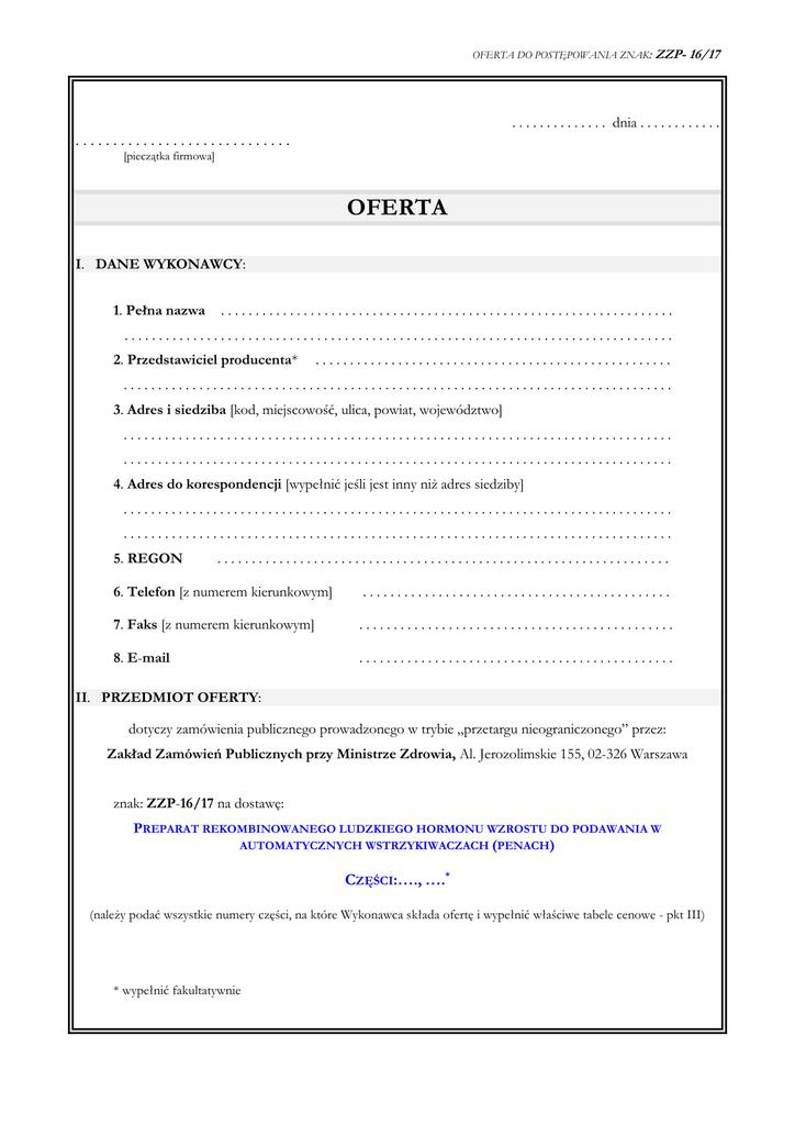 OFERTA DO POSTĘPOWANIA ZNAK: ZZP- 16/17 . . . . . . . . . . . . . . dnia . . . . . . . . . . . . ............................. [pieczątka firmowa] OFERTA I. DANE WYKONAWCY: 1. Pełna nazwa .................................................................. ................................................................................ 2. Przedstawiciel producenta* .................................................... ................................................................................ 3. Adres i siedziba [kod, miejscowość, ulica, powiat, województwo] ................................................................................ ................................................................................ 4. Adres do korespondencji [wypełnić jeśli jest inny niż adres siedziby] ................................................................................ ................................................................................ 5. REGON .................................................................. 6. Telefon [z numerem kierunkowym] ............................................. 7. Faks [z numerem kierunkowym] .............................................. 8. E-mail .............................................. II. PRZEDMIOT OFERTY: dotyczy zamówienia publicznego prowadzonego w trybie „przetargu nieograniczonego” przez: Zakład Zamówień Publicznych przy Ministrze Zdrowia, Al. Jerozolimskie 155, 02-326 Warszawa znak: ZZP-16/17 na dostawę: PREPARAT REKOMBINOWANEGO LUDZKIEGO HORMONU WZROSTU DO PODAWANIA W AUTOMATYCZNYCH WSTRZYKIWACZACH (PENACH) CZĘŚCI:…., ….* (należy podać wszystkie numery części, na które Wykonawca składa ofertę i wypełnić właściwe tabele cenowe - pkt III) * wypełnić fakultatywnie OFERTA DO POSTĘPOWANIA ZNAK: ZZP- 16/17 III. PODSTAWOWE INFORMACJE DOTYCZĄCE CENY OFERTY I KRYTERIÓW CZĘŚĆ 1 PREPARAT REKOMBINOWANEGO LUDZKIEGO HORMONU WZROSTU DO PODAWANIA W AUTOMATYCZNYCH WSTRZYKIWACZACH (PENACH) WKŁADY FIOLKA/AMPUŁKA PONIŻEJ (<7 MG) 1. Cena oferty Wartość wpisana w kolumnie 3 jest ceną ofertową braną pod uwagę przy porównaniu ofert: NAZWA PRZEDMIOTU ZAMÓWIENIA TYP I PRODUCENT LICZBA MG CENA CAŁKOWITA BRUTTO ZA CAŁOŚĆ PRZEDMIOTU ZAMÓWIENIA* 1 2 3 317 685 * cena brutto wyrażona do 2 miejsc po przecinku VAT: . . . . . . % Cena całkowita brutto – za całość przedmiotu zamówienia – zgodnie z kolumną Nr 3 – wynosi słownie: ....................................................................................................... Cena jednostkowa brutto za 1 mg przedmiotu wynosi: . . . . . . . . . . . . . . . . . . . . . . . . . . . . . . . . . . . . . . . . . . . . . . (dopuszcza się podanie ceny jednostkowej do czterech miejsc po przecinku) Wielkość opakowań (należy podać): ....................................................................................................... 2. Termin ważności przedmiotu zamówienia (waga w ocenie ofert : 40 pkt w łącznej punktacji) - zgodnie z rozdz. V ust. 4 SIWZ, w związku z rozdz. VI ust. 2 pkt 2.2. SIWZ (kryterium nr 2). Oferuję następujący termin ważności - min. _______ miesięcy od daty dostawy do bezpośredniego odbiorcy. CZĘŚĆ 2 PREPARAT REKOMBINOWANEGO LUDZKIEGO HORMONU WZROSTU DO PODAWANIA W AUTOMATYCZNYCH WSTRZYKIWACZACH (PENACH) CZĘŚĆ 2: WKŁADY FIOLKA/AMPUŁKA POWYŻEJ LUB RÓWNE (≥ 7 MG) 1. Cena oferty Wartość wpisana w kolumnie 3 jest ceną ofertową braną pod uwagę przy porównaniu ofert: NAZWA PRZEDMIOTU ZAMÓWIENIA TYP I PRODUCENT LICZBA MG CENA CAŁKOWITA BRUTTO ZA CAŁOŚĆ PRZEDMIOTU ZAMÓWIENIA* 1 2 3 788 770 * cena brutto wyrażona do 2 miejsc po przecinku VAT: . . . . . . % 2 OFERTA DO POSTĘPOWANIA ZNAK: ZZP- 16/17 Cena całkowita brutto – za całość przedmiotu zamówienia – zgodnie z kolumną Nr 3 – wynosi słownie: ....................................................................................................... Cena jednostkowa brutto za 1 mg przedmiotu wynosi: . . . . . . . . . . . . . . . . . . . . . . . . . . . . . . . . . . . . . . . . . . . . . . (dopuszcza się podanie ceny jednostkowej do czterech miejsc po przecinku) Wielkość opakowań (należy podać): ....................................................................................................... 2. Termin ważności przedmiotu zamówienia (waga w ocenie ofert : 40 pkt w łącznej punktacji) - zgodnie z rozdz. V ust. 4 SIWZ, w związku z rozdz. VI ust. 2 pkt 2.2. SIWZ (kryterium nr 2). Oferuję następujący termin ważności - min. _______ miesięcy od daty dostawy do bezpośredniego odbiorcy. IV. POTWIERDZENIE SPEŁNIENIA WYMOGÓW SIWZ DOTYCZĄCYCH PRZEDMIOTU ZAMÓWIENIA I OBOWIAZKÓW WYKONAWCY 1. Terminy, wielkość i warunki dostawy [Zgodnie z rozdziałem V pkt 1 i 3 Specyfikacji Istotnych Warunków Zamówienia]: Niniejszym potwierdzam i akceptuję terminy, wielkości i warunki dostaw określone w rozdz. V pkt 1 i 3 SIWZ. 2. Warunki płatności [Zgodnie z rozdziałem V pkt 5 SIWZ]: Niniejszym potwierdzam i akceptuję warunki płatności określone w rozdz. V pkt 5 SIWZ. 3. Sposób kalkulacji ceny [Zgodnie z rozdziałem V pkt 6 SIWZ]: Niniejszym potwierdzam sposób kalkulacji ceny przedmiotu zamówienia zgodnie z wymogami określonymi w rozdziale V pkt 6 SIWZ. 4. Obowiązki wykonawcy [Zgodnie z rozdziałem V pkt 7 SIWZ]: Niniejszym przyjmuję do wiadomości i wyrażam zgodę na obowiązki Wykonawcy zgodnie z wymogami określonymi w rozdziale V pkt 7 SIWZ. V. WPŁATA WADIUM [ Zgodnie z rozdziałem II Specyfikacji Istotnych Warunków Zamówienia ] CZĘŚCI:…., …., 1. Forma, w jakiej zostało wniesione wadium: . . . . . . . . . . . . . . . . . . . . . . . . . . . . . . . . . . . . . . . . . . . . . . . . . . . . . . . . . . . . . . . . . . . . . zał. nr ................. 2. Numer konta, na jakie Zamawiający dokonuje zwrotu wadium: ..................................................................................