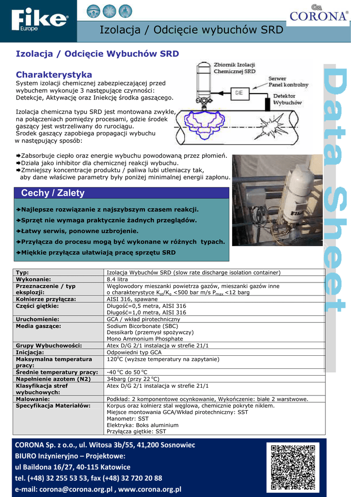 Izolacja / Odcięcie wybuchów SRD Izolacja / Odcięcie Wybuchów SRD Charakterystyka System izolacji chemicznej zabezpieczającej przed wybuchem wykonuje 3 następujące czynności: Detekcje, Aktywację oraz Iniekcję środka gaszącego. Izolacja chemiczna typu SRD jest montowana zwykle, na połączeniach pomiędzy procesami, gdzie środek gaszący jest wstrzeliwany do rurociągu. Środek gaszący zapobiega propagacji wybuchu w następujący sposób: Zabsorbuje ciepło oraz energie wybuchu powodowaną przez płomień. Działa jako inhibitor dla chemicznej reakcji wybuchu. Zmniejszy koncentracje produktu / paliwa lubi utleniaczy tak, aby dane właściwe parametry były poniżej minimalnej energii zapłonu. Cechy / Zalety Najlepsze rozwiązanie z najszybszym czasem reakcji. Sprzęt nie wymaga praktycznie żadnych przeglądów. Łatwy serwis, ponowne uzbrojenie. Przyłącza do procesu mogą być wykonane w różnych typach. Miękkie przyłącza ułatwiają pracę sprzętu SRD Typ: Wykonanie: Przeznaczenie / typ eksplozji: Kołnierze przyłącza: Części giętkie: Uruchomienie: Media gaszące: Grupy Wybuchowości: Inicjacja: Maksymalna temperatura pracy: Średnie temperatury pracy: Napełnienie azotem (N2) Klasyfikacja stref wybuchowych: Malowanie: Specyfikacja Materiałów: Izolacja Wybuchów SRD (slow rate discharge isolation container) 8.4 litra Węglowodory mieszanki powietrza gazów, mieszanki gazów inne o charakterystyce Kst/Kg <500 bar m/s Pmax <12 barg AISI 316, spawane Długość=0,5 metra, AISI 316 Długość=1,0 metra, AISI 316 GCA / wkład pirotechniczny Sodium Bicorbonate (SBC) Dessikarb (przemysł spożywczy) Mono Ammonium Phosphate Atex D/G 2/1 instalacja w strefie 21/1 Odpowiedni typ GCA 120oC (wyższe temperatury na zapytanie) -40 oC do 50 oC 34barg (przy 22 oC) Atex D/G 2/1 instalacja w strefie 21/1 Podkład: 2 komponentowe ocynkowanie, Wykończenie: białe 2 warstwowe. Korpus oraz kołnierz stal węglowa, chemicznie pokryte niklem. Miejsce montowania GCA/Wkład pirotechniczny: SST Manometr: SST Elektryka: Boks aluminium Przyłącza giętkie: SST Więcej szczegółów na stronie Corona Fike http://www.corona.org.pl / Wszystkie prawa zastrzeżone CORONA - FIKE