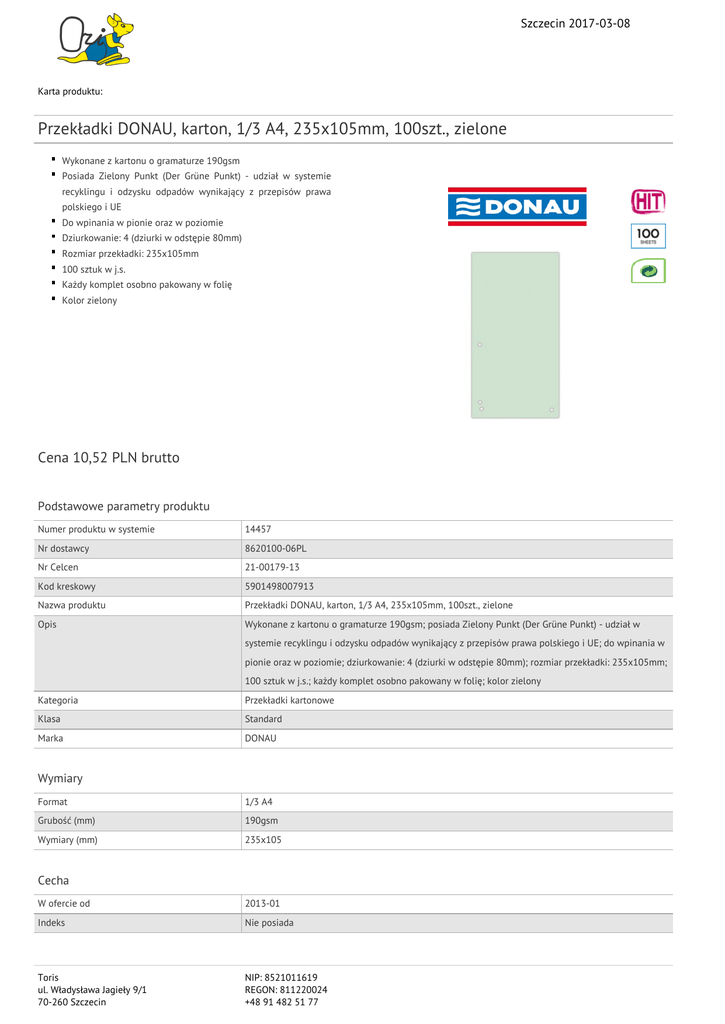 Szczecin 2017-03-08 Karta produktu: Przekładki DONAU, karton, 1/3 A4, 235x105mm, 100szt., zielone Wykonane z kartonu o gramaturze 190gsm Posiada Zielony Punkt (Der Grüne Punkt) - udział w systemie recyklingu i odzysku odpadów wynikający z przepisów prawa polskiego i UE Do wpinania w pionie oraz w poziomie Dziurkowanie: 4 (dziurki w odstępie 80mm) Rozmiar przekładki: 235x105mm 100 sztuk w j.s. Każdy komplet osobno pakowany w folię Kolor zielony Cena 10,52 PLN brutto Podstawowe parametry produktu Numer produktu w systemie 14457 Nr dostawcy 8620100-06PL Nr Celcen 21-00179-13 Kod kreskowy 5901498007913 Nazwa produktu Przekładki DONAU, karton, 1/3 A4, 235x105mm, 100szt., zielone Opis Wykonane z kartonu o gramaturze 190gsm; posiada Zielony Punkt (Der Grüne Punkt) - udział w systemie recyklingu i odzysku odpadów wynikający z przepisów prawa polskiego i UE; do wpinania w pionie oraz w poziomie; dziurkowanie: 4 (dziurki w odstępie 80mm); rozmiar przekładki: 235x105mm; 100 sztuk w j.s.; każdy komplet osobno pakowany w folię; kolor zielony Kategoria Przekładki kartonowe Klasa Standard Marka DONAU Wymiary Format 1/3 A4 Grubość (mm) 190gsm Wymiary (mm) 235x105 Cecha W ofercie od 2013-01 Indeks Nie posiada Toris ul. Władysława Jagieły 9/1 70-260 Szczecin NIP: 8521011619 REGON: 811220024 +48 91 482 51 77 Szczecin 2017-03-08 Karta katalogowa produktu cd. Przekładki DONAU, karton, 1/3 A4, 235x105mm, 100szt., zielone Typ 1/3A4 Rodzaj Bez karty opisowej Produkt Przekładka Materiał Karton Wspólny słownik zamówień CPV 30199600-6 Rozdzielniki na materiały piśmienne Certyfikaty Hit Hit Nowy produkt w ofercie Standard Ilość Ilość dziurek 4 Ilość kartek 100 Kolor Kolor Zielony Pozostałe zdjęcia produktu Serdecznie zapraszamy do współpracy Toris zespół. Toris ul. Władysława Jagieły 9/1 70-260 Szczecin NIP: 8521011619 REGON: 811220024 +48 91 482 51 77