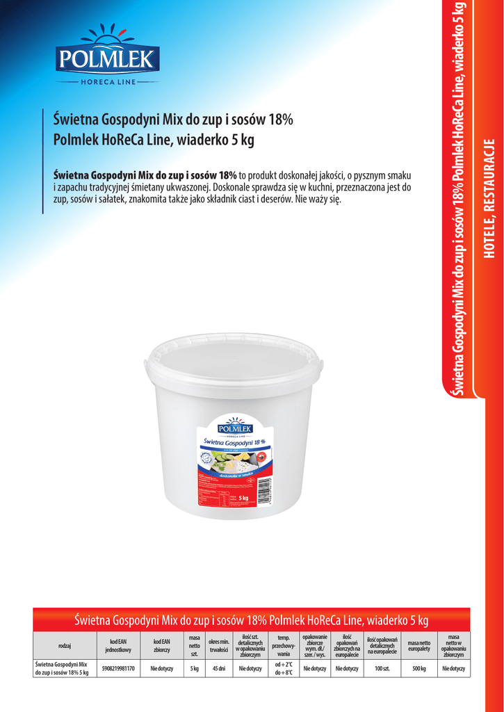 Świetna Gospodyni Mix do zup i sosów 18% to produkt doskonałej jakości, o pysznym smaku i zapachu tradycyjnej śmietany ukwaszonej. Doskonale sprawdza się w kuchni, przeznaczona jest do zup, sosów i sałatek, znakomita także jako składnik ciast i deserów. Nie waży się. Świetna Gospodyni Mix do zup i sosów 18% Polmlek HoReCa Line, wiaderko 5 kg rodzaj Świetna Gospodyni Mix do zup i sosów 18% 5 kg kod EAN jednostkowy kod EAN zbiorczy masa netto szt. 5908219981170 Nie dotyczy 5 kg ilość szt. okres min. detalicznych trwałości w opakowaniu zbiorczym 45 dni Nie dotyczy temp. przechowywania od + 2°C do + 8°C opakowanie ilość zbiorcze opakowań wym. dł./ zbiorczych na szer. / wys. europalecie Nie dotyczy Nie dotyczy ilość opakowań detalicznych na europalecie masa netto europalety masa netto w opakowaniu zbiorczym 100 szt. 500 kg Nie dotyczy HOTELE, RESTAURACJE Świetna Gospodyni Mix do zup i sosów 18% Polmlek HoReCa Line, wiaderko 5 kg Świetna Gospodyni Mix do zup i sosów 18% Polmlek HoReCa Line, wiaderko 5 kg
