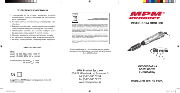 CZYSZCZENIE I KONSERWACJA 1. Lokosuszarka ta nie wymaga specjalnych czynności konserwujących. Wystarczy zastosować się do poniższych zasad użytkowania. 2. Nie wolno zakrywać otworów wylotu powietrza (kratka wentylacyjna). 3. Zawsze wyjmuj wtyczkę z gniazdka sieciowego po zakończeniu suszenia oraz przed rozpoczęciem czyszczenia. 4. Otwory wylotu powietrza oraz szczotki należy od czasu do czasu oczyścić z pozostałych na nich włosów. 5. Obudowę urządzenia można czyścić wilgotna szmatką. 6. Po zakończeniu suszenia poczekaj, aż lokosuszarka ostygnie. 7. Nie wolno zawijać przewodu zasilającego wokół urządzenia! DANE TECHNICZNE: MOC: Model: HB-809: 230V 50Hz 1000 W Model: HB-809A: 230V 50Hz 1000 W Poland Prawidłowe usuwanie produktu (zużyty sprzęt elektryczny i elektroniczny) Oznaczenie umieszczane na produkcie lub w odnoszących się do niego tekstach wskazują, że produktu po upływie okresu użytkowania nie należy usuwać z innymi odpadami pochodzącymi z gospodarstw domowych. Aby uniknąć szkodliwego wpływu na środowisko naturalne i zdrowie ludzi wskutek niekontrolowanego usuwania odpadów, prosimy o oddzielenie produktu od innego typu odpadów oraz odpowiedzialny recykling w celu promowania ponownego użycia zasobów materialnej jako stałej praktyki. INSTRUKCJA OBSŁUGI W celu uzyskania informacji na temat miejsca i sposobu bezpiecznego dla środowiska recyklingu tego produktu użytkownicy w gospodarstwach domowych powinni skontaktować się z punktem sprzedaży detalicznej, w którym dokonali zakupu produktu, lub z organem władz lokalnych. Użytkownicy w firmach powinni skontaktować się ze swoim dostawcą i sprawdzić warunki umowy zakupu. Produktu nie należy usuwać razem z innymi odpadami komercyjnymi. Życzymy zadowolenia z użytkowania naszego wyrobu i zapraszamy do skorzystania z szerokiej oferty handlowej firmy MPM Product Poziom hałasu: HB-809 LWA = 73dB HB-809A LWA= 73dB Uwaga!: Firma MPM Product zastrzega sobie możliwość zmian technicznych! HB809i809a.indd 1 MPM Product Sp. z o.o. 05-822 Milanówek, ul. Brzozowa 3 tel. (0-22) 380 52 34 fax (0-22) 380 52 72 www.mpmproduct.pl LOKOSUSZARKA DO WŁOSÓW Z JONIZACJĄ MODEL: HB-809 i HB-809/A 07-03-13 13:36 WSKAZÓWKI DOTYCZĄCE BEZPIECZEŃSTWA UŻYTKOWANIA: □ Przed użyciem przeczytaj dokładnie instrukcję obsługi. □ Urządzenie należy trzymać z daleka od wody! □ Nie wolno zanurzać urządzenia, przewodu i wtyczki w wodzie lub w innych płynach! □ Zachowaj szczególną ostrożność, gdy w pobliżu urządzenia znajdują się dzieci. □ Nie wieszaj przewodu na ostrych krawędziach i nie pozwól, aby stykał się z gorącymi powierzchniami. □ Nie wolno używać uszkodzonego urządzenia, również wtedy gdy uszkodzony jest przewód lub wtyczka - w takim wypadku oddaj urządzenie do naprawy w autoryzowanym punkcie serwisowym. □ Zawsze wyjmuj wtyczkę z gniazdka zaraz po skończeniu suszenia. □ Nie wolno używać lokosuszarki podczas kąpieli! □ Jeżeli urządzenie przypadkowo wpadnie do wody należy natychmiast wyjąć wtyczkę z gniazdka sieciowego! Niniejszy sprzęt nie jest przeznaczony do użytkowania przez osoby (w tym dzieci) o ograniczonej zdolności fizycznej, czuciowej lub psychicznej, lub osoby nie mające doświadczenia lub znajomości sprzętu, chyba że odbywa się to pod nadzorem lub zgodnie z instrukcją użytkowania sprzętu, przekazanej przez osoby odpowiadające za ich bezpieczeństwo. Należy zwracać uwagę na dzieci, aby nie bawiły się sprzętem/urządzeniem. OPIS URZĄDZENIA: 1. Włącznik / wyłącznik 2- stopniowa regulacja nadmuchu gorącego powietrza Nie wolno zakrywać otworów wylotu powietrza! W przeciwnym razie lokosuszarka wyłączy się automatycznie - należy wtedy wyłączyć ją, poczekać aż ostygnie, a następnie sprawdzić czy w otworach nie ma zanieczyszczeń. □ Gdy suszarka jest używana w łazience, po użyciu wyjąć wtyczkę z gniazdka, gdyż bliskość wody stanowi zagrożenie nawet wtedy, kiedy suszarka jest wyłączona. □ Do zapewnienia dodatkowej ochrony wskazane jest zainstalowanie w obwodzie elektrycznym, zasilającym łazienkę urządzenia różnicowoprądowego (RCD) o znamionowym prądzie różnicowym nie przekraczającym 30mA. W tym zakresie należy się zwrócić do specjalisty elektryka. □ Nie stosować urządzenia w pobliżu wanien, pryszniców, basenów i podobnych zbiorników z wodą. 2. Lokosuszarka wyposażona jest w dwustopniowy przełącznik nadmuchu gorącego powietrza. 3. Ustaw przełącznik w pozycji „1”, aby uzyskać łagodny nadmuch powietrza. 4. Ustaw przełącznik w pozycji „2”, aby uzyskać gorący nad- 3. Uchwyt do zawieszania much powietrza. 5. Aby uzyskać nadmuch zimnego powietrza wciśnij, przełącznik (CARE) a następnie przesuń go. (rys.4). 6. Zamocuj żądane akcesoria - szczotkę, lokówke lub nakładkę skupiająćą. 4. Przycisk ochładzania powietrza - CARE 5. Przycisk wymiany akcesoriów - PUSH 6. Lampka kontrolna jonizacji – pielęgnuje, wygładza włosy; System jonizacji nie powoduje elektryzowania c) 3 6 1 4 7. Przed rozpoczęciem układania włosów, należy je osuszyć w taki sposób, aby ich końcówki były lekko wilgotne. innych wrażliwych miejsc. □ Nigdy nie zostawiaj włączonego urządzenia bez nadzoru! Nie stawiaj urządzenia na gorących powierzchniach. Nie wolno zawijać przewodu zasilającego wokół urządzenia! Urządzenie przeznaczone jest tylko do użytku domowego. 1. Podłącz lokosuszarkę do źródła prądu, upewniając się najpierw czy włącznik ustawiony jest w pozycji „0”. 2. Obrotowy przewód □ Gorące powietrze nie może być kierowane w stronę oczu lub □ □ □ □ UŻYCIE LOKOSUSZARKI: 8. Aby uzyskać lepsze i trwalsze efekty można użyć lakieru 5 do włosów przed rozpoczęciem lokowania. 9. Gorący nadmuch powietrza umożliwi otrzymanie trwalszych, bardziej sprężystych loków. 2 HB-809 10. Średni czas lokowania w zależn