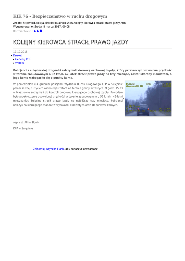 KIK 76 - Bezpieczeństwo w ruchu drogowym Źródło: http://brd.policja.pl/brd/aktualnosci/446,Kolejny-kierowca-stracil-prawo-jazdy.html Wygenerowano: Środa, 8 marca 2017, 00:08 Rozmiar tekstu: A A A KOLEJNY KIEROWCA STRACIŁ PRAWO JAZDY ■ 17.12.2015 Drukuj Generuj PDF Wstecz ■ ■ Policjanci z sulęcińskiej drogówki zatrzymali kierowcę osobowej toyoty, który przekroczył dozwoloną prędkość w terenie zabudowanym o 52 km/h. 42-latek stracił prawo jazdy na trzy miesiące, został ukarany mandatem, a jego konto wzbogaciło się o punkty karne. W poniedziałek /14 grudnia/ policjanci Wydziału Ruchu Drogowego KPP w Sulęcinie pełnili służbę z użyciem wideo rejestratora na terenie gminy Krzeszyce. O godz. 15.33 w Maszkowie zatrzymali do kontroli drogowej kierującego osobowej toyoty. Powodem było przekroczenie dozwolonej prędkości w terenie zabudowanym o 52 km/h. 42-letni mieszkaniec Sulęcina stracił prawo jazdy na najbliższe trzy miesiące. Policjanci nałożyli na kierującego mandat w wysokości 400 złotych oraz 10 punktów karnych. asp. szt. Alina Słonik KPP w Sulęcinie Zainstaluj wtyczkę Flash, aby zobaczyć odtwarzacz. ■ pobierz film - 1.82 MB Ocena tekstu: Tagi: Ocena: 0/5 (0) Poleć artykuł: Kategorie: