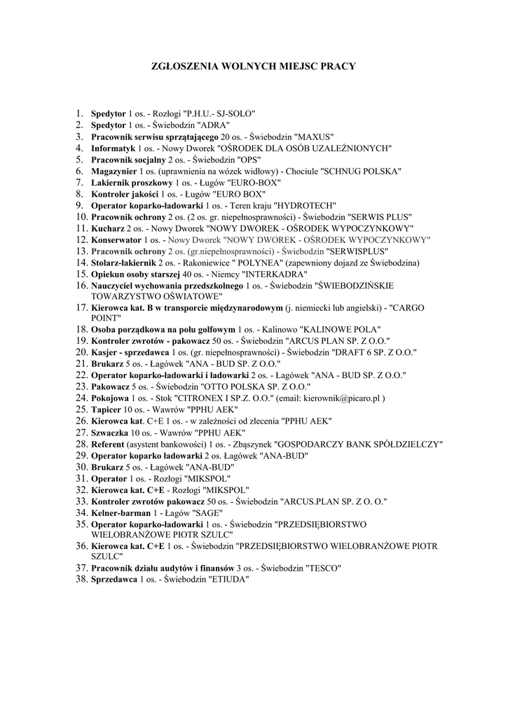 ZGŁOSZENIA WOLNYCH MIEJSC PRACY 1. Spedytor 1 os. - Rozłogi "P.H.U.- SJ-SOLO" 2. Spedytor 1 os. - Świebodzin "ADRA" 3. Pracownik serwisu sprzątającego 20 os. - Świebodzin "MAXUS" 4. Informatyk 1 os. - Nowy Dworek "OŚRODEK DLA OSÓB UZALEŻNIONYCH" 5. Pracownik socjalny 2 os. - Świebodzin "OPS" 6. Magazynier 1 os. (uprawnienia na wózek widłowy) - Chociule "SCHNUG POLSKA" 7. Lakiernik proszkowy 1 os. - Ługów "EURO-BOX" 8. Kontroler jakości 1 os. - Ługów "EURO BOX" 9. Operator koparko-ładowarki 1 os. - Teren kraju "HYDROTECH" 10. Pracownik ochrony 2 os. (2 os. gr. niepełnosprawności) - Świebodzin "SERWIS PLUS" 11. Kucharz 2 os. - Nowy Dworek "NOWY DWOREK - OŚRODEK WYPOCZYNKOWY" 12. Konserwator 1 os. - Nowy Dworek "NOWY DWOREK - OŚRODEK WYPOCZYNKOWY" 13. Pracownik ochrony 2 os. (gr.niepełnosprawności) - Świebodzin "SERWISPLUS" 14. Stolarz-lakiernik 2 os. - Rakoniewice " POLYNEA" (zapewniony dojazd ze Świebodzina) 15. Opiekun osoby starszej 40 os. - Niemcy "INTERKADRA" 16. Nauczyciel wychowania przedszkolnego 1 os. - Świebodzin "ŚWIEBODZIŃSKIE TOWARZYSTWO OŚWIATOWE" 17. Kierowca kat. B w transporcie międzynarodowym (j. niemiecki lub angielski) - "CARGO POINT" 18. Osoba porządkowa na polu golfowym 1 os. - Kalinowo "KALINOWE POLA" 19. Kontroler zwrotów - pakowacz 50 os. - Świebodzin "ARCUS PLAN SP. Z O.O." 20. Kasjer - sprzedawca 1 os. (gr. niepełnosprawności) - Świebodzin "DRAFT 6 SP. Z O.O." 21. Brukarz 5 os. - Łagówek "ANA - BUD SP. Z O.O." 22. Operator koparko-ładowarki i ładowarki 2 os. - Łagówek "ANA - BUD SP. Z O.O." 23. Pakowacz 5 os. - Świebodzin "OTTO POLSKA SP. Z O.O." 24. Pokojowa 1 os. - Stok "CITRONEX I SP.Z. O.O." (email: [email protected] ) 25. Tapicer 10 os. - Wawrów "PPHU AEK" 26. Kierowca kat. C+E 1 os. - w zależności od zlecenia "PPHU AEK" 27. Szwaczka 10 os. - Wawrów "PPHU AEK" 28. Referent (asystent bankowości) 1 os. - Zbąszynek "GOSPODARCZY BANK SPÓŁDZIELCZY" 29. Operator koparko ładowarki 2 os. Łagówek "ANA-BUD" 30. Brukarz 5 os. - Łagówek "ANA-BUD" 31. Operator 1 os. - Rozłogi "MIKSPOL" 32. Kierowca kat. C+E - Rozłogi "MIKSPOL" 33. Kontroler zwrotów pakowacz 50 os. - Świebodzin "ARCUS.PLAN SP. Z O. O." 34. Kelner-barman 1 - Łagów "SAGE" 35. Operator koparko-ładowarki 1 os. - Świebodzin "PRZEDSIĘBIORSTWO WIELOBRANŻOWE PIOTR SZULC" 36. Kierowca kat. C+E 1 os. - Świebodzin "PRZEDSIĘBIORSTWO WIELOBRANŻOWE PIOTR SZULC" 37. Pracownik działu audytów i finansów 3 os. - Świebodzin "TESCO" 38. Sprzedawca 1 os. - Świebodzin "ETIUDA"