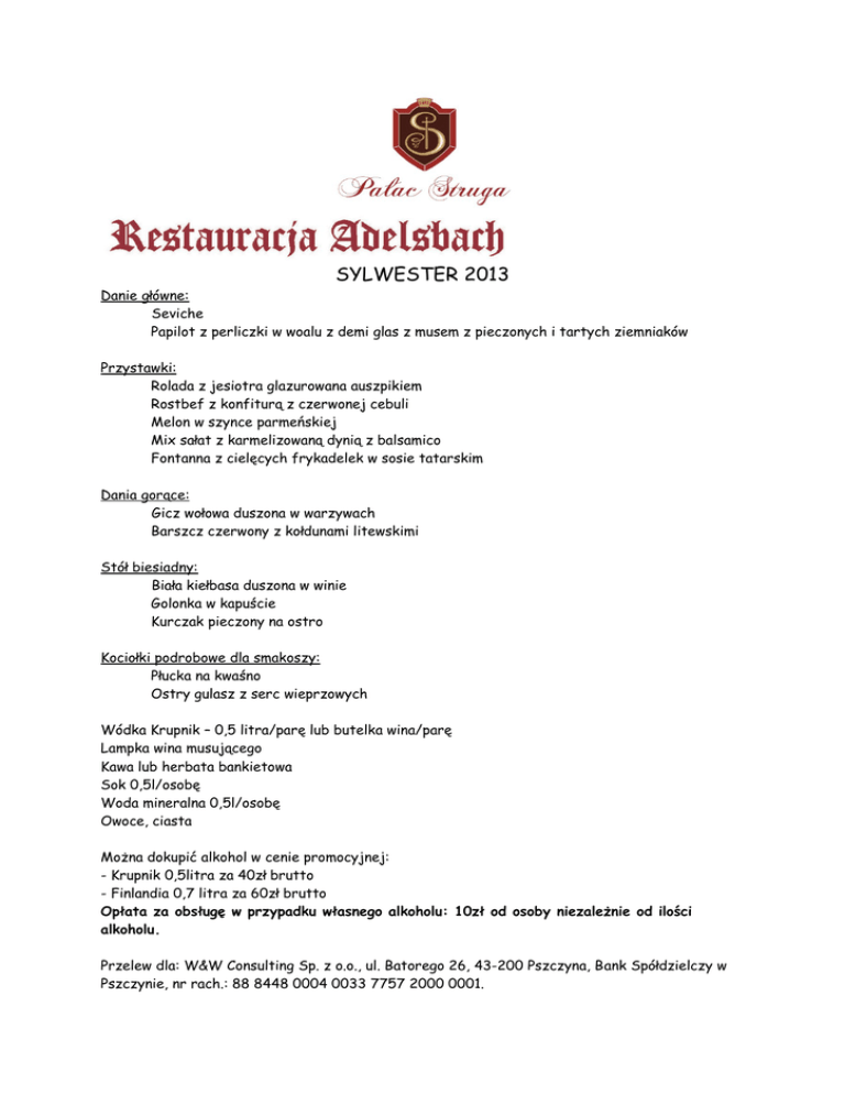 SYLWESTER 2013 Danie główne: Seviche Papilot z perliczki w woalu z demi glas z musem z pieczonych i tartych ziemniaków Przystawki: Rolada z jesiotra glazurowana auszpikiem Rostbef z konfiturą z czerwonej cebuli Melon w szynce parmeńskiej Mix sałat z karmelizowaną dynią z balsamico Fontanna z cielęcych frykadelek w sosie tatarskim Dania gorące: Gicz wołowa duszona w warzywach Barszcz czerwony z kołdunami litewskimi Stół biesiadny: Biała kiełbasa duszona w winie Golonka w kapuście Kurczak pieczony na ostro Kociołki podrobowe dla smakoszy: Płucka na kwaśno Ostry gulasz z serc wieprzowych Wódka Krupnik – 0,5 litra/parę lub butelka wina/parę Lampka wina musującego Kawa lub herbata bankietowa Sok 0,5l/osobę Woda mineralna 0,5l/osobę Owoce, ciasta Można dokupić alkohol w cenie promocyjnej: - Krupnik 0,5litra za 40zł brutto - Finlandia 0,7 litra za 60zł brutto Opłata za obsługę w przypadku własnego alkoholu: 10zł od osoby niezależnie od ilości alkoholu. Przelew dla: W&W Consulting Sp. z o.o., ul. Batorego 26, 43-200 Pszczyna, Bank Spółdzielczy w Pszczynie, nr rach.: 88 8448 0004 0033 7757 2000 0001.