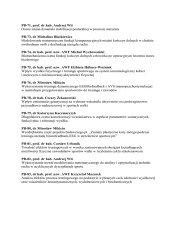 PB-71, prof. dr hab. Andrzej Wit Ocena zmian dynamiki stabilizacji posturalnej w procesie starzenia PB-73, dr Michalina BłaŜkiewicz Modelowanie matematyczne funkcji kompensacyjnych mięśni kończyn dolnych w chodzie swobodnym osób z dysfunkcją narządu ruchu PB-74, dr hab. prof. nzw. AWF Michał Wychowański Biomechaniczna ocena funkcji kończyn dolnych człowieka po operacyjnym leczeniu stawu biodrowego PB-75, dr hab. prof. nzw. AWF ElŜbieta Hőbner-Woźniak Wpływ wysiłku fizycznego i treningu sportowego na system immunologiczny kobiet i męŜczyzn o zróŜnicowanej aktywności fizycznej PB-76, dr Mirosław Mikicin Wykorzystanie treningu dynamicznego EEGBiofeedback i AVS (nauropsychostymulacja) w mentalnym przygotowaniu sportowców do treningu i zawodów PB-78, dr hab. Cezary śekanowski Wpływ zmienności genetycznej na wybrane wskaźniki aktywności osi podwzgórzowoprzysadkowo-nadnerczowej w sportach walki PB-79, dr Katarzyna Kaczmarczyk Długofalowa ocena konsekwencji wcześniactwa w aspekcie parametrów somatycznych, funkcji płuc i tolerancji wysiłku PB-80, dr Mirosław Mikicin Wyodrębniona część projektu badawczego pt. „Zmiany plastyczne kory mózgu podczas treningu metodą Neurofeedback-EEG w strzelectwie sportowym” PB-81, prof. dr hab. Czesław Urbanik Trwałość efektów treningowych w wyniku zastosowanych obciąŜeń kształtujących moŜliwości fizyczne zawodników sportów walki w trzyletnim cyklu szkoleniowym PB-82, prof. dr hab. Andrzej Wit Wykorzystanie metod modelowania matematycznego do analizy i optymalizacji techniki ruchu w acyklicznych dyscyplinach sportu PB-83, dr hab. prof. nzw. AWF Krzysztof Mazurek Analiza efektów procesu treningowego na podstawie wybranych cech zdolności wysiłkowej oraz wskaźników hemodynamicznych, wydolnościowych i biochemicznych