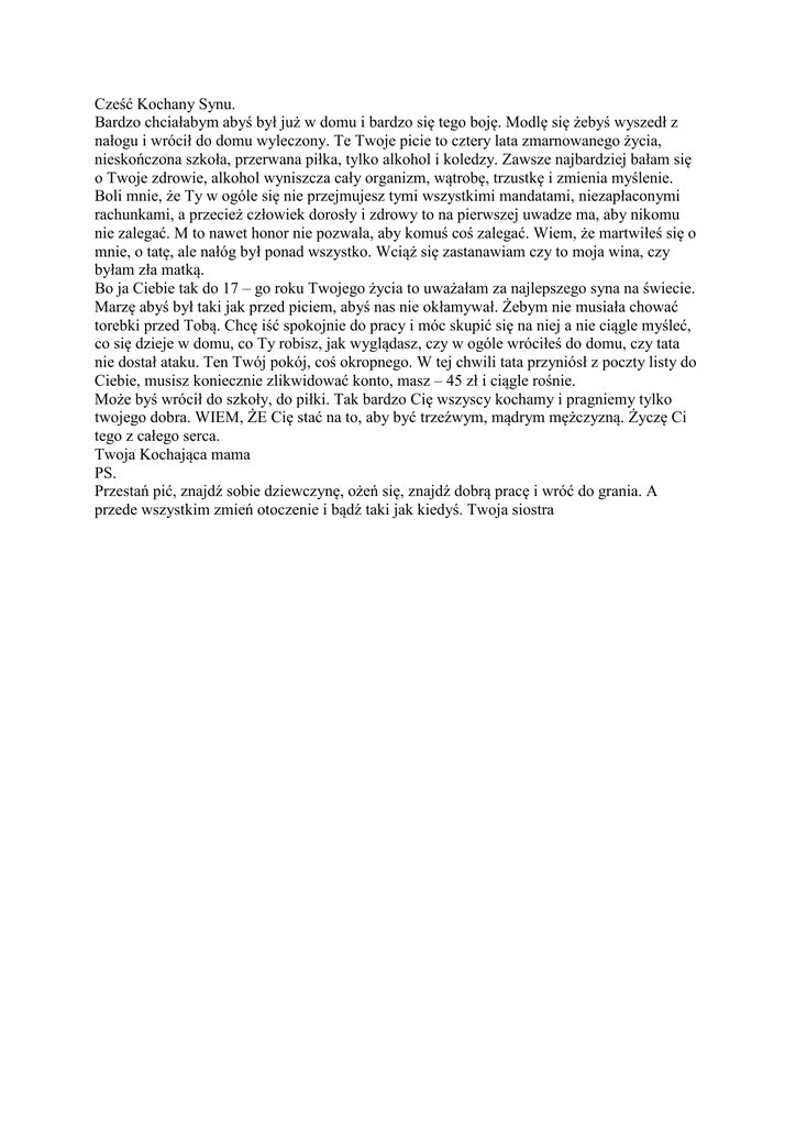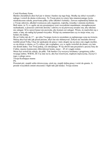 Cześć Kochany Synu. Bardzo chciałabym abyś był już w domu i bardzo się tego boję. Modlę się żebyś wyszedł z nałogu i wrócił do domu wyleczony. Te Twoje picie to cztery lata zmarnowanego życia, nieskończona szkoła, przerwana piłka, tylko alkohol i koledzy. Zawsze najbardziej bałam się o Twoje zdrowie, alkohol wyniszcza cały organizm, wątrobę, trzustkę i zmienia myślenie. Boli mnie, że Ty w ogóle się nie przejmujesz tymi wszystkimi mandatami, niezapłaconymi rachunkami, a przecież człowiek dorosły i zdrowy to na pierwszej uwadze ma, aby nikomu nie zalegać. M to nawet honor nie pozwala, aby komuś coś zalegać. Wiem, że martwiłeś się o mnie, o tatę, ale nałóg był ponad wszystko. Wciąż się zastanawiam czy to moja wina, czy byłam zła matką. Bo ja Ciebie tak do 17 – go roku Twojego życia to uważałam za najlepszego syna na świecie. Marzę abyś był taki jak przed piciem, abyś nas nie okłamywał. Żebym nie musiała chować torebki przed Tobą. Chcę iść spokojnie do pracy i móc skupić się na niej a nie ciągle myśleć, co się dzieje w domu, co Ty robisz, jak wyglądasz, czy w ogóle wróciłeś do domu, czy tata nie dostał ataku. Ten Twój pokój, coś okropnego. W tej chwili tata przyniósł z poczty listy do Ciebie, musisz koniecznie zlikwidować konto, masz – 45 zł i ciągle rośnie. Może byś wrócił do szkoły, do piłki. Tak bardzo Cię wszyscy kochamy i pragniemy tylko twojego dobra. WIEM, ŻE Cię stać na to, aby być trzeźwym, mądrym mężczyzną. Życzę Ci tego z całego serca. Twoja Kochająca mama PS. Przestań pić, znajdź sobie dziewczynę, ożeń się, znajdź dobrą pracę i wróć do grania. A przede wszystkim zmień otoczenie i bądź taki jak kiedyś. Twoja siostra