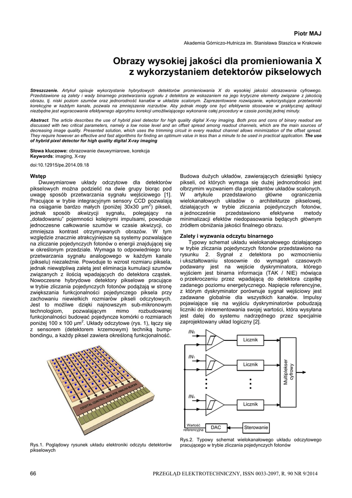 Piotr MAJ Akademia Górniczo-Hutnicza im. Stanisława Staszica w Krakowie Obrazy wysokiej jakości dla promieniowania X z wykorzystaniem detektorów pikselowych Streszczenie. Artykuł opisuje wykorzystanie hybrydowych detektorów promieniowania X do wysokiej jakości obrazowania cyfrowego. Przedstawione są zalety i wady binarnego przetwarzania sygnału z detektora ze wskazaniem na jego krytyczne elementy związane z jakością obrazu, tj. niski poziom szumów oraz jednorodność kanałów w układzie scalonym. Zaprezentowane rozwiązanie, wykorzystujące przetworniki korekcyjne w każdym kanale, pozwala na zmniejszenie rozrzutów. Aby jednak mogły one być efektywnie stosowane w praktycznej aplikacji niezbędne jest wypracowanie efektywnego algorytmu korekcji umożliwiającego wykonanie całej procedury w czasie poniżej jednej minuty. Abstract. The article describes the use of hybrid pixel detector for high quality digital X-ray imaging. Both pros and cons of binary readout are discussed with two critical parameters, namely a low noise level and an offset spread among readout channels, which are the main sources of decreasing image quality. Presented solution, which uses the trimming circuit in every readout channel allows minimization of the offset spread. They require however an effective and fast algorithms for finding an optimum value in less than a minute to be used in practical application. The use of hybrid pixel detector for high quality digital X-ray imaging Słowa kluczowe: obrazowanie dwuwymiarowe, korekcja Keywords: imaging, X-ray doi:10.12915/pe.2014.09.18 Budowa dużych układów, zawierających dziesiątki tysięcy pikseli, od których wymaga się dużej jednorodności jest olbrzymim wyzwaniem dla projektantów układów scalonych. W artykule przedstawiono główne ograniczenia wielokanałowych układów o architekturze pikselowej, działających w trybie zliczania pojedynczych fotonów, a jednocześnie przedstawiono efektywne metody minimalizacji efektów niedopasowania będących głównym źródłem obniżania jakości finalnego obrazu. Zalety i wyzwania odczytu binarnego Typowy schemat układu wielokanałowego działającego w trybie zliczania pojedynczych fotonów przedstawiono na rysunku 2. Sygnał z detektora po wzmocnieniu i ukształtowaniu stosownie do wymagań czasowych podawany jest na wejście dyskryminatora, którego wyjściem jest binarna informacja (TAK / NIE) mówiąca o przekroczeniu przez wpadającą do detektora cząstkę zadanego poziomu energetycznego. Napięcie referencyjne, z którym dyskryminator porównuje sygnał wejściowy jest zadawane globalnie dla wszystkich kanałów. Impulsy pojawiające się na wyjściu dyskryminatorów pobudzają liczniki do inkrementowania swojej wartości, która wysyłana jest dalej do systemu nadrzędnego przez specjalnie zaprojektowany układ logiczny [2]. IN0 Licznik IN1 ... ... Licznik Multiplekser cyfrowy Wstęp Dwuwymiarowe układy odczytowe dla detektorów pikselowych można podzielić na dwie grupy biorąc pod uwagę sposób przetwarzania sygnału wejściowego [1]. Pracujące w trybie integracyjnym sensory CCD pozwalają na osiąganie bardzo małych (poniżej 30x30 µm2) pikseli, jednak sposób akwizycji sygnału, polegający na „doładowaniu” pojemności kolejnymi impulsami, powoduje jednoczesne całkowanie szumów w czasie akwizycji, co zmniejsza kontrast otrzymywanych obrazów. W tym względzie znacznie atrakcyjniejsze są systemy pozwalające na zliczanie pojedynczych fotonów o energii znajdującej się w określonym przedziale. Wymaga to odpowiedniego toru przetwarzania sygnału analogowego w każdym kanale (pikselu) niezależnie. Powoduje to wzrost rozmiaru piksela, jednak niewątpliwą zaletą jest eliminacja kumulacji szumów związanych z ilością wpadających do detektora cząstek. Nowoczesne hybrydowe detektory pikselowe pracujące w trybie zliczania pojedynczych fotonów podążają w stronę zwiększania funkcjonalności pojedynczego piksela przy zachowaniu niewielkich rozmiarów pikseli odczytowych. Jest to możliwe dzięki najnowszym sub-mikronowym technologiom, pozwalającym mimo rozbudowanej funkcjonalności budować pojedyncze komórki o rozmiarach 2 poniżej 100 x 100 µm . Układy odczytowe (rys. 1), łączy się z sensorem (detektorem krzemowym) techniką bumpbondingu, a każdy piksel zawiera określoną funkcjonalność. INn Licznik Wartość referencyjna Rys.1. Poglądowy rysunek układu elektroniki odczytu detektorów pikselowych 66 DAC Sterowanie Rys.2. Typowy schemat wielokanałowego układu odczytowego pracującego w trybie zliczania pojedynczych fotonów PRZEGLĄD ELEKTROTECHNICZNY, ISSN 0033-2097, R. 90 NR 9/2014 Architektura binarna systemu odczytowego pozwala na asynchroniczne przetwarzanie i zliczanie impulsów uwzględniając przy tym informację o ich amplitudzie (przy zastosowaniu dwóch niezależnie pracujących dyskryminatorów). Ceną jest tutaj duża wrażliwość na szumy toru elektroniki oraz na rozrzut offsetów na wejściach dyskryminatorów. Problem zobrazowano na rysunku 3, który przedstawia tzw. różniczkowy rozkład amplitudowy impulsów otrzymany przez pomiar widma całkowego (tj. pomiar liczby wpadających do detektora impulsów w zależności od zadanego napięcia referencyjnego) i poddanie go operacji różniczkowania. Jeżeli w układzie wielokanałowym o architekturze binarnej szumy są za wysokie lub, gdy za duży jest rozrzut napięć niezrównoważenia dyskryminatorów, to ustawienie wspólnego progu dyskryminacji dla wszystkich kanałów przy pracy z niewielką amplitudą impulsów wejściowych jest po prostu niemożliwe [3]. dN / dVth 4k szumy 3k niewielka) można dokonać poprzez zastosowanie korekcyjnych przetworników cyfrowo-analogowych, które we współczesnych technologiach sub-mikronowych zajmują niewielką powierzchnię. Ideę schematycznie przedstawia rysunek 4, gdzie na wejściu każdego z dyskryminatorów znajduje się n-bitowy, ni