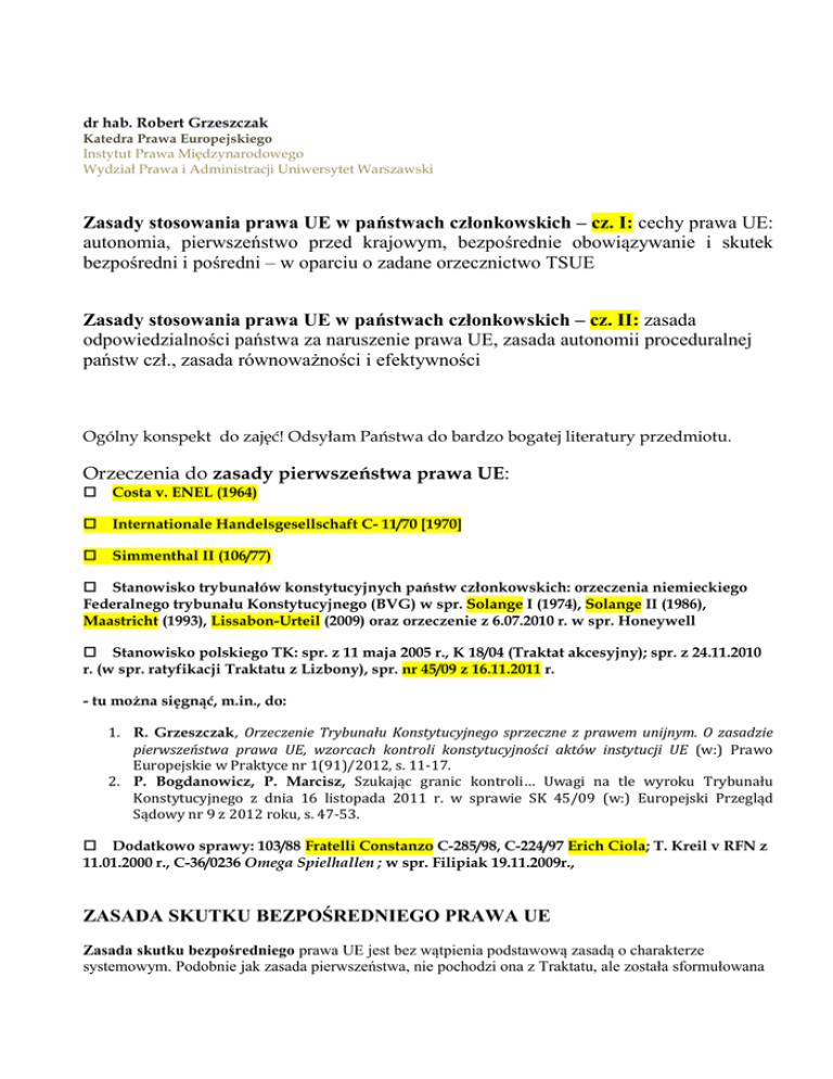 dr hab. Robert Grzeszczak Katedra Prawa Europejskiego Instytut Prawa Międzynarodowego Wydział Prawa i Administracji Uniwersytet Warszawski Zasady stosowania prawa UE w państwach członkowskich – cz. I: cechy prawa UE: autonomia, pierwszeństwo przed krajowym, bezpośrednie obowiązywanie i skutek bezpośredni i pośredni – w oparciu o zadane orzecznictwo TSUE Zasady stosowania prawa UE w państwach członkowskich – cz. II: zasada odpowiedzialności państwa za naruszenie prawa UE, zasada autonomii proceduralnej państw czł., zasada równoważności i efektywności Ogólny konspekt do zajęć! Odsyłam Państwa do bardzo bogatej literatury przedmiotu. Orzeczenia do zasady pierwszeństwa prawa UE: Costa v. ENEL (1964) Internationale Handelsgesellschaft C- 11/70 [1970] Simmenthal II (106/77) Stanowisko trybunałów konstytucyjnych państw członkowskich: orzeczenia niemieckiego Federalnego trybunału Konstytucyjnego (BVG) w spr. Solange I (1974), Solange II (1986), Maastricht (1993), Lissabon-Urteil (2009) oraz orzeczenie z 6.07.2010 r. w spr. Honeywell Stanowisko polskiego TK: spr. z 11 maja 2005 r., K 18/04 (Traktat akcesyjny); spr. z 24.11.2010 r. (w spr. ratyfikacji Traktatu z Lizbony), spr. nr 45/09 z 16.11.2011 r. - tu można sięgnąć, m.in., do: 1. R. Grzeszczak, Orzeczenie Trybunału Konstytucyjnego sprzeczne z prawem unijnym. O zasadzie pierwszeństwa prawa UE, wzorcach kontroli konstytucyjności aktów instytucji UE (w:) Prawo Europejskie w Praktyce nr 1(91)/2012, s. 11-17. 2. P. Bogdanowicz, P. Marcisz, Szukając granic kontroli… Uwagi na tle wyroku Trybunału Konstytucyjnego z dnia 16 listopada 2011 r. w sprawie SK 45/09 (w:) Europejski Przegląd Sądowy nr 9 z 2012 roku, s. 47-53. Dodatkowo sprawy: 103/88 Fratelli Constanzo C-285/98, C-224/97 Erich Ciola; T. Kreil v RFN z 11.01.2000 r., C-36/0236 Omega Spielhallen ; w spr. Filipiak 19.11.2009r., ZASADA SKUTKU BEZPOŚREDNIEGO PRAWA UE Zasada skutku bezpośredniego prawa UE jest bez wątpienia podstawową zasadą o charakterze systemowym. Podobnie jak zasada pierwszeństwa, nie pochodzi ona z Traktatu, ale została sformułowana w orzecznictwie Trybunału Sprawiedliwości, będąc jednym z bardziej spektakularnych przykładów wykładni celowościowej stosowanej przez TS, której wyrazem jest zwłaszcza odwołanie explicite do „ducha Traktatu”. …. cd – por. podręcznik Sprawa 26/62 Van Gend en Loos v. Nederlandse Administratie der Belastingen ▪ Warunki bezpośredniej skuteczności przepisów wspólnotowych: - przepis powinien być jasny - precyzyjny - bezwarunkowy ▪ Wyróżniamy skutek bezpośredni wertykalny, tj. możliwość powoływania się na dane przepisy wobec państwa oraz skutek bezpośredni horyzontalny, tj. możliwość powoływania się na dane przepisy wobec innych jednostek. ▪ Skutek bezpośredni norm traktatowych: - wertykalny - sprawa 26/62 Van Gend en Loos - horyzontalny – sprawa 43/75 Defrenne v. Sabena ▪ Skutek bezpośredni rozporządzeń Sprawa 34/73 Fratelli Variola v. Amministrazione Italiana delle Finanze ▪ Skutek bezpośredni dyrektyw Sprawa 41/74 Van Duyn v. Home Office Sprawa 152/84 Marshall v. Southampton and South West Hampshire Area Health Authority -91/92 Faccini Dori v. Recreb Srl sprawa C-188/89 Foster v. British Gas Kwestia bezpośredniego skutku dyrektyw jest od dawna przedmiotem kontrowersji. Początkowo negowano możliwość powoływania się jednostek na dyrektywy, ponieważ są one zawsze skierowane do państw członkowskich i wymagają implementacji do prawa krajowego. Jeśli więc państwo w wyznaczonym czasie dokona implementacji, w krajowym porządku prawnym stosowane są przepisy krajowe wydane w celu transpozycji dyrektyw. Problem powstaje wówczas, gdy dyrektywa nie jest implementowana lub jest implementowana nieprawidłowo. W swoich rozważaniach ETS podniósł przede wszystkim argument, iż państwo członkowskie nie może wyciągać korzyści z własnego bezprawnego zachowania (ex injuria non oritur ius). …. cd – por. podręcznik Podsumowanie skutku bezp. Dyrektyw „via orzecznictwo”: skutek bezpośredni nie wprowadzonej w terminie dyrektywy (spr. 148/78 Ratti): pionowy – tak (pojedyncze postanowienia mogą tworzyć dla obywateli prawa wobec państwa, jeżeli są: jasne, bezwarunkowe; ale nie mogą tworzyć obowiązków – spr. 80/86 Kolpinghuis Nijmegen) – effet utile oraz sankcja z tytułu niewypełnienia zobowiązań wynikających z prawa UE (odpowiedzialność odszkodowawcza państwa – spr. C-6 i 9/90 Francovich – gdy dyrektywa nie może być stosowana bezpośrednio), poziomy – nie (spr. 152/84 Marshall I), ale obowiązek interpretacji obowiązujących przepisów zgodnie z brzmieniem i celem dyrektywy (spr. 79/83 Harz) - pośredni skutek dyrektyw dla osób trzecich; odpowiedzialność odszkodowawcza państwa, gdy osoba prywatna nie może się powołać na dyrektywę wobec innej osoby – spr. 91/92 Faccini Dori) ▪ Skutek bezpośredni decyzji Sprawa 9/70 Franz Grad p. Finanzamt Traunstein 3. ZASADA SKUTKU POŚREDNIEGO PRAWA UE (OBOWIĄZEK PROUNIJNEJ WYKŁADNI PRAWA KRAJOWEGO) ▪ Skutek pośredni przepisów UE Von Colson v. Land Nordhein Westfalen -106/89 Marleasing Sformułowanie zasady skutku pośredniego było początkowo sposobem na wzmocnienie ochrony prawnej jednostek, osłabionej z powodu braku bezpośredniej skuteczności dyrektyw lub ich nieprawidłowej implementacji. …. cd – por. podręcznik OBOWIĄZEK PRO-unijnej WYKŁADNI PRAWA KRAJOWEGO tzw. ZASADA SKUTKU POŚREDNIEGO PRAWA unijnego Uzasadniając obowiązek pro-unijnej wykładni prawa krajowego, ETS odwołał się do zasady solidarności (lojalności) z art. 4 ust. 3 TUE, zgodnie z która państwa członkowskie zobowiązane są solidarnie wykonywać zobowiązania wynikające z prawa unijnego oraz do konieczności zapewnienia skuteczności tego prawa w krajowym porządku prawnym. W którym orzeczeniu dokonał TSUE ww. wykładni????? Sprawa 14/83 Von Colson p. L