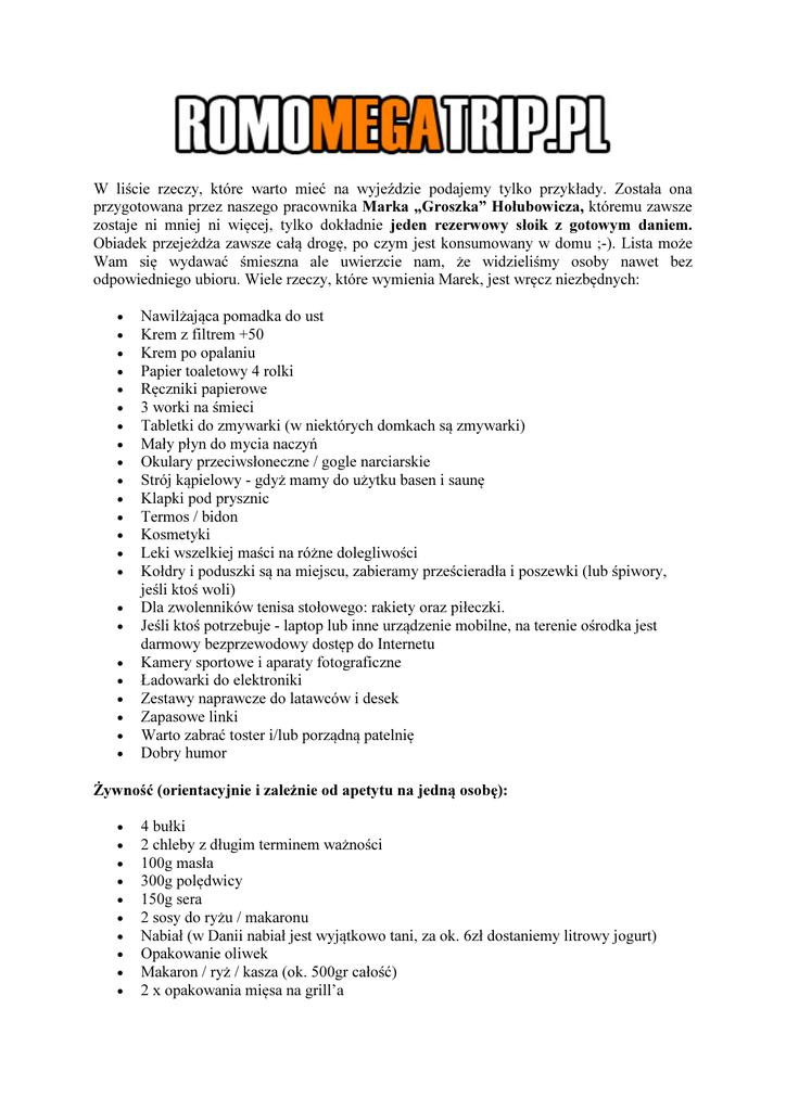 W liście rzeczy, które warto mieć na wyjeździe podajemy tylko przykłady. Została ona przygotowana przez naszego pracownika Marka „Groszka” Hołubowicza, któremu zawsze zostaje ni mniej ni więcej, tylko dokładnie jeden rezerwowy słoik z gotowym daniem. Obiadek przejeżdża zawsze całą drogę, po czym jest konsumowany w domu ;-). Lista może Wam się wydawać śmieszna ale uwierzcie nam, że widzieliśmy osoby nawet bez odpowiedniego ubioru. Wiele rzeczy, które wymienia Marek, jest wręcz niezbędnych: • • • • • • • • • • • • • • • • • • • • • • • Nawilżająca pomadka do ust Krem z filtrem +50 Krem po opalaniu Papier toaletowy 4 rolki Ręczniki papierowe 3 worki na śmieci Tabletki do zmywarki (w niektórych domkach są zmywarki) Mały płyn do mycia naczyń Okulary przeciwsłoneczne / gogle narciarskie Strój kąpielowy - gdyż mamy do użytku basen i saunę Klapki pod prysznic Termos / bidon Kosmetyki Leki wszelkiej maści na różne dolegliwości Kołdry i poduszki są na miejscu, zabieramy prześcieradła i poszewki (lub śpiwory, jeśli ktoś woli) Dla zwolenników tenisa stołowego: rakiety oraz piłeczki. Jeśli ktoś potrzebuje - laptop lub inne urządzenie mobilne, na terenie ośrodka jest darmowy bezprzewodowy dostęp do Internetu Kamery sportowe i aparaty fotograficzne Ładowarki do elektroniki Zestawy naprawcze do latawców i desek Zapasowe linki Warto zabrać toster i/lub porządną patelnię Dobry humor Żywność (orientacyjnie i zależnie od apetytu na jedną osobę): • • • • • • • • • • 4 bułki 2 chleby z długim terminem ważności 100g masła 300g polędwicy 150g sera 2 sosy do ryżu / makaronu Nabiał (w Danii nabiał jest wyjątkowo tani, za ok. 6zł dostaniemy litrowy jogurt) Opakowanie oliwek Makaron / ryż / kasza (ok. 500gr całość) 2 x opakowania mięsa na grill’a • • • • • • • 2 x opakowania drobiu Słodycze Gorące kubki 2 cebule Kawa, herbata, cukier Ewentualnie przyprawy, olej do smażenia Opcjonalnie napoje wyskokowe Opcja awaryjna: • • • 2 słoiki z gotowym daniem Konserwa Zupka chińska Dla grilowiczów (na 2 osoby): • • • • Węgiel ok. 4kg Podpałka Folia aluminiowa Ketchup / musztarda Grille są w większości domków, zwykle gdy grillujemy robimy to „integracyjnie”. Bardzo przydatna jest lodówka samochodowa do transportu żywności z Polski. W razie jej braku polecamy torby termiczne z wkładami chłodzącymi. Oczywiście w domkach są lodówki, lecz ich pojemność (ok. 100 litrów) to połowa standardowej lodówki do której jesteśmy przyzwyczajeni – a musimy się nią podzielić na 6 osób.