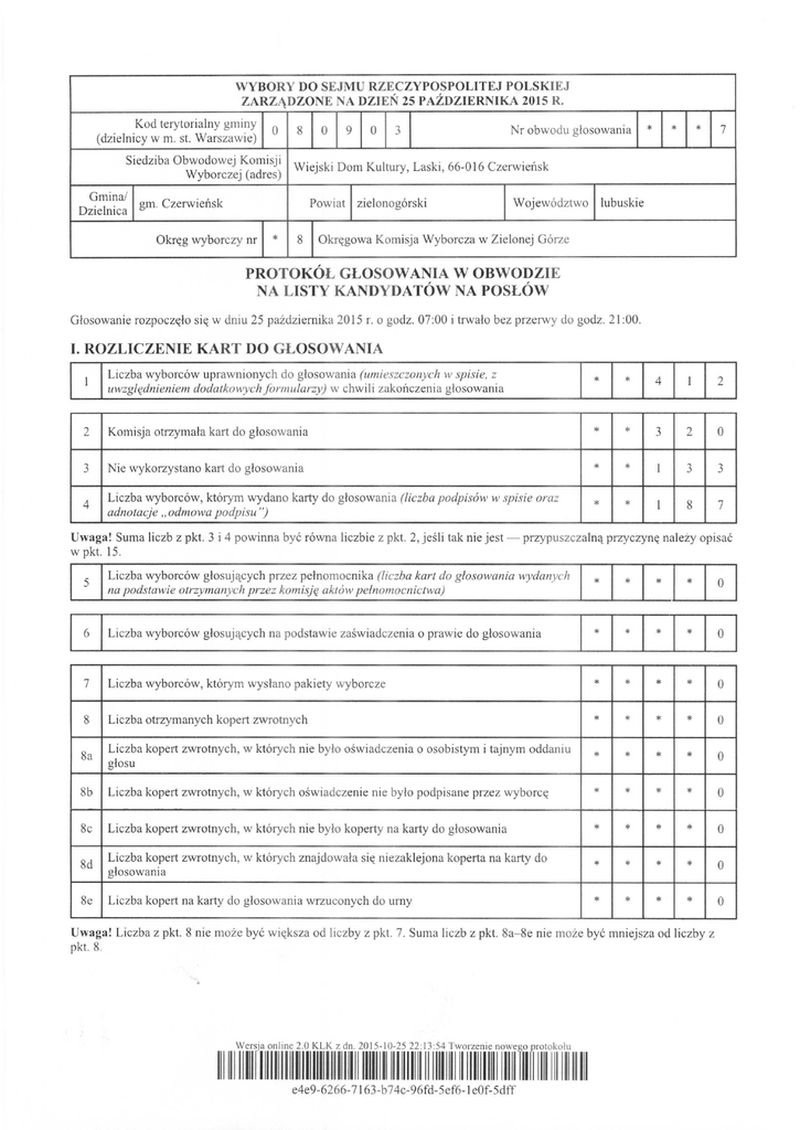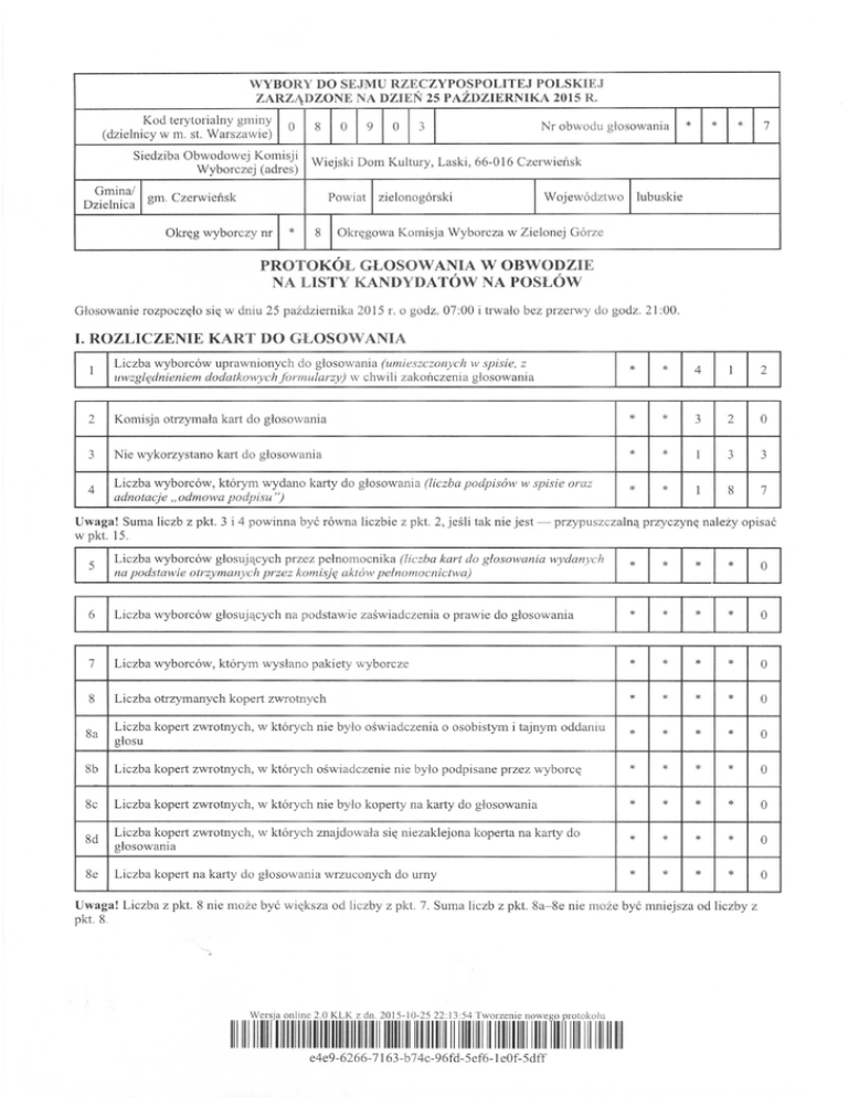 G1osowanie rozpocz~lo si~ w dniu 25 pazdziernika 2015 r. 0 godz. 07:00 i trwalo bez przerwy do godz. 21 :00.