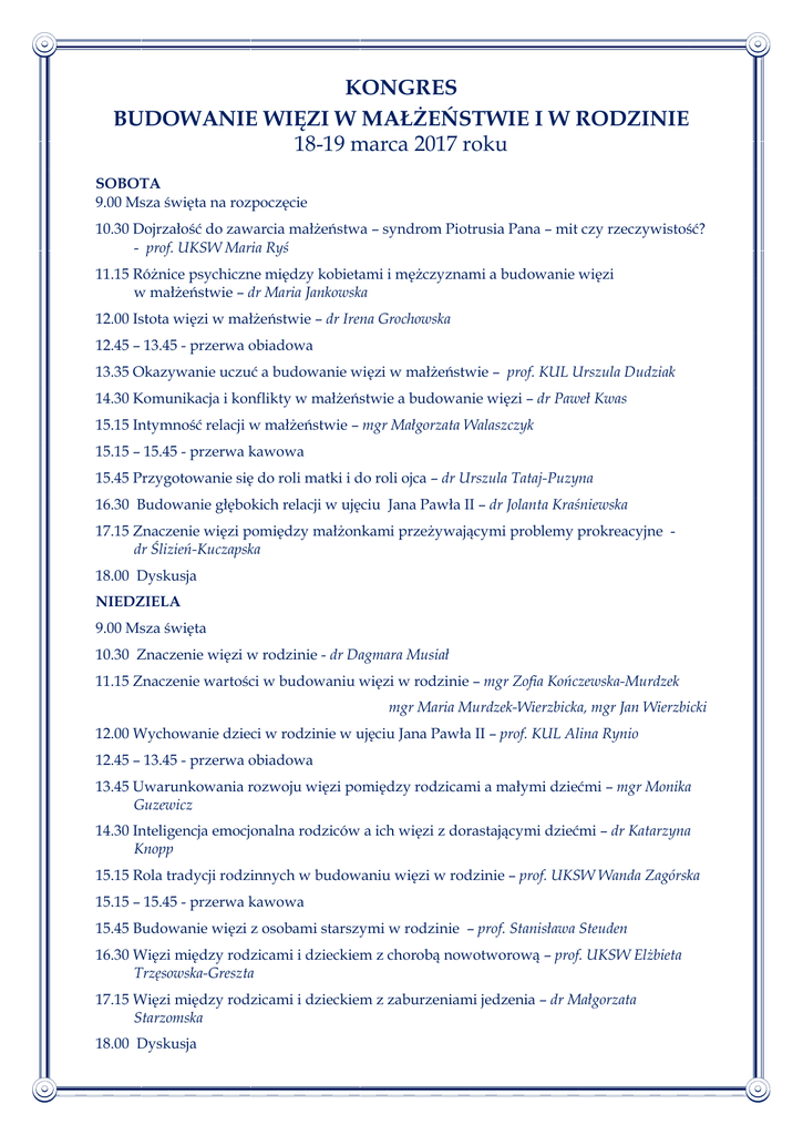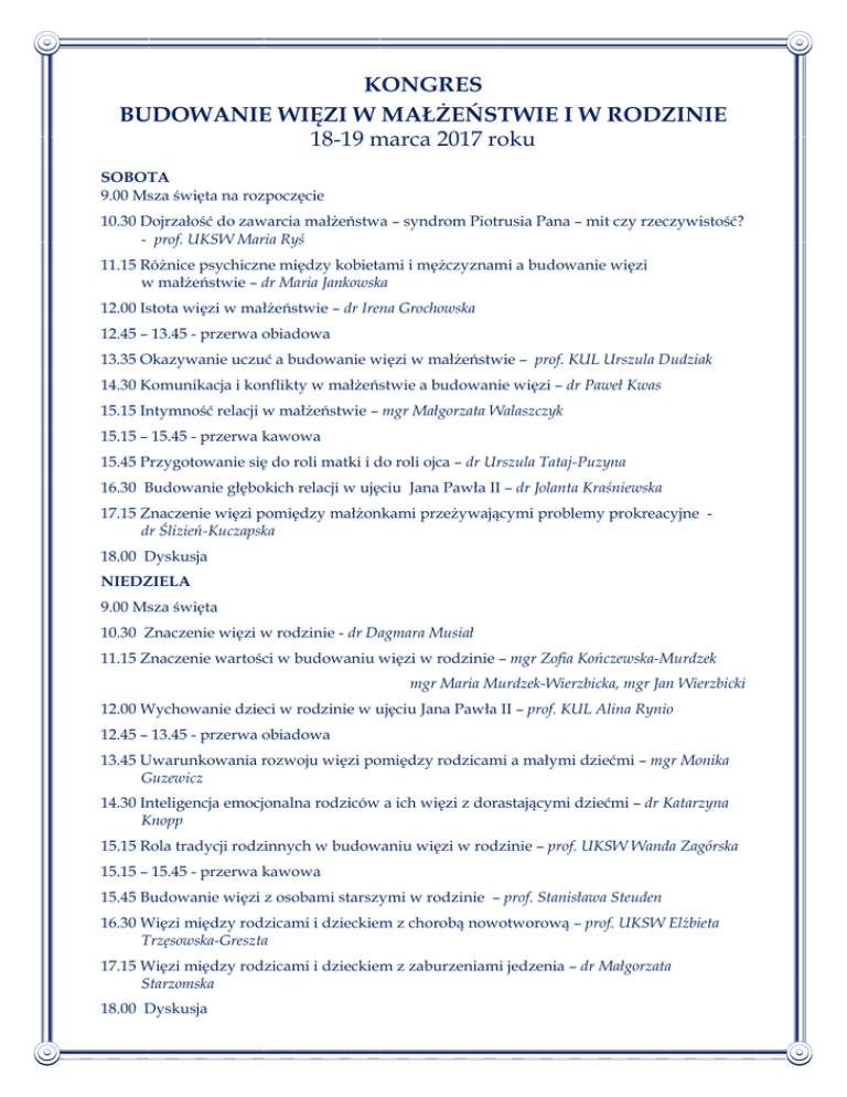 KONGRES BUDOWANIE WIĘZI W MAŁŻEŃSTWIE I W RODZINIE 18-19 marca 2017 roku SOBOTA 9.00 Msza święta na rozpoczęcie 10.30 Dojrzałość do zawarcia małżeństwa – syndrom Piotrusia Pana – mit czy rzeczywistość? - prof. UKSW Maria Ryś 11.15 Różnice psychiczne między kobietami i mężczyznami a budowanie więzi w małżeństwie – dr Maria Jankowska 12.00 Istota więzi w małżeństwie – dr Irena Grochowska 12.45 – 13.45 - przerwa obiadowa 13.35 Okazywanie uczuć a budowanie więzi w małżeństwie – prof. KUL Urszula Dudziak 14.30 Komunikacja i konflikty w małżeństwie a budowanie więzi – dr Paweł Kwas 15.15 Intymność relacji w małżeństwie – mgr Małgorzata Walaszczyk 15.15 – 15.45 - przerwa kawowa 15.45 Przygotowanie się do roli matki i do roli ojca – dr Urszula Tataj-Puzyna 16.30 Budowanie głębokich relacji w ujęciu Jana Pawła II – dr Jolanta Kraśniewska 17.15 Znaczenie więzi pomiędzy małżonkami przeżywającymi problemy prokreacyjne dr Ślizień-Kuczapska 18.00 Dyskusja NIEDZIELA 9.00 Msza święta 10.30 Znaczenie więzi w rodzinie - dr Dagmara Musiał 11.15 Znaczenie wartości w budowaniu więzi w rodzinie – mgr Zofia Kończewska-Murdzek mgr Maria Murdzek-Wierzbicka, mgr Jan Wierzbicki 12.00 Wychowanie dzieci w rodzinie w ujęciu Jana Pawła II – prof. KUL Alina Rynio 12.45 – 13.45 - przerwa obiadowa 13.45 Uwarunkowania rozwoju więzi pomiędzy rodzicami a małymi dziećmi – mgr Monika Guzewicz 14.30 Inteligencja emocjonalna rodziców a ich więzi z dorastającymi dziećmi – dr Katarzyna Knopp 15.15 Rola tradycji rodzinnych w budowaniu więzi w rodzinie – prof. UKSW Wanda Zagórska 15.15 – 15.45 - przerwa kawowa 15.45 Budowanie więzi z osobami starszymi w rodzinie – prof. Stanisława Steuden 16.30 Więzi między rodzicami i dzieckiem z chorobą nowotworową – prof. UKSW Elżbieta Trzęsowska-Greszta 17.15 Więzi między rodzicami i dzieckiem z zaburzeniami jedzenia – dr Małgorzata Starzomska 18.00 Dyskusja