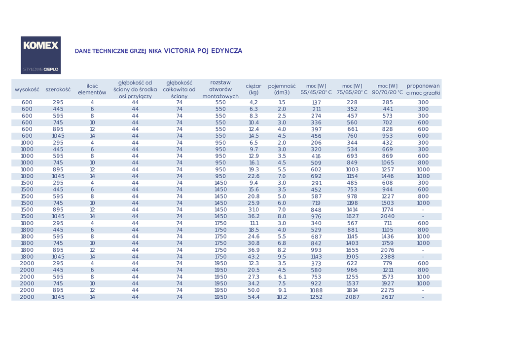 DANE TECHNICZNE GRZEJNIKA VICTORIA