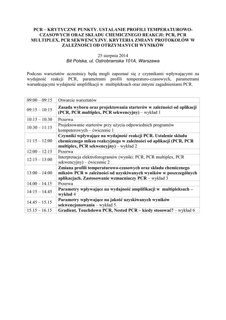 PCR – KRYTYCZNE PUNKTY. USTALANIE PROFILI TEMPERATUROWOCZASOWYCH ORAZ SKŁADU CHEMICZNEGO REAKCJI: PCR, PCR MULTIPLEX, PCR SEKWENCYJNY. KRYTERIA ZMIANY PROTOKOŁÓW W ZALEŻNOŚCI OD OTRZYMANYCH WYNIKÓW 25 sierpnia 2014 Bit Polska, ul. Ostrobramska 101A, Warszawa Podczas warsztatów uczestnicy będą mogli zapoznać się z czynnikami wpływającymi na wydajność reakcji PCR, parametrami profili temperaturo-czasowych, parametrami warunkującymi wydajność amplifikacji w multipleksach oraz innymi zagadnieniami PCR. 09:00 – 09:15 Otwarcie warsztatów 09:15 – 10:15 Zasada wyboru oraz projektowania starterów w zależności od aplikacji (PCR, PCR multiplex, PCR sekwencyjny) – wykład 1 10:15 – 10:30 10:30 – 11:15 11:15 – 12:00 12:00 – 12:15 12:15 – 13:00 13:00 – 14:00 14.00 – 14.15 14:15 – 14.45 14.45 – 15.15 15.15 – 16.15 Przerwa Projektowanie starterów przy użyciu odpowiednich programów komputerowych – ćwiczenie 1 Czynniki wpływające na wydajność reakcji PCR. Ustalenie składu chemicznego miksu reakcyjnego w zależności od aplikacji (PCR, PCR multiplex, PCR sekwencyjny) – wykład 2 Przerwa Interpretacja elektroforogramów (wyniki: PCR, PCR multiplex, PCR sekwencyjny) – ćwiczenie 2 Zmiana profili temperaturowo-czasowych oraz składu chemicznego miksów PCR w zależności od uzyskiwanych wyników w poszczególnych aplikacjach. Zastosowanie wzmacniaczy PCR – wykład 3 Przerwa Parametry wpływające na wydajność amplifikacji w multipleksach – wykład 4 Parametry wpływające na jakość uzyskiwanych wyników sekwencjonowania – wykład 5. Gradient, Touchdown PCR, Nested PCR – kiedy stosować? – wykład 6