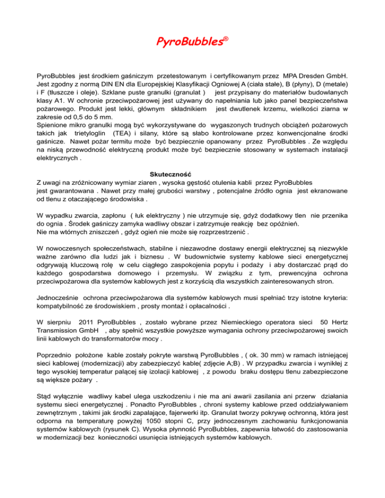 PyroBubbles® PyroBubbles jest środkiem gaśniczym przetestowanym i certyfikowanym przez MPA Dresden GmbH. Jest zgodny z normą DIN EN dla Europejskiej Klasyfikacji Ogniowej A (ciała stałe), B (płyny), D (metale) i F (tłuszcze i oleje). Szklane puste granulki (granulat ) jest przypisany do materiałów budowlanych klasy A1. W ochronie przeciwpożarowej jest używany do napełniania lub jako panel bezpieczeństwa pożarowego. Produkt jest lekki, głównym składnikiem jest dwutlenek krzemu, wielkości ziarna w zakresie od 0,5 do 5 mm. Spienione mikro granulki mogą być wykorzystywane do wygaszonych trudnych obciążeń pożarowych takich jak trietyloglin (TEA) i silany, które są słabo kontrolowane przez konwencjonalne środki gaśnicze. Nawet pożar termitu może być bezpiecznie opanowany przez PyroBubbles . Ze względu na niską przewodność elektryczną produkt może być bezpiecznie stosowany w systemach instalacji elektrycznych . Skuteczność Z uwagi na zróżnicowany wymiar ziaren , wysoka gęstość otulenia kabli przez PyroBubbles jest gwarantowana . Nawet przy małej grubości warstwy , potencjalne źródło ognia jest ekranowane od tlenu z otaczającego środowiska . W wypadku zwarcia, zapłonu ( łuk elektryczny ) nie utrzymuje się, gdyż dodatkowy tlen nie przenika do ognia . Środek gaśniczy zamyka wadliwy obszar i zatrzymuje reakcję bez opóźnień. Nie ma wtórnych zniszczeń , gdyż ogień nie może się rozprzestrzenić . W nowoczesnych społeczeństwach, stabilne i niezawodne dostawy energii elektrycznej są niezwykle ważne zarówno dla ludzi jak i biznesu . W budownictwie systemy kablowe sieci energetycznej odgrywają kluczową rolę w celu ciągłego zaspokojenia popytu i podaży i aby dostarczać prąd do każdego gospodarstwa domowego i przemysłu. W związku z tym, prewencyjna ochrona przeciwpożarowa dla systemów kablowych jest z korzyścią dla wszystkich zainteresowanych stron. Jednocześnie ochrona przeciwpożarowa dla systemów kablowych musi spełniać trzy istotne kryteria: kompatybilność ze środowiskiem , prosty montaż i opłacalności . W sierpniu 2011 PyroBubbles , zostało wybrane przez Niemieckiego operatora sieci 50 Hertz Transmission GmbH , aby spełnić wszystkie powyższe wymagania ochrony przeciwpożarowej swoich linii kablowych do transformatorów mocy . Poprzednio położone kable zostały pokryte warstwą PyroBubbles , ( ok. 30 mm) w ramach istniejącej sieci kablowej (modernizacji) aby zabezpieczyć kable( zdjęcie A;B) . W przypadku zwarcia i wynikłej z tego wysokiej temperatur palącej się izolacji kablowej , z powodu braku dostępu tlenu zabezpieczone są większe pożary . Stąd wyłącznie wadliwy kabel ulega uszkodzeniu i nie ma ani awarii zasilania ani przerw działania systemu sieci energetycznej . Ponadto PyroBubbles , chroni systemy kablowe przed oddziaływaniem zewnętrznym , takimi jak środki zapalające, fajerwerki itp. Granulat tworzy pokrywę ochronną, która jest odporna na temperaturę powyżej 1050 stopni C, przy jednoczesnym zachowaniu funkcjonowania systemów kablowych (rysunek C). Wysoka płynność PyroBubbles, zapewnia łatwość do zastosowania w modernizacji bez konieczności usunięcia istniejących systemów kablowych. Na przykład istniejące szyby kabli wzdłuż torów kolejowych mogą być wypełnione w każdym momencie. Wypełnienia pustych przestrzeni dla ochrony przeciwpożarowej mogą być stosowane do tras kablowych, kanałów kablowych, szybów kablowych, półek kablowych i serwerowni . (rysunek D;E) Picture A Picture C: Picture E: Show Exhibit Picture B: Protected Cable Route Implementation Picture D: Cable Cellar Pre Filling Cable Cellar After Filling Picture F: Cable Cellar Suction Podsumowanie PyroBubbles ®, jest wydajnym i łatwym w instalacji prewencyjnym systemem przeciwpożarowym dla systemów kablowych. Jest niezwykle lekki, neutralny z wodą, bezpieczny dla żywności i może być poddany recyklingowi po użyciu poprzez zwykłe kanały recyklingu. Dla celów konserwacji nasz produkt może być wchłaniany (np. odkurzaczem) i ponownie użyty. Dlatego dostępne są różne systemy ssące (rysunek F) . Jeśli chcesz dowiedzieć się więcej o PyroBubbles ®, uprzejmie prosimy o kontakt z nami . Referencje dla ochrony systemów kablowych Albro Versorgungstechnik GmbH, Germany (szyby kablowe) 50Hertz Transmission GmbH, Germany (piwnica kablowa i trasy kablowe) Stadtwerke Güstrow, Germany (dukty instalacyjne) Ritz-Carlton, Berlin, Germany (piwnica kablowa) AOS Stade, Germany (mostki kablowe)