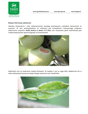 www.agrobakalarzewo.pl www.agro-plus.pl www.kazgod.pl Bieżące informacje sadownicze Wysokie temperatury i silne nasłonecznienie sprzyjają powstawaniu uszkodzeń słonecznych na owocach. W celu przeciwdziałania im wskazane jest prowadzenie intensywnego programu dokarmiania wapniem (FoliQ Amical w dawce 3-5 l/ha) oraz stosowanie glinki kaolinitowej jako środka bezpośrednio ograniczającego ich powstawanie. Nadchodzi czas na zwalczanie zwójek liściowych. W związku z tym w ciągu kilku najbliższych dni w wielu lokalizacjach konieczne będą zabiegi zwalczania tych szkodników. Ostatni atak lata przyspieszył rozwój populacji trochę zapomnianych w tym sezonie przędziorków. Konieczne są bardzo dokładne lustracje, przędziorki mogą występować „wyspowo” – na kilku, kilkunastu drzewach w rzędzie. Do przędziorków dołączyły pordzewiacze, szczególnie na Jonagoldach, Goldenie i Red Delicious. Warto wykonać lustrację i podjąć jeszcze zwalczanie. Z uwagi na wysokie temperatury problemem stają się też niedobory potasu, szczególnie na Gali, ale także na innych odmianach. Konieczne jest u uwagi na dobre wybarwianie się i wzrost owoców wykonanie w takiej sytuacji zabiegów nawozami potasowymi (FoliQ MAKRO K w dawce 3-5 l/ha). Warto wykonać lustracje po kwaterach Gali, Glostera oraz Ligola i zrzucić jabłka przedwcześnie wybarwione. Zwykle mają one spleśniałe gniazda nasienne. To zjawisko występuje dość powszechnie w tym sezonie. Warto także zwracać uwagę przy przerywce na suchą i miękką zgniliznę przykielichową. Na Goldenie zaczyna pojawiać się nekrotyczna plamistość liści. W takiej sytuacji powinno się wykonać jak najszybciej dokarmianie dolistne mieszaniną FoliQ Mg Magnezowy z FoliQ Mikromix w dawkach 3+1 l/ha. Ciepło i wilgotno to doskonałe warunki do rozwoju parcha wtórnego.