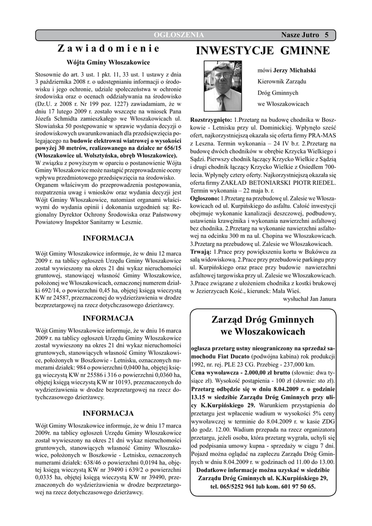 OGŁOSZENIA Zawiadomienie Wójta Gminy Włoszakowice Stosownie do art. 3 ust. 1 pkt. 11, 33 ust. 1 ustawy z dnia 3 października 2008 r. o udostępnianiu informacji o środowisku i jego ochronie, udziale społeczeństwa w ochronie środowiska oraz o ocenach oddziaływania na środowisko (Dz.U. z 2008 r. Nr 199 poz. 1227) zawiadamiam, że w dniu 17 lutego 2009 r. zostało wszczęte na wniosek Pana Józefa Schmidta zamieszkałego we Włoszakowicach ul. Słowiańska 50 postępowanie w sprawie wydania decyzji o środowiskowych uwarunkowaniach dla przedsięwzięcia polegającego na budowie elektrowni wiatrowej o wysokości powyżej 30 metrów, realizowanego na działce nr 656/15 (Włoszakowice ul. Wolsztyńska, obręb Włoszakowice). W związku z powyższym w oparciu o postanowienie Wójta Gminy Włoszakowice może nastąpić przeprowadzenie oceny wpływu przedmiotowego przedsięwzięcia na środowisko. Organem właściwym do przeprowadzenia postępowania, rozpatrzenia uwag i wniosków oraz wydania decyzji jest Wójt Gminy Włoszakowice, natomiast organami właściwymi do wydania opinii i dokonania uzgodnień są: Regionalny Dyrektor Ochrony Środowiska oraz Państwowy Powiatowy Inspektor Sanitarny w Lesznie. INFORMACJA Wójt Gminy Włoszakowice informuje, że w dniu 12 marca 2009 r. na tablicy ogłoszeń Urzędu Gminy Włoszakowice został wywieszony na okres 21 dni wykaz nieruchomości gruntowej, stanowiącej własność Gminy Włoszakowice, położonej we Włoszakowicach, oznaczonej numerem działki 692/14, o powierzchni 0,45 ha, objętej księgą wieczystą KW nr 24587, przeznaczonej do wydzierżawienia w drodze bezprzetargowej na rzecz dotychczasowego dzierżawcy. INFORMACJA Wójt Gminy Włoszakowice informuje, że w dniu 16 marca 2009 r. na tablicy ogłoszeń Urzędu Gminy Włoszakowice został wywieszony na okres 21 dni wykaz nieruchomości gruntowych, stanowiących własność Gminy Włoszakowice, położonych w Boszkowie - Letnisku, oznaczonych numerami działek: 984 o powierzchni 0,0400 ha, objętej księgą wieczystą KW nr 25586 i 316 o powierzchni 0,0360 ha, objętej księgą wieczystą KW nr 10193, przeznaczonych do wydzierżawienia w drodze bezprzetargowej na rzecz dotychczasowego dzierżawcy. INFORMACJA Wójt Gminy Włoszakowice informuje, że w dniu 17 marca 2009r. na tablicy ogłoszeń Urzędu Gminy Włoszakowice został wywieszony na okres 21 dni wykaz nieruchomości gruntowych, stanowiących własność Gminy Włoszakowice, położonych w Boszkowie - Letnisku, oznaczonych numerami działek: 638/46 o powierzchni 0,0194 ha, objętej księgą wieczystą KW nr 39490 i 639/2 o powierzchni 0,0335 ha, objętej księgą wieczystą KW nr 39490, przeznaczonych do wydzierżawienia w drodze bezprzetargowej na rzecz dotychczasowego dzierżawcy. Nasze Jutro 5 INWESTYCJE GMINNE mówi Jerzy Michalski Kierownik Zarządu Dróg Gminnych we Włoszakowicach Rozstrzygnięto: 1.Przetarg na budowę chodnika w Boszkowie - Letnisku przy ul. Dominickiej. Wpłynęło sześć ofert, najkorzystniejszą okazała się oferta firmy PRA-MAS z Leszna. Termin wykonania – 24 IV b.r. 2.Przetarg na budowę dwóch chodników w obrębie Krzycka Wielkiego i Sądzi. Pierwszy chodnik łączący Krzycko Wielkie z Sądzią i drugi chodnik łączący Krzycko Wielkie z Osiedlem 700lecia. Wpłynęły cztery oferty. Najkorzystniejszą okazała się oferta firmy ZAKŁAD BETONIARSKI PIOTR RIEDEL. Termin wykonania – 22 maja b. r. Ogłoszono: 1.Przetarg na przebudowę ul. Zalesie we Włoszakowicach od ul. Kurpińskiego do asfaltu. Całość inwestycji obejmuje wykonanie kanalizacji deszczowej, podbudowy, ustawienia krawężnika i wykonania nawierzchni asfaltowej bez chodnika. 2.Przetarg na wykonanie nawierzchni asfaltowej na odcinku 300 m na ul. Chopina we Włoszakowicach. 3.Przetarg na przebudowę ul. Zalesie we Włoszakowicach. Trwają: 1.Prace przy powiększeniu kortu w Bukówcu za salą widowiskową. 2.Prace przy przebudowie parkingu przy ul. Kurpińskiego oraz prace przy budowie nawierzchni asfaltowej targowiska przy ul. Zalesie we Włoszakowicach. 3.Prace związane z ułożeniem chodnika z kostki brukowej w Jezierzycach Kość., kierunek: Mała Wieś. wysłuchał Jan Janura Zarząd Dróg Gminnych we Włoszakowicach ogłasza przetarg ustny nieograniczony na sprzedaż samochodu Fiat Ducato (podwójna kabina) rok produkcji 1992, nr. rej. PLE 23 CG. Przebieg - 237,000 km. Cena wywoławcza - 2.000,00 zł brutto (słownie: dwa tysiące zł). Wysokość postąpienia - 100 zł (słownie: sto zł). Przetarg odbędzie się w dniu 8.04.2009 r. o godzinie 13.15 w siedzibie Zarządu Dróg Gminnych przy ulicy K.Kurpińskiego 29. Warunkiem przystąpienia do przetargu jest wpłacenie wadium w wysokości 5% ceny wywoławczej w terminie do 8.04.2009 r. w kasie ZDG do godz. 12.00. Wadium przepada na rzecz organizatora przetargu, jeżeli osoba, która przetarg wygrała, uchyli się od podpisania umowy kupna - sprzedaży w ciągu 7 dni. Pojazd można oglądać na zapleczu Zarządu Dróg Gminnych w dniu 8.04.2009 r. w godzinach od 11.00 do 13.00. Dodatkowe informacje można uzyskać w siedzibie Zarządu Dróg Gminnych ul. K.Kurpińskiego 29, tel. 065/5252 961 lub kom. 601 97 50 65.
