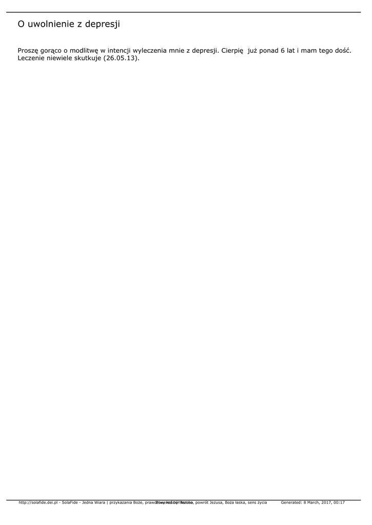 O uwolnienie z depresji Proszę gorąco o modlitwę w intencji wyleczenia mnie z depresji. Cierpię już ponad 6 lat i mam tego dość. Leczenie niewiele skutkuje (26.05.13). http://solafide.dei.pl - SolaFide - Jedna Wiara | przykazania Boże, prawdziwy Powered kościół by Mambo Jezusa, powrót Jezusa, Boża łaska, sens życia Generated: 8 March, 2017, 00:17