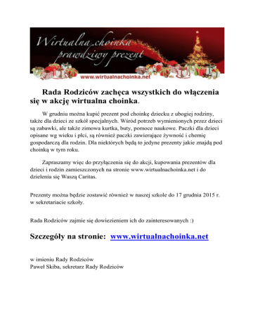 Rada Rodziców zachęca wszystkich do włączenia się w akcję wirtualna choinka. W grudniu można kupić prezent pod choinkę dziecku z ubogiej rodziny, także dla dzieci ze szkół specjalnych. Wśród potrzeb wymienionych przez dzieci są zabawki, ale także zimowa kurtka, buty, pomoce naukowe. Paczki dla dzieci opisane wg wieku i płci, są również paczki zawierające żywność i chemię gospodarczą dla rodzin. Dla niektórych będą to jedyne prezenty jakie znajdą pod choinką w tym roku. Zapraszamy więc do przyłączenia się do akcji, kupowania prezentów dla dzieci i rodzin zamieszczonych na stronie www.wirtualnachoinka.net i do dzielenia się Waszą Caritas. Prezenty można będzie zostawić również w naszej szkole do 17 grudnia 2015 r. w sekretariacie szkoły. Rada Rodziców zajmie się dowiezieniem ich do zainteresowanych :) Szczegóły na stronie: www.wirtualnachoinka.net w imieniu Rady Rodziców Paweł Skiba, sekretarz Rady Rodziców