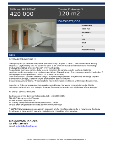 DOM na SPRZEDAŻ 420 000 Tarnów, Krakowska 3 120 m2 15485/3877/ODS 420 000 PLN 3 500 PLN Secondary 9 120 2013 5 NeedsFinishing Opis OFERTA BEZPROWIZYJNA !!! Oferujemy do sprzedania nowy dom jednorodzinny , o pow. 120 m2, zlokalizowany w okolicy Wojnicza. Usytuowany jest na działce o pow. 9 ar. Dom mieszkalny wzniesiony w technologii tradycyjnej według projektu "Basia" firmy Archipelag. Na parterze budynku: salon, duży taras z zejściem do ogrodu, pokój, kuchnia, łazienka i pomieszczenie gospodarcze z osobnym wejściem. Na poddaszu: 3 przestronne pokoje i łazienka. Z jednego pokoju na poddaszu balkon od strony zachodniej. Dom wykonany z pustaka ceramicznego, ocieplony styropianem z wykonaną elewacją z tynku cienkowarstwowego, z drewnianymi elementami dekoracyjnymi. Dojazd drogą utwardzoną. W sąsiedztwie nowe domy jednorodzinne, w bliskiej odległości las. Jesteśmy z Tobą od prezentacji do przekazania kluczy. Sprawnie przygotujemy dla Ciebie dokumenty do zakupu, a z naszym doradcą finansowym wybierzesz najlepszą ofertę kredytu. Nr oferty: 15485/3877/ODS Zadzwoń do mnie: Janicka Małgorzata, tel.: +48500130454 PÓŁNOC Nieruchomości Tarnów e-mail: [email protected] Nr licencji osoby odpowiedzialnej zawodowo: 20064 Więcej ofert znajdziesz na naszej stronie www.polnoc.pl * UWAGA! Zamieszczone na naszych stronach oferty nie stanowią oferty w rozumieniu Kodeksu Cywilnego, a dane w nich zawarte mają jedynie charakter informacyjny. Małgorzata Janicka tel. 500-130-454 email: [email protected] PÓŁNOC Nieruchomości - ogólnopolska sieć biur nieruchomości www.polnoc.pl Powered by TCPDF (www.tcpdf.org)