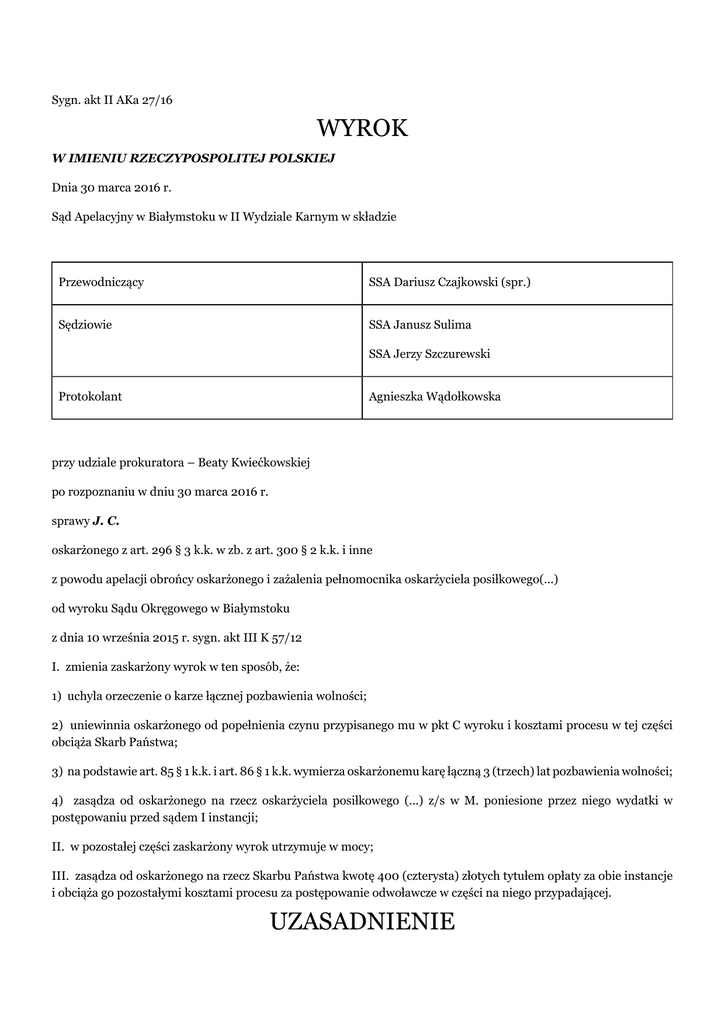 Sygn. akt II AKa 27/16 WYROK W IMIENIU RZECZYPOSPOLITEJ POLSKIEJ Dnia 30 marca 2016 r. Sąd Apelacyjny w Białymstoku w II Wydziale Karnym w składzie Przewodniczący SSA Dariusz Czajkowski (spr.) Sędziowie SSA Janusz Sulima SSA Jerzy Szczurewski Protokolant Agnieszka Wądołkowska przy udziale prokuratora – Beaty Kwiećkowskiej po rozpoznaniu w dniu 30 marca 2016 r. sprawy J. C. oskarżonego z art. 296 § 3 k.k. w zb. z art. 300 § 2 k.k. i inne z powodu apelacji obrońcy oskarżonego i zażalenia pełnomocnika oskarżyciela posiłkowego(...) od wyroku Sądu Okręgowego w Białymstoku z dnia 10 września 2015 r. sygn. akt III K 57/12 I. zmienia zaskarżony wyrok w ten sposób, że: 1) uchyla orzeczenie o karze łącznej pozbawienia wolności; 2) uniewinnia oskarżonego od popełnienia czynu przypisanego mu w pkt C wyroku i kosztami procesu w tej części obciąża Skarb Państwa; 3) na podstawie art. 85 § 1 k.k. i art. 86 § 1 k.k. wymierza oskarżonemu karę łączną 3 (trzech) lat pozbawienia wolności; 4) zasądza od oskarżonego na rzecz oskarżyciela posiłkowego (...) z/s w M. poniesione przez niego wydatki w postępowaniu przed sądem I instancji; II. w pozostałej części zaskarżony wyrok utrzymuje w mocy; III. zasądza od oskarżonego na rzecz Skarbu Państwa kwotę 400 (czterysta) złotych tytułem opłaty za obie instancje i obciąża go pozostałymi kosztami procesu za postępowanie odwoławcze w części na niego przypadającej. UZASADNIENIE J. C. oskarżony został o to, że: I. od 2006 roku do listopada 2010 r. w B. jako prezes jednoosobowego zarządu spółki z o.o. (...) działał na jej szkodę, wyrządzając szkodę majątkową w wielkich rozmiarach, w ten sposób, że: 1. udzielił sobie jako osobie fizycznej pożyczki, od której nie spłacał nawet odsetek, a wydłużając co najmniej trzykrotnie, przy czym po raz ostatni, czyniąc to i w celu udaremnienia wykonania orzeczeń sądu, do 31 grudnia 2012 r. w 2009 roku, termin spłaty, uniemożliwił dochodzenie przez spółkę spłaty pożyczki, której zagrożona zajęciem kwota w końcu 2010 roku wynosiła 7.126.600 zł, ukrywając ją tak przed wierzycielami(...), (...) Bankiem (...) SA oraz W. D., których zaspokojenie przez to udaremnił, 2. 19 lutego 2010 roku w celu udaremnienia wykonania orzeczeń sądu sprzedał powiązanej osobowo spółce (...) zagrożone zajęciem 20.000 udziałów w spółce (...) za 3.000.000 zł, nie sprawdzając zdolności zapłacenia ceny przez kupującego, rozkładając zapłatę na cztery raty płatne do 31 grudnia 2011 roku i godząc się 27 lutego 2010 roku na obniżenie ceny do 2.000.000 zł, chociaż żądanie nabywcy oparte było na okolicznościach znanych w czasie sprzedaży, przez co uszczuplił zaspokojenie z udziałów swoich wierzycieli (...), (...) Banku (...) SA oraz W. D., 3. w październiku i listopadzie 2010 roku prowadził z firmą (...) negocjacje, w wyniku których on i inna osoba fizyczna nabyli za 10% wartości nominalnej pozbawione wartości rzeczywistej wierzytelności w kwocie łącznej 7.948.381,32 zł, w celu spłacenia nimi swoich długów wobec spółki, tj. o przestępstwo z art. 296 § 3 k.k. w zb. z art. 300 § 2 k.k., II. od 30 sierpnia 2010 roku w B. w celu udaremnienia wykonania orzeczeń sądu usunął spod egzekucji komorniczej zagrożone zajęciem 45.000 zł, które gotówką do kasy spółki z o.o. (...) jako ratę za udziały spółki (...) wpłaciła spółka (...), przez co uszczuplił zaspokojenie swoich wierzycieli(...), (...) Banku (...) SA oraz W. D., tj. o przestępstwo z art. 300 § 2 k.k., III. od 31 grudnia 2009 do 25 października 2010 roku w B. jako prezes jednoosobowego zarządu zagrożonej niewypłacalnością spółki z o.o. (...), nie mogąc spłacić wszystkich wierzycieli spłacił na rzecz (...) Banku SA 966.863,53 zł, działając na szkodę pozostałych wierzycieli,(...) i W. D., tj. o przestępstwo z art. 302 § 1 k.k., IV. 21 kwietnia 2011 roku w B. jako prezes jednoosobowego zarządu zagrożonej niewypłacalnością spółki z o.o. (...), nie mogąc spłacić wszystkich wierzycieli spłacił na rzecz (...) Urzędu Skarbowego 1.030.969 zł, działając na szkodę pozostałych wierzycieli, (...), (...) Banku (...) SA oraz W. D., tj. o przestępstwo z art. 302 § 1 k.k., V. 5 listopada 2008 roku w B. działając jako prezes jednoosobowego zarządu spółki z o.o. (...) i z chęci osiągnięcia korzyści majątkowej doprowadził przedstawicieli spółki (...) do niekorzystnego rozporządzenia jej mieniem znacznej wartości, w ten sposób, że zobowiązując się spłacić jej za to 500.000 euro, których, co zataił, w rzeczywistości zapłacić nie zamierzał, spowodował, iż przeniosła hipoteczne zabezpieczenie swych roszczeń do kwoty 500.000 euro z nieruchomości przy ul. (...) w B. wartej 3.355.000 zł na nieruchomość w S. wartą 614.400 zł, z której w wyniku egzekucji pokrzywdzony odzyskał jedynie równowartość 92.173,37 euro, tj. o przestępstwo z art. 286 § 1 k.k. w zw. z art. 294 § 1 k.k., VI. od 18 maja 2008 roku w B. jako prezes jednoosobowego zarządu spółki z o.o. (...) zaniechał złożenia wniosku o ogłoszenie jej upadłości, mimo tego, że spółka zaprzestała wykonywania swych zobowiązań pieniężnych wobec wierzycieli, w szczególności spółki(...), (...) Banku (...) SA oraz W. D., tj. o przestępstwo z art. 586 kodeksu spółek handlowych. Sąd Okręgowy w Białymstoku wyrokiem z dnia 10 września 2015r., sygn. akt III K 57/12: A. W ramach czynu opisanego w pkt. I oskarżonego J. C. uznał za winnego tego, że w okresie od stycznia 2006 roku do 30 czerwca 2011 r. w B., działając w wykonaniu z góry powziętego zamiaru, w krótkich odstępach czasu, w celu osiągnięcia korzyści majątkowej jako prezes jednoosobowego zarządu spółki z o.o. (...) nadużył przysługujących mu uprawnień i działając na szkodę spółki wyrządził jej szkodę majątkową w wielkich rozmiara