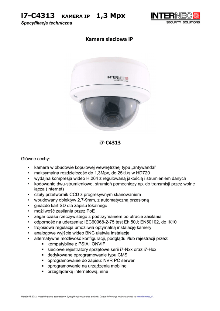 i7-C4313 KAMERA IP Specyfikacja techniczna 1,3 Mpx Kamera sieciowa IP i7-C4313 Główne cechy: • • • • • • • • • • • • • kamera w obudowie kopułowej wewnętrznej typu „antywandal' maksymalna rozdzielczość do 1,3Mpx, do 25kl./s w HD720 wydajna kompresja wideo H.264 z regulowaną jakością i strumieniem danych kodowanie dwu-strumieniowe, strumień pomocniczy np. do transmisji przez wolne łącza (Internet) czuły przetwornik CCD z progresywnym skanowaniem wbudowany obiektyw 2,7-9mm, z automatyczną przesłoną gniazdo kart SD dla zapisu lokalnego możliwość zasilania przez PoE zegar czasu rzeczywistego z podtrzymaniem po utracie zasilania odporność na uderzenia: IEC60068-2-75 test Eh,50J; EN50102, do IK10 trójosiowa regulacja umożliwia optymalną instalację kamery analogowe wyjście wideo BNC ułatwia instalacje alternatywne możliwość konfiguracji, podglądu i/lub rejestracji przez: ▪ kompatybilne z PSIA i ONVIF ▪ sieciowe rejestratory sprzętowe serii i7-Nxx oraz i7-Hxx ▪ dedykowane oprogramowanie typu CMS ▪ oprogramowanie do zapisu: NVR PC serwer ▪ oprogramowanie na urządzenia mobilne ▪ przeglądarkę internetową, inne Wersja 03.2012. Wszelkie prawa zastrzeżone. Specyfikacja może ulec zmianie. Dalsze informacje można uzyskać na www.internec.pl . i7-C4313 KAMERA IP Specyfikacja techniczna 1,3 Mpx Parametry techniczne: Model Parametry Kamera Przetwornik Min. oświetlenie Elektroniczna migawka Obiektyw Kąt widzenia Mocowanie obiektywu Auto Iris Dzień / Noc Regulacja modułu Standard kompresji Kompresja wideo Strumień bitowy Kompresja audio Dwustrumieniowość Obraz Maks.rozdzielczość obrazu Liczba klatek na sekundę (fps) przy zadanej rozdzielczości Ustawienia obrazu Sieć Zapis sieciowy Alarmy Protokoły Bezpieczeństwo Kompatybilność Interfejs Interfejs komunikacyjny Wejście audio Wyjście audio Interfejs szeregowy Wejście alarmowe Wyjście alarmowe Wyjście wideo Zapis lokalny Przycisk reset Ogólne Warunki pracy Zasilanie Pobór prądu Odporność na uderzenia i7-C4313 Kamera 1.3 Mpx CCD w obudowie kopułowej 1/3” CCD z progresywnym skanowaniem 0.1Lux @ (F1.2,AGC ON) 1/25s -1/100,000s 2,7–9mm / F1.2 101° - 30.4° Φ14 Sterowanie DC Elektroniczna funkcja dualna 3D: poziom: 0° - 360°, pion: 0° - 75°, obrót: 0° - 360° H.264/MPEG4/MJPEG 32 Kbps~16Mbps G.711 Tak 1280 × 960 50 Hz: 12.5 fps (1280 × 960), 25 fps (1280 × 720) 60 Hz: 15 fps (1280 × 960), 30 fps (1280 × 720) Nasycenie, jasność, kontrast, barwa, ostrość: ustawiane przez CMS lub przeglądarkę NAS(ISCSI opcjonalnie) Detekcja ruchu, sabotaż wideo, nieuprawnione logowanie, błąd zapisu, pełna karta SD, błąd sieci IP, alarm z wejścia TCP/IP,HTTP,DHCP,DNS,DDNS,RTP/RTSP, PPPoE, SMTP, NTP, FTP (SNMP,HTTPS, SIP, SRTP, 802.1x, IPV6 opcjonalnie) Ochrona hasłem, Znak wodny ONVIF, PSIA, CGI RJ45 10M / 100M Ethernet 1 kanał wejście mikrofonowe, 3.5mm mini-jack 1 kanał 3.5mm mini-jack (liniowe, 600Ω) RS-485 2 kanały 2 kanały 1Vp-p wyjście kompozytowe (75Ω/BNC) Wsparcie dla kart SD/SDHC do 32GB, wbudowany slot Tak Wewnątrz pomieszczeń; -10℃~60℃, wilgotność maks. 90% (nieskondensowana) DC12V±10% / PoE (802.3af) 7,5W MAX IEC60068-275Eh, 50J; EN50102, do IK10 Wersja 03.2012. Wszelkie prawa zastrzeżone. Specyfikacja może ulec zmianie. Dalsze informacje można uzyskać na www.internec.pl . i7-C4313 KAMERA IP Specyfikacja techniczna Wymiary Waga 1,3 Mpx Φ 140 × 114 mm 1400g Zasilacz, karta SD, nie są zawarte w składzie zestawu, należy nabyć oddzielnie Informacje do zamówień: i7-C4313 Wymiary: Akcesoria: Uchwyt wewnętrzny do wpuszczenia kamery w sufit podwieszany : i7-B1227 Uchwyt ścienny z przepustem kablowym : i7-B1229 Wersja 03.2012. Wszelkie prawa zastrzeżone. Specyfikacja może ulec zmianie. Dalsze informacje można uzyskać na www.internec.pl .