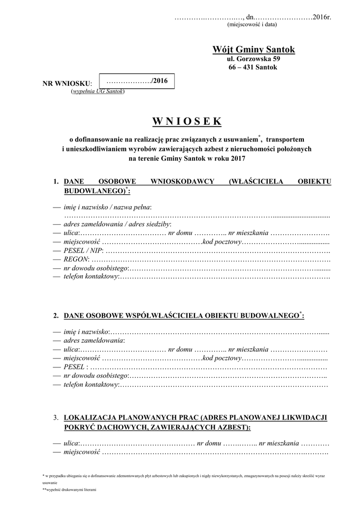 ………….………….…, dn.……………………2016r. (miejscowość i data) Wójt Gminy Santok ul. Gorzowska 59 66 – 431 Santok NR WNIOSKU: ………………./2016 (wypełnia UG Santok) WNIOSEK o dofinansowanie na realizację prac związanych z usuwaniem*, transportem i unieszkodliwianiem wyrobów zawierających azbest z nieruchomości położonych na terenie Gminy Santok w roku 2017 1. DANE OSOBOWE BUDOWLANEGO)*: WNIOSKODAWCY (WŁAŚCICIELA OBIEKTU imię i nazwisko / nazwa pełna: ……………………………………………………………………………................................ adres zameldowania / adres siedziby: ulica:……………………………… nr domu ………….. nr mieszkania ……………………. miejscowość ……………………………………kod pocztowy……………………................. PESEL / NIP: …………………………………………………………………………………. REGON: ………………………………………………………………………………………. nr dowodu osobistego:……………………………………………………………………........ telefon kontaktowy:……………………………………………………………………………. 2. DANE OSOBOWE WSPÓŁWŁAŚCICIELA OBIEKTU BUDOWALNEGO*: imię i nazwisko:……………………………………………………………………………...... adres zameldowania: ulica:……………………………… nr domu ………….. nr mieszkania …………………… miejscowość ……………………………………kod pocztowy……………………................ PESEL : ……………………………………………………………………………………… nr dowodu osobistego:……………………………………………………………………….. telefon kontaktowy:…………………………………………………………………………… 3. LOKALIZACJA PLANOWANYCH PRAC (ADRES PLANOWANEJ LIKWIDACJI POKRYĆ DACHOWYCH, ZAWIERAJĄCYCH AZBEST): ulica:………………………………………… nr domu …….…….. nr mieszkania ………… miejscowość ………………………………………………………………………….………. * w przypadku ubiegania się o dofinansowanie zdemontowanych płyt azbestowych lub zakupionych i nigdy niewykorzystanych, zmagazynowanych na posesji należy skreślić wyraz usuwanie **wypełnić drukowanymi literami 4. NUMER DZIAŁKI I OBRĘB: numer działki ………………………………….., obręb ……………………….…………… 5. CHARAKTERYSTYKA PRAC: rodzaj płyt eternitowych (faliste / płaskie):………………………………………………….. płyty dachowe / płyty elewacyjne: ………………………………………………………….. wielkość powierzchni przeznaczonej do likwidacji określona w m2 lub w Mg: ………………………………………………………………………………………… prace związane z usuwaniem azbestu obejmują: demontaż pokrycia dachowego w obrębie budynku mieszkalnego, demontaż pokrycia dachowego w obrębie budynku gospodarczego, demontaż pokrycia dachowego w obrębie budynku garażowego, demontaż pokrycia dachowego w obrębie altanki działkowej, jedynie odbiór złożonego uprzedniego na palecie azbestu. UWAGA: wielkość powierzchni przeznaczonej do likwidacji będzie weryfikowany w terenie z trakcie prowadzonych prac przez specjalistyczną firmą. 6. PLANOWANY TERMIN REALIZACJI PRAC: …………………………………2017r. (podać szacunkowo miesiąc planowanych prac) Ponadto, oświadczam, że wszystkie dane zawarte w powyższym wniosku wypełniłem/am zgodnie z prawdą. …………………………………………… (podpis Wnioskodawcy) …………………………………………… (podpis Właściciela / Współwłaściciela) * w przypadku ubiegania się o dofinansowanie zdemontowanych płyt azbestowych lub zakupionych i nigdy niewykorzystanych, zmagazynowanych na posesji należy skreślić wyraz usuwanie **wypełnić drukowanymi literami Wykaz niezbędnych dokumentów do przedłożenia z wnioskiem : 1. Kopia aktualnego dokumentu potwierdzającego tytuł prawny do budynku/działki oraz zgodę właściciela, w przypadku współwłaścicieli zgody wszystkich pozostałych właścicieli na realizację zadania wraz z upoważnieniem dla Wnioskodawcy do występowania w imieniu wszystkich współwłaścicieli oraz do podpisania umowy dotacji z Gminą Santok. 2. Informacja o wyrobach zawierających azbest, zgodnie z rozporządzeniem Ministra Gospodarki z dnia 13 grudnia 2010r. w sprawie wymagań w zakresie wykorzystywania wyrobów zawierających azbest oraz wykorzystywania i oczyszczania instalacji lub urządzeń, w których były lub są wykorzystywane wyroby zawierający azbest (Dz. U. z 2011r., Nr 8, poz. 31). 3. Mapka ewidencyjna z zaznaczonym budynkiem (miejscem występowania wyrobów azbestowych). 4. Oświadczenie Wnioskodawcy. 5. Kopia dokumentu potwierdzającego przyjęcie zgłoszenia o zamiarze rozpoczęcia robót budowlanych niewymagających pozwolenia na budowę lub pozwolenie na rozbiórkę budynku, bądź pozwolenie na budowę (wymagane w przypadku, gdy nastąpi zmiana elementów konstrukcyjnych obiektu) – wydawane przez właściwy organ architektoniczno – budowlany (Starostwo Powiatowe w Gorzowie Wlkp. z/s przy ul. J. Pankiewicza 5-7). * w przypadku ubiegania się o dofinansowanie zdemontowanych płyt azbestowych lub zakupionych i nigdy niewykorzystanych, zmagazynowanych na posesji należy skreślić wyraz usuwanie **wypełnić drukowanymi literami