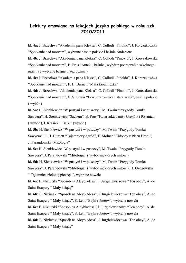 Lektury omawiane na lekcjach języka polskiego w roku szk. 2010/2011 kl. 4a: J. Brzechwa “Akademia pana Kleksa”, C. Collodi “Pinokio”, J. Korczakowska “Spotkanie nad morzem”, wybrane baśnie polskie i baśnie Andersena kl. 4b: J. Brzechwa “Akademia pana Kleksa”, C. Collodi “Pinokio”, J. Korczakowska “Spotkanie nad morzem”, B. Prus “Antek”, baśnie ( wybór z podręcznika szkolnego oraz trzy wybrane baśnie przez ucznia ) kl. 4c: J. Brzechwa “Akademia pana Kleksa”, C. Collodi “Pinokio”, J. Korczakowska “Spotkanie nad morzem”, F. H. Burnett “Mała księŜniczka” kl. 4d: J. Brzechwa “Akademia pana Kleksa”, C. Collodi “Pinokio”, J. Korczakowska “Spotkanie nad morzem”, C. S. Lewis “Lew, czarownica i stara szafa”, baśnie polskie ( wybór ) kl. 5a: H. Sienkiewicz “W pustyni i w puszczy”, M. Twain “Przygody Tomka Sawyera”, H. Sienkiewicz “Sachem”, B. Prus “Katarynka”, mity Greków i Rzymian ( wybór ), I. Krasicki “Bajki” (wybór ) kl. 5b: H. Sienkiewicz “W pustyni i w puszczy”, M. Twain “Przygody Tomka Sawyera”, F. H. Burnett “Tajemniczy ogród”, F. Molnar “Chłopcy z Placu Broni”, J. Parandowski “Mitologia” kl. 5c: H. Sienkiewicz “W pustyni i w puszczy”, M. Twain “Przygody Tomka Sawyera”, J. Parandowski “Mitologia” ( wybór niektórych mitów ) kl. 5d: H. Sienkiewicz “W pustyni i w puszczy”, M. Twain “Przygody Tomka Sawyera”, J. Parandowski “Mitologia” ( wybór niektórych mitów ), H. OŜogowska “ Tajemnica zielonej pieczęci”, wybrane nowele kl. 6a: E. Niziurski “Sposób na Alcybiadesa”, I. Jurgielewiczowa “Ten obcy”, A. de Saint Exupery “ Mały ksiąŜę” kl. 6b: E. Niziurski “Sposób na Alcybiadesa”, I. Jurgielewiczowa “Ten obcy”, A. de Saint Exupery “ Mały ksiąŜę”, S. Lem “Bajki robotów”, wybrana nowela kl. 6c: E. Niziurski “Sposób na Alcybiadesa”, I. Jurgielewiczowa “Ten obcy”, A. de Saint Exupery “ Mały ksiąŜę”, S. Lem “Bajki robotów”, wybrana nowela kl. 6d: E. Niziurski “Sposób na Alcybiadesa”, I. Jurgielewiczowa “Ten obcy”, A. de Saint Exupery “ Mały ksiąŜę”