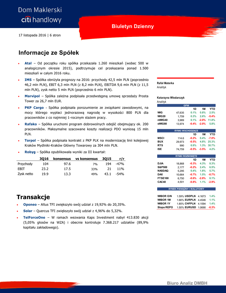 Biuletyn Dzienny 17 listopada 2016 | 6 stron Informacje ze Spółek Atal – Od początku roku spółka przekazała 1.260 mieszkań (wobec 500 w analogicznym okresie 2015), podtrzymuje cel przekazania ponad 1.500 mieszkań w całym 2016 roku. IMS – Spółka obniżyła prognozy na 2016: przychody 42,5 mln PLN (poprzednio 46,2 mln PLN), EBIT 6,3 mln PLN (z 8,2 mln PLN), EBITDA 9,6 mln PLN (z 11,5 mln PLN), zysk netto 5 mln PLN (poprzednio 6 mln PLN). Marvipol – Spółka zależna podpisała przedwstępną umowę sprzedaży Prosta Tower za 26,7 mln EUR. PKP Cargo - Spółka podpisała porozumienie ze związkami zawodowymi, na mocy którego wypłaci jednorazową nagrodę w wysokości 800 PLN dla pracowników z co najmniej 1-rocznym stażem pracy. Rafako – Spółka uruchomi program dobrowolnych odejść obejmujący ok. 200 pracowników. Maksymalne szacowane koszty realizacji PDO wyniosą 15 mln Rafał Materka Analityk Katarzyna Włodarczyk Analityk GPW WIG WIG20 mWIG40 sWIG80 47,635 1,759 3,989 13,974 RYNKI WSCHODZĄCE PLN. Torpol – Spółka podpisała kontrakt z PKP PLK na modernizację linii kolejowej Kraków Mydlniki-Kraków Główny Towarowy za 304 mln PLN. Robyg – Spółka opublikowała wyniki za III kwartał: Przychody EBIT Zysk netto 3Q16 konsensus vs konsensus 3Q15 r/r 104 23.2 97.6 17.5 7% 33% 194 21 -47% 11% 19.9 13.3 49% 43.1 -54% 1D 1M YTD 0.1% 0.8% 2.5% 0.3% 2.6% -5.4% 0.1% -2.0% 11.8% -0.4% -2.0% 5.8% MSCI BUX RTS ISE 114.6 29,973 990 74,759 1D 1M YTD -0.2% 0.4% -7.0% -0.5% 4.8% 25.3% 0.9% 1.3% 30.7% -0.5% -3.5% 4.2% RYNKI ROZWINIĘTE DJIA S&P500 NASDAQ DAX FTSE100 CAC40 18,868 2,177 5,295 10,664 6,750 4,501 1D 1M -0.3% 4.3% -0.2% 2.4% 0.4% 1.8% -0.7% 1.5% -0.6% -2.8% -0.8% 1.1% YTD 8.3% 6.5% 5.7% -0.7% 8.1% -2.9% RYNEK PIENIĘŻNY I WALUTOWY Transakcje Oponeo – Altus TFI zwiększyło swój udział z 19,92% do 20,35%. Solar – Quercus TFI zwiększyło swój udział z 4,96% do 5,32%. TelForceOne – W ramach wezwania Kaps Investment nabył 413.830 akcji (5,05% głosów na WZA) i obecnie kontroluje 7.368.217 udziałów (89,9% WIBOR O/N WIBOR 1M WIBOR 1Y Stopa REPO 1.59% 1.66% 1.85% 1.50% USDPLN EURPLN CHFPLN EURUSD 4.1673 4.4546 4.1594 1.0690 kapitału zakładowego). Biuro Analiz DMBH 1.4% 1.1% 1.4% -0.3% Biuletyn dzienny 17 listopada 2016 Kalendarz Spółek Asseco Poland – Publikacja raportu za III kwartał. KGHM – Wypłata dywidendy w wysokości 0,75 PLN na akcję. Archicom – Publikacja raportu za III kwartał. Comp – Publikacja raportu za III kwartał. FHDOM – Publikacja raportu za III kwartał. IMCOMPANY – Publikacja raportu za III kwartał. KRKA – Publikacja raportu za III kwartał. Robyg – Publikacja raportu za III kwartał. Cognor – NWZA WDX – Wprowadzenie do obrotu na GPW 32 000 akcji zwykłych serii A. Eurosnack – Dzień pierwszego notowania na Newconnect 1 357 390 akcji zwykłych serii H . Resbud – NWZA. Artifex – Debiut spółki na GPW. Wprowadzenie do obrotu 90 000 akcji serii A2, 6 400 000 akcji serii B oraz 500 000 praw do akcji zwykłych na okaziciela C. PCC Intermodal – NWZA. Makro Kalendarz GUS – Przeciętne wynagrodzenie brutto w październiku (oczekiwania +4,2% r/r, we wr ześniu +3,9% r/r) GUS – Zatrudnienie w sektorze przedsiębiorstw w październiku (oczekiwania: +3,1% r/r, we wrześniu: +3,2% r/r) Wezwania Asseco Poland – Spółka ogłosiła wezwanie do sprzedaży 1.386.904 akcji spółki Asseco Central (6,49% głosów na WZA) po cenie 23,5 PLN za udział. Zapisy rozpoczną się 15 listopada i potrwają od 14 grudnia. Intencją wzywającego jest wycofanie akcji z obrotu na GPW. Farmacol – Andrzej Olszewski ogłosił wezwanie do sprzedaży 10.676.280 akcji spółki (34%% głosów na WZA) , cena została podwyższona do 52 PLN za udział. Zapisy potrwają od 14 października do 23 listopada. Intencją wzywającego jest wycofanie akcji z obrotu na GPW. Mo-BRUK – Value FIZ Subfundusz 1 ogłosił wezwanie do sprzedaży nie więcej niż 1.327.375 akcji spółki ( tj. 30,68% ogólnej liczby głosów na Walnym Zgromadzeniu Spółki) po cenie 15,3 PLN za akcję. Minimalna liczba akcji nabyta w wezwaniu to 663.687 akcji. Zapisy potrwają od 7 listopada do 22 listopada. Netmedia– Porozumienie akcjonariuszy (Andrzej Wierzba, Michał Pszczoła, Jolanta Pszczoła oraz SO SPV łącznie kontrolujący 66,06% kapitału) ogłosiło wezwanie do sprzedaży 3.140.507 akcji spółki (33,94%% kapitału zakładowego) po cenie 0,6,5 PLN za udział. Intencją wzywających jest wycofanie akcji z obrotu na GPW. Zap isy potrwają od 21 października do 22 listopada. Aplisens – Spółka ogłosiła ofertę zakupu do 845.470 akcji własnych, oferowana cena 12,45 PLN za udział. Zapisy na sprzedaż akcji przyjmowane są od 10 do 22 listopada. . Biuletyn dzienny 17 listopada 2016 Wskaźniki Spółek (1) C/Z Spółka C/WK EV/EBITDA Kurs 2015 2016 2017 2015 2016 2017 2015 2016 2017 71.77 10.8 14.3 13.9 1.2 1.1 1.0 50.6 5.3 5.0 200.00 23.0 16.2 15.4 8.5 7.3 6.8 11.0 7.8 6.8 ELEKTROBUDOWA 95.80 7.5 9.6 10.5 1.2 1.1 1.0 5.5 4.3 4.3 TRAKCJA PRKiI 12.65 11.2 12.2 14.6 0.9 0.9 0.8 5.8 5.1 6.2 ELECTRICA 13.6 12.7 12.0 12.0 0.8 0.8 0.8 3.6 3.6 3.8 ENEA 9.23 -9.4 4.8 5.3 0.4 0.3 0.3 4.2 5.1 5.7 ENERGA 7.12 3.5 18.0 5.3 0.3 0.3 0.3 3.4 4.1 4.4 EUROCASH 36.98 26.3 18.4 15.7 4.7 4.0 3.5 13.0 10.5 9.3 FARMACOL 51.95 14.0 13.5 12.9 1.0 0.9 0.9 8.8 8.4 7.5 GRUPA AZOTY 52.95 8.6 10.6 10.3 0.8 0.8 0.7 5.1 5.5 5.4 262.95 23.7 19.0 16.7 3.1 2.7 2.3 17.0 14.4 13.2 BOGDANKA BUDIMEX INTERCARS JSW 82.26 -3.0 -27.6 -22.4 2.5 2.8 3.2 -4.8 18.8 18.9 KETY 379.95 17.1 13.1 15.5 2.8 2.6 2.5 11.3 9.7 9.5 KGHM 82.00 15.6 13.2 14.9 0.8 0.8 0.7 -4.4 3.8 3.9 5362.95 27.7 71.8 30.7 5.1 5.0 4.4 14.3 22.7 14.6 364.00 18.6 17.0 15.4 3.1 2.8 2.5 11.9 10.8 9.7 184.4 27.3 27.6 21.5 6.3 5.6 4.7 23.5 18.9 14.9 LPP NEUCA CCC ORANGE POLSKA 5.24 27.1 91.2 196.4 0.6 0.6 0.6 3.2 3.8 4.4 CYFROWY POLSAT 22.95 12.6 14.6 12.9 1.4 1.3 1.2 7.2 7.3 7.2 ORBIS 66.00 16.8 16.9 15.5 1.7 1.6 1.5 8.3 