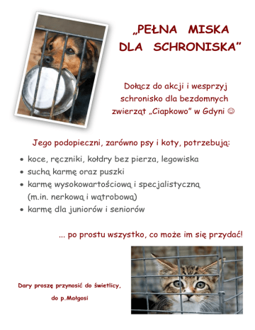 „PEŁNA MISKA DLA SCHRONISKA” Dołącz do akcji i wesprzyj schronisko dla bezdomnych zwierząt „Ciapkowo” w Gdyni Jego podopieczni, zarówno psy i koty, potrzebują: koce, ręczniki, kołdry bez pierza, legowiska suchą karmę oraz puszki karmę wysokowartościową i specjalistyczną (m.in. nerkową i wątrobową) karmę dla juniorów i seniorów ... po prostu wszystko, co może im się przydać! Dary proszę przynosić do świetlicy, do p.Małgosi