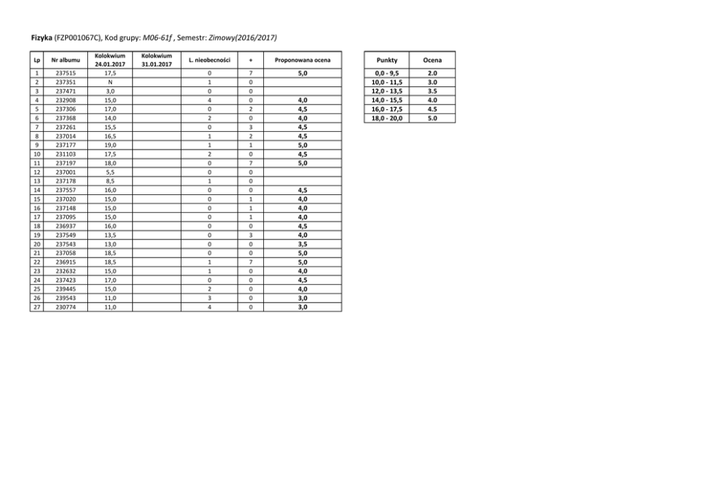 Fizyka (FZP001067C), Kod grupy: M06-61f , Semestr: Zimowy(2016/2017) Lp Nr albumu 1 2 3 4 5 6 7 8 9 10 11 12 13 14 15 16 17 18 19 20 21 22 23 24 25 26 27 237515 237351 237471 232908 237306 237368 237261 237014 237177 231103 237197 237001 237178 237557 237020 237148 237095 236937 237549 237543 237058 236915 232632 237423 239445 239543 230774 Kolokwium 24.01.2017 17,5 N 3,0 15,0 17,0 14,0 15,5 16,5 19,0 17,5 18,0 5,5 8,5 16,0 15,0 15,0 15,0 16,0 13,5 13,0 18,5 18,5 15,0 17,0 15,0 11,0 11,0 Kolokwium 31.01.2017 L. nieobecności + Proponowana ocena Punkty Ocena 0 1 0 4 0 2 0 1 1 2 0 0 1 0 0 0 0 0 0 0 0 1 1 0 2 3 4 7 0 0 0 2 0 3 2 1 0 7 0 0 0 1 1 1 0 3 0 0 7 0 0 0 0 0 5,0 0,0 - 9,5 10,0 - 11,5 12,0 - 13,5 14,0 - 15,5 16,0 - 17,5 18,0 - 20,0 2.0 3.0 3.5 4.0 4.5 5.0 4,0 4,5 4,0 4,5 4,5 5,0 4,5 5,0 4,5 4,0 4,0 4,0 4,5 4,0 3,5 5,0 5,0 4,0 4,5 4,0 3,0 3,0