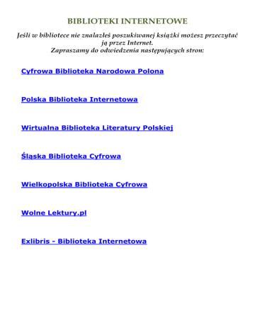 BIBLIOTEKI INTERNETOWE Jeśli w bibliotece nie znalazłeś poszukiwanej książki możesz przeczytać ją przez Internet. Zapraszamy do odwiedzenia następujących stron: Cyfrowa Biblioteka Narodowa Polona Polska Biblioteka Internetowa Wirtualna Biblioteka Literatury Polskiej Śląska Biblioteka Cyfrowa Wielkopolska Biblioteka Cyfrowa Wolne Lektury.pl Exlibris - Biblioteka Internetowa