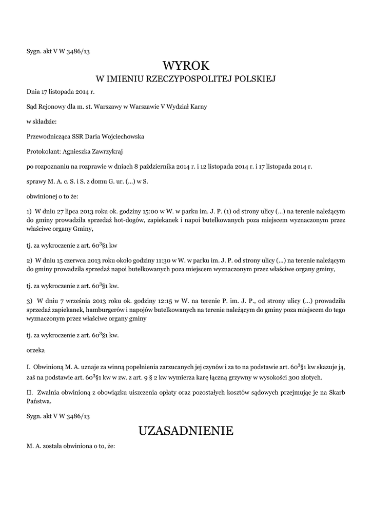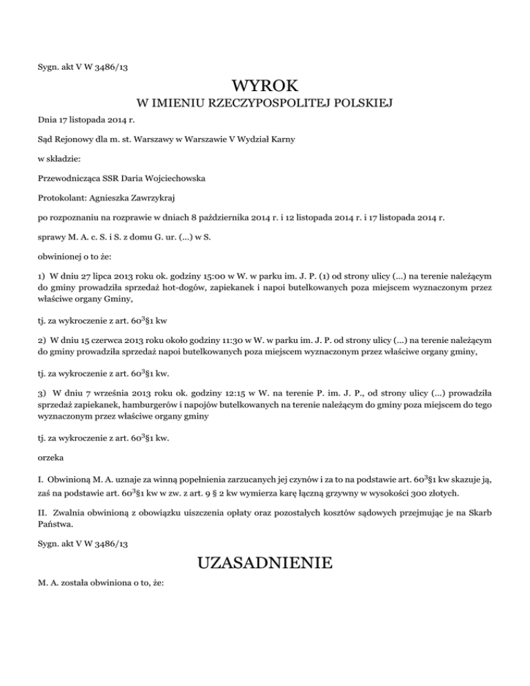Sygn. akt V W 3486/13 WYROK W IMIENIU RZECZYPOSPOLITEJ POLSKIEJ Dnia 17 listopada 2014 r. Sąd Rejonowy dla m. st. Warszawy w Warszawie V Wydział Karny w składzie: Przewodnicząca SSR Daria Wojciechowska Protokolant: Agnieszka Zawrzykraj po rozpoznaniu na rozprawie w dniach 8 października 2014 r. i 12 listopada 2014 r. i 17 listopada 2014 r. sprawy M. A. c. S. i S. z domu G. ur. (...) w S. obwinionej o to że: 1) W dniu 27 lipca 2013 roku ok. godziny 15:00 w W. w parku im. J. P. (1) od strony ulicy (...) na terenie należącym do gminy prowadziła sprzedaż hot-dogów, zapiekanek i napoi butelkowanych poza miejscem wyznaczonym przez właściwe organy Gminy, tj. za wykroczenie z art. 603§1 kw 2) W dniu 15 czerwca 2013 roku około godziny 11:30 w W. w parku im. J. P. od strony ulicy (...) na terenie należącym do gminy prowadziła sprzedaż napoi butelkowanych poza miejscem wyznaczonym przez właściwe organy gminy, tj. za wykroczenie z art. 603§1 kw. 3) W dniu 7 września 2013 roku ok. godziny 12:15 w W. na terenie P. im. J. P., od strony ulicy (...) prowadziła sprzedaż zapiekanek, hamburgerów i napojów butelkowanych na terenie należącym do gminy poza miejscem do tego wyznaczonym przez właściwe organy gminy tj. za wykroczenie z art. 603§1 kw. orzeka I. Obwinioną M. A. uznaje za winną popełnienia zarzucanych jej czynów i za to na podstawie art. 603§1 kw skazuje ją, zaś na podstawie art. 603§1 kw w zw. z art. 9 § 2 kw wymierza karę łączną grzywny w wysokości 300 złotych. II. Zwalnia obwinioną z obowiązku uiszczenia opłaty oraz pozostałych kosztów sądowych przejmując je na Skarb Państwa. Sygn. akt V W 3486/13 UZASADNIENIE M. A. została obwiniona o to, że: 4) W dniu 27 lipca 2013 roku ok. godziny 15:00 w W. w parku im. J. P. (1) od strony ulicy (...) na terenie należącym do gminy prowadziła sprzedaż hot-dogów, zapiekanek i napoi butelkowanych poza miejscem wyznaczonym przez właściwe organy Gminy, tj. za wykroczenie z art. 603§1 kw 5) W dniu 15 czerwca 2013 roku około godziny 11:30 w W. w parku im. J. P. od strony ulicy (...) na terenie należącym do gminy prowadziła sprzedaż napoi butelkowanych poza miejscem wyznaczonym przez właściwe organy gminy, tj. za wykroczenie z art. 603§1 kw. 6) W dniu 7 września 2013 roku ok. godziny 12:15 w W. na terenie P. im. J. P., od strony ulicy (...) prowadziła sprzedaż zapiekanek, hamburgerów i napojów butelkowanych na terenie należącym do gminy poza miejscem do tego wyznaczonym przez właściwe organy gminy tj. za wykroczenie z art. 603§1 kw. Na podstawie całokształtu zebranego w sprawie materiału dowodowego Sąd Rejonowy ustalił następujący stan faktyczny: W dniu 15 czerwca 2013 roku funkcjonariusze Straży Miejskiej A. C. i T. B. wraz z pracownikiem (...) D. O. – R. D. pełnili służbę patrolową. Około godziny 11:30 udali się na teren parku im. J. P. (1) w W., gdzie zauważyli stojącą od strony ulicy (...) przyczepę. Idąc w jej kierunku ujawnili oni, iż z wnętrza przyczepy prowadzona jest sprzedaż produktów żywnościowych: kobieta przebywająca na terenie stoiska wydała mężczyźnie dwie zamknięte butelki 0,5 l. z wodą i sokiem pomarańczowym bez kubków. Wylegitymowana kobieta, którą okazała się być M. A., oświadczyła, iż nie posiada zgody zarządcy na prowadzenie w tym miejscu sprzedaży obwoźnej, gdyż prowadzi ona jedynie usługi. Z uwagi na to, iż odmówiła ona przyjęcia mandatu karnego kredytowanego, poinformowano ją o skierowaniu sprawy do Sądu. W dniu 27 lipca 2013 roku strażnicy miejscy A. C. i T. M. pełnili służbę patrolową. Około godziny 15:00 patrolując wraz z pracownikiem (...) D. O. – R. D. oraz pracownikiem Zarządu (...) – zarządcą terenu, teren parku im. J. P. od strony ulicy (...) w W., zwrócili uwagę na stoisko handlowe, w którym prowadzono sprzedaż hot-dogów, zapiekanek i napojów butelkowanych. Sprzedająca, którą okazała się być M. A. odmówiła przyjęcia mandatu karnego kredytowanego, oświadczając, iż wykonuje ona jedynie usługi. W dniu 7 września 2013 roku ok. godziny 12:15 w W. na terenie P. im. J. P., od strony ulicy (...) miała miejsce kolejna interwencja Straży Miejskiej z udziałem M. A.. Patrolujący teren P. M. strażnicy miejscy J. B. oraz D. W. ujawnili znajdujące się na terenie parku stoisko handlowe, w którym prowadzona była sprzedaż zapiekanek, hamburgerów i napojów butelkowanych. Kobieta, która prowadziła sprzedaż, tj. M. A. oświadczyła, iż nie posiada zezwolenia od zarządcy terenu, tj. Miasta S. W. na prowadzenie w tym miejscu sprzedaży. Z uwagi na to, iż odmówiła ona przyjęcia mandatu karnego kredytowanego, poinformowano ją o skierowaniu sprawy do Sądu. W trakcie wymienionych zdarzeń M. A. wykonywała pracę zleconą jej przez Z. S. na podstawie zawartej z nim w formie ustnej umowy o dzieło. Pracodawca M. Z. S. w ramach prowadzonej przez siebie działalności gospodarczej posiadał zaświadczenie o wpisie do ewidencji działalności gospodarczej wydane na postawie decyzji Zarządu D. W. m. st. W.. Przedmiotem prowadzonej przez niego działalności gospodarczej były m. in. ruchome placówki gastronomiczne, pozostała usługowa działalność gastronomiczna oraz sprzedaż detaliczna żywności, napojów i wyrobów tytoniowych prowadzona na straganach i targowiskach. Z uwagi na to, iż w rejonie P. P. M. nie są wydawane jakiekolwiek zezwolenia na zajmowanie pasa gruntu oraz prowadzenie w tym miejscu obwoźnej działalności gastronomicznej ze stoisk mobilnych, pracodawca M. A. nie posiadał stosownego zezwolenia na prowadzenie sprzedaży obwoźnej w tym miejscu. Powyższy stan faktyczny Sąd ustalił na podstawie: częściowych wyjaśnień obwinionej M. A. /k. 71, 5, 6, 20/, zeznań świadka A. C. /k. 71/, częściowych zeznań świadka Z. S. /k. 72/, a także notatek urzędowych /k. 1-2, 24-25/, kopii dokumentacji /k. 6-8, 32-34, 40-41, 45-47/, informacji ze stra