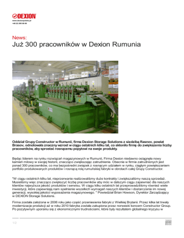 www.dexionpolska.pl +48 22 295 08 00 News: Już 300 pracowników w Dexion Rumunia Oddział Grupy Constructor w Rumunii, firma Dexion Storage Solutions z siedzibą Rasnov, powiat Brasov, odnotowała znaczny wzrost w ciągu ostatnich kilku lat, co skłoniło firmę do zwiększenia liczby pracowników, aby sprostać rosnącemu popytowi na swoje produkty. Będąc liderem na rynku rozwiązań magazynowych w Rumunii, Firma Dexion niedawno osiągnęła nowy kamień milowy w swojej historii, znacząco zwiększając zatrudnienie. Obecnie w firmie zatrudnionych jest ponad 300 pracowników, co ma bezpośredni związek z rosnącym udziałem w rynku, ciągłym powiększaniem portfolio produkowanych produktów i rosnącą rolą rumuńskiej fabryki w obrotach całej Grupy Constructor. "W ciągu ostatnich kilku lat, nieprzerwanie realizowaliśmy duże kontrakty i zwiększaliśmy naszą sprzedaż. Musieliśmy więc znacząco zwiększyć liczbę pracowników aby móc w dalszym ciągu zapewniać dla naszych klientów najwyższa jakość produktów i serwisu. W ciągu kilku ostatnich lat przeprowadziliśmy również wiele inwestycji, które zapewniają nam spełnienie wszelkich wymagań naszych klientów i dostarczenie im nowej generacji, wysokiej jakości wyposażenia magazynowego. " Powiedział Brian Howson, Dyrektor Zarządzający w DEXION Storage Solutions. Firma została założona w 2006 roku jako część przeniesienia fabryki z Wielkiej Brytanii. Przez kilka lat trwały modernizacje produkcji aż w roku 2010 fabryka została zakupiona przez norweski koncern Constructor Group. Po pozytywnym uporaniu się z ekonomicznymi trudnościami, które były rezultatem globalnego kryzysu w 1/2 www.dexionpolska.pl +48 22 295 08 00 światowej ekonomii, Dexion Rumunia jest tak silna dziś, jak nigdy dotąd, oferując zróżnicowany asortyment produktów wytwarzanych w nowoczesnej fabryce. Zakres produkcji wytwarzanej w Rumunii obejmuje regały półkowe, regały wysięgnikowe oraz półautomatyczne regały satelitarne typu Shuttle. Doskonałym uzupełnieniem oferty produkcyjnej jest szeroka gama akcesoriów i produktów specjalnych wytwarzanych na potrzeby całej grupy Constructor. W biurach fabryki w Rasnov mają swoją siedzibę również inne działy Grupy, które mają duże znaczenie dla jej sukcesu. Na przykład, zlokalizowane jest tu centrum projektowe grupy, gdzie zespół 45 utalentowanych inżynierów, każdego dnia opracowuje projekty i wyceny dla wszystkich biur sprzedaży w Europie. Bardzo duże znaczenie ma również dział R&D Grupy, który opracowuje nowe produkty czy laboratorium testów produktowych, które zapewnia, że wszystkie wytwarzane produkty są projektowane i wytwarzane zgodnie z najsurowszymi normami bezpieczeństwa. Umacniając swoją pozycję jako pierwszy dostawca rozwiązań magazynowych na rynku rumuńskim i jednocześnie pełniąc rolę ważnego centrum biznesu dla całej grupy Constructor, Dexion Storage Solutions oczekuje na dalszy dynamiczny rozwój swojej działalności w nadchodzących latach. 2/2