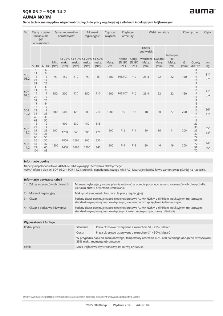 SQR 05.2 – SQR 14.2 AUMA NORM Dane techniczne napędów niepełnoobrotowych do pracy regulacyjnej z silnikami indukcyjnymi trójfazowymi Typ Czasy przesterowania dla 90° w sekundach Zakres momentów obrotowych1) Min. 50 Hz 60 Hz [Nm] SQR 05.2 SQR 07.2 SQR 10.2 SQR 12.2 SQR 14.2 8 11 16 22 32 8 11 16 22 32 11 16 22 32 45 63 16 22 32 45 63 36 48 72 100 6 9 12 17 25 6 9 12 17 25 9 12 17 25 35 50 12 17 25 35 50 30 40 60 85 Moment regulacyjny2) S4-25% S4-50% S4-25% S4-50% maks. maks. maks. maks. [Nm] [Nm] [Nm] [Nm] Częstość załączeń Maks. c/h Przyłącze armatury Wałek armatury Koło ręczne Otwór pod wałek z Podwójne Norma Opcja wpustem Kwadrat "D" EN ISO EN ISO Maks. Maks. Maks. Ø 5211 5211 [mm] [mm] [mm] [mm] 75 150 110 75 55 1500 F05/F07 F10 25,4 22 22 160 150 300 220 150 110 1500 F05/F07 F10 25,4 22 22 160 300 600 420 300 210 1500 F10 F12 38 30 27 200 900 630 450 315 1200 840 600 420 1500 F12 F14 50 36 41 200 1800 1260 900 630 2400 1680 1200 840 1500 F14 F16 60 46 46 200 600 1200 Ciężar Obroty dla 90° 11 16 11 16 11 11 16 11 16 11 15 11 15 11 15 11 22 30 22 30 22 51 70 51 70 ok. [kg] 213) 274) 213) 274) 263) 314) 353) 434) 443) 554) Informacje ogólne Napędy niepełnoobrotowe AUMA NORM wymagają sterowania elektrycznego. AUMA oferuje dla serii SQR 05.2 – SQR 14.2 sterowniki napędu ustawczego AM i AC. Można je również łatwo zamontować później na napędzie. Informacje dotyczące tabeli 1) Zakres momentów obrotowych Moment wyłączający można płynnie ustawiać w obrębie podanego zakresu momentów obrotowych dla kierunku obrotu otwierania i zamykania. 2) Moment regulacyjny Maksymalny moment obrotowy dla pracy regulacyjnej 3) Ciężar Podany ciężar obejmuje napęd niepełnoobrotowy AUMA NORM z silnikiem indukcyjnym trójfazowym, standardowym przyłączem elektrycznym, nieowierconym sprzęgłem i kołem ręcznym. 4) Ciężar z podstawą i dźwignią Podany ciężar obejmuje napęd niepełnoobrotowy AUMA NORM z silnikiem indukcyjnym trójfazowym, standardowym przyłączem elektrycznym i kołem ręcznym z podstawą i dźwignią. Wyposażenie i funkcje Rodzaj pracy Standard: Praca okresowo przerywana z rozruchem S4 - 25%, klasa C Opcja: Praca okresowo przerywana z rozruchem S4 - 50%, klasa C W przypadku napięcia znamionowego, temperatury otoczenia 40°C oraz średniego obciążenia w wysokości 35% maks. momentu obrotowego Silniki Silnik trójfazowy asynchroniczny, IM B9 wg EN 60034 Zmiany wynikające z postępu technicznego są zastrzeżone. Niniejszy dokument unieważnia poprzednie wersje. Y005.689/045/pl Wydanie 2.14 Arkusz 1/4 SQR 05.2 – SQR 14.2 AUMA NORM Dane techniczne napędów niepełnoobrotowych do pracy regulacyjnej z silnikami indukcyjnymi trójfazowymi Napięcie sieci, częstotliwość sieci Napięcia standardowe: Napięcia / częstotliwości prądu trójfazowego V 380 400 415 440 460 480 500 Hz 50 50 50 60 60 60 50 Napięcia specjalne: Napięcia / częstotliwości prądu trójfazowego V 525 575 660 690 Hz 50 50 50 50 Dopuszczalne wahania napięcia sieci: ±10% Dopuszczalne wahania częstotliwości sieci: ±5% Kategoria przepięciowa Kategoria III zgodnie z IEC 60364-4-443 Klasa izolacji Standard: Opcja: H, przystosowana do warunków tropikalnych Ochrona silnika Standard: Wyłącznik termiczny (NC) Opcja: F, przystosowana do warunków tropikalnych Termistor (PTC zgodnie z DIN 44082) Termistory wymagają zastosowania dodatkowych układów wyzwalających w sterowniku Grzałka silnika (opcja) Kąt przesterowania Napięcia: 110 – 120 V AC, 220 – 240 V AC lub 400 V AC (z zasilaniem zewnętrznym) Moc: 12,5 W Standard: od 75° do < 105° płynnie regulowany Opcje od 15° do < 45°, od 45° do < 75°, od 105° do < 135° Samohamowność Tak (napędy niepełnoobrotowe są samohamowne, jeśli pozycja armatury nie będzie zmieniana poprzez działanie momentu obrotowego na wał armatury) Obsługa ręczna Do ustawiania napędu lub przesterowania w razie awarii, koło ręczne nie obraca się w trybie elektrycznym Opcje: Zamykane koło ręczne Przedłużony wałek koła ręcznego Sygnalizacja obsługi ręcznej (opcja) Podłączanie elektryczne Sygnalizacja załączenia/wyłączenia trybu ręcznego na przełączniku pojedynczym (1 zestyk przełączny) Standard: Wtyczka okrągła AUMA z przyłączem śrubowym Opcje: Zaciski lub połączenie wtykowe Wtyczka sterująca pozłacana (gniazda i wtyczki) Gwinty do dławików kablowych Standard: gwinty metryczne Opcje: gwinty typu Pg, NPT, G Schemat połączeń TPA 00R1AA-001-000 (wersja podstawowa) Sprzęgło ze złączem wielowypustowym do podłączania wałka armatury Standard: sprzęgło nieowiercone Opcje: Sprzęgło po obróbce wykańczającej z otworem i wpustem, z czworokątem wewnętrznym lub podwójne "D" wg EN ISO 5211 Przyłącze armatury Wymiary wg EN ISO 5211, bez centrowania Z podstawą i dźwignią (opcja) Dźwignia obrotowa Z żeliwa sferoidalnego z dwoma lub trzema otworami do zamocowania mechanizmu dźwigniowego. Dźwignię można zamontować poprzez sprzęgło ze złączem wielowypustowym na wale napędowym w dowolnym położeniu, uwzględniając uwarunkowania zewnętrzne. Przeguby kulowe (opcja) Dwa przeguby kulowe pasujące do dźwigni, wraz z przeciwnakrętkami i dwiema spawanymi końcówkami pasującymi do rury zgodnie z kartą wymiarów Mocowanie Podstawa z czterema otworami do śrub mocujących Zmiany wynikające z postępu technicznego są zastrzeżone. Niniejszy dokument unieważnia poprzednie wersje. Y005.689/045/pl Wydanie 2.14 Arkusz 2/4 SQR 05.2 – SQR 14.2 AUMA NORM Dane techniczne napędów niepełnoobrotowych do pracy regulacyjnej z silnikami indukcyjnymi trójfazowymi Elektromechaniczna jednostka sterująca Wyłącznik krańcowy Licznikowy mechanizm do przełączania pozycji OTW. i ZAMYK. Standard: Wyłączniki pojedyncze (1 NC i 1 NO) na położenie krańcowe, bez izolacji galwanicznej Opcje: Wyłączniki tandemowe (2 NC i 2 NO) dla każdej pozycji krańcowej, wyłączniki z izol