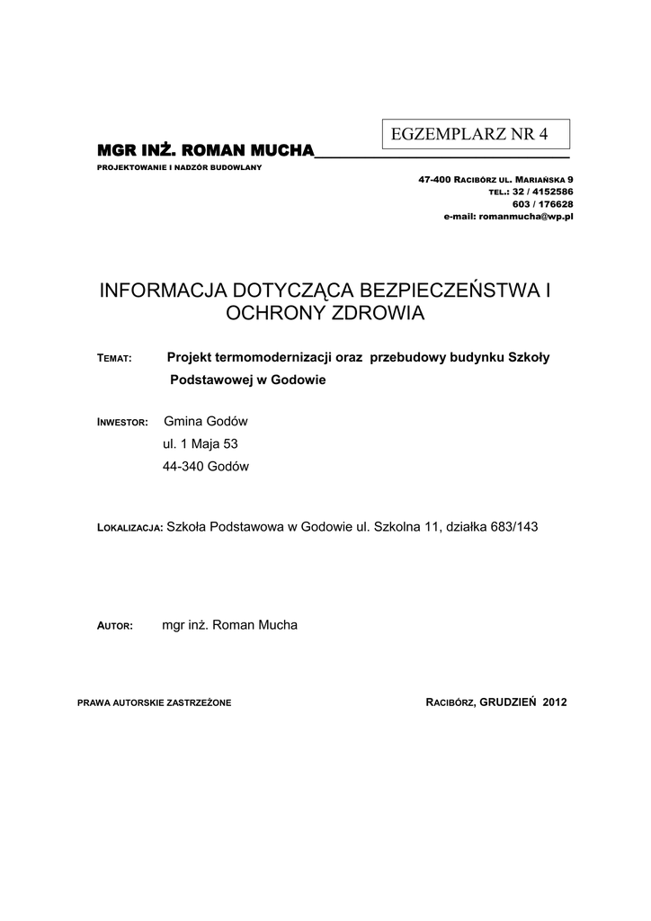 EGZEMPLARZ NR 4 MGR INś. ROMAN MUCHA______________________________ MUCHA PROJEKTOWANIE I NADZÓR BUDOWLANY 47-400 RACIBÓRZ UL. MARIAŃSKA 9 TEL.: 32 / 4152586 603 / 176628 e-mail: [email protected] INFORMACJA DOTYCZĄCA BEZPIECZEŃSTWA I OCHRONY ZDROWIA TEMAT: Projekt termomodernizacji oraz przebudowy budynku Szkoły Podstawowej w Godowie INWESTOR: Gmina Godów ul. 1 Maja 53 44-340 Godów LOKALIZACJA: Szkoła AUTOR: Podstawowa w Godowie ul. Szkolna 11, działka 683/143 mgr inŜ. Roman Mucha PRAWA AUTORSKIE ZASTRZEśONE RACIBÓRZ, GRUDZIEŃ 2012 1. Zakres robót dla całego zamierzenia budowlanego oraz kolejność realizacji poszczególnych obiektów Przedmiotem opracowania jest PROJEKT TERMOMODERNIZACJI I PRZEBUDOWY BUDYNKU SZKOŁY W GODOWIE. Projekt obejmuje roboty związane z dociepleniem budynku , roboty remontowe , przebudowę w strefie klatki schodowej oraz adaptację mieszkań na piętrze na cele dydaktyczne. Obejmuje następujące roboty: 1) termomodernizacyjne a) Ocieplenie ścian nadziemnych i piwnicznych metoda mokrą lekką b) Ociepleni stropodachu styropapą c) Częściowa wymiana okien i drzwi d) Projekt kotłowni wg odrębnego opracowania e) Wykonanie zadaszeń nad wejściem 2) Roboty remontowe i adaptacyjne a) Remont pomieszczeń poprzez malowanie ścian i sufitów i naprawę posadzki, wymiana instalacji oraz obudowy grzejników, oraz niezbędne roboty naprawcze. b) Przebudowa sanitariatów c) Dostosowanie budynku do warunków ochrony poŜarowej polegającej na wydzieleniu klatki schodowej, podzieleniu komunikacji ze względu na długości dróg ewakuacyjnych d) Adaptacja mieszkania na piętrze na cele dydaktyczne. 3) Roboty w terenie a) Wykonanie opasek wokół budynku b) Uporządkowanie stref wejścia do budynku c) Główne wejście do budynku wg odrębnego opracowania d) Istniejąca droga poŜarowa wg odrębnego opracowania Obiekt będzie wykonywany jednoetapowo przy podziale na roboty ziemne, ogólnobudowlane, wykończeniowe oraz zagospodarowania terenu. 2. Wykaz istniejących obiektów budowlanych Budynek szkoły zlokalizowany w Godowie przy Szkolnej 11, działka nr 683/143. Na przedmiotowej działce znajduje się oprócz budynku szkoły, boisko szkolne, tereny rekreacyjne, ciągi piesze oraz utwardzony plac przeznaczony do postoju samochodów, droga dojazdowa z ul Szkolnej. W części północnej znajdują się elementy fundamentów nieukończonej budowy hali. Szkoła znajduje się w obszarze zabudowy jednorodzinnej częściowo zabudowanej o duŜych róŜnicach wysokościowych terenu. 3. Wskazanie elementów zagospodarowania działki lub terenu, które mogą stwarzać zagroŜenie bezpieczeństwa i zdrowia ludzi Teren budowy powinien być ogrodzony lub skutecznie zabezpieczony przed osobami postronnymi. Wysokość ogrodzenia powinna wynosić co najmniej 1,5 m. Zamontować znaki „Uwaga! Roboty na wysokości!”, „Uwaga! Roboty budowlane!” i inne niezbędne, zalecone przez kierownika budowy. NaleŜy odpowiednio oznaczyć drogi ewakuacyjne na wypadek poŜaru, awarii i innych zagroŜeń. W ogrodzeniu placu budowy powinny być wykonane oddzielne bramy dla ruchu pieszego oraz pojazdów mechanicznych i maszyn budowlanych. Szerokość ciągu pieszego jednokierunkowego powinna wynosić co najmniej 0,75 m, a dwukierunkowego 1,20 m. Dla pojazdów uŜywanych w trakcie wykonywania robót budowlanych naleŜy wyznaczyć i oznakować miejsca postojowe na terenie budowy. Szerokość dróg komunikacyjnych na placu budowy lub robót powinna być dostosowana do uŜywanych środków transportowych. Drogi i ciągi piesze na placu budowy powinny być utrzymane we właściwym stanie technicznym. Nie wolno na nich składować materiałów, sprzętu lub innych przedmiotów. Drogi komunikacyjne dla wózków i taczek oraz pochylnie, po których dokonuje się ręcznego przenoszenia cięŜarów nie powinny mieć spadków większych niŜ 10%. Przejścia i strefy niebezpieczne powinny być oświetlone i oznakowane znakami ostrzegawczymi lub znakami zakazu. Przejścia o pochyleniu większym niŜ 15 % naleŜy zaopatrzyć w listwy umocowane poprzecznie, w odstępach nie mniejszych niŜ 0,40 m lub schody o szerokości nie mniejszej niŜ 0,75 m, zabezpieczone, co najmniej z jednej strony balustradą. Balustrada składa się z deski krawęŜnikowej o wysokości 0,15 m i poręczy ochronnej umieszczonej na wysokości 1,10 m. Wolną przestrzeń pomiędzy deską krawęŜnikową a poręczą naleŜy wypełnić w sposób zabezpieczający pracowników przed upadkiem. Strefa niebezpieczna, w której istnieje zagroŜenie spadania z wysokości przedmiotów, powinna być ogrodzona balustradami i oznakowana w sposób uniemoŜliwiający dostęp osobom postronnym. Strefa ta nie moŜe wynosić mniej niŜ 1/10 wysokości, z której mogą spadać przedmioty, lecz nie mniej niŜ 6,0 m. Przejścia, przejazdy i stanowiska pracy w strefie niebezpiecznej powinny być zabezpieczone daszkami ochronnymi. Daszki ochronne powinny znajdować się na wysokości nie mniejszej niŜ 2,4 m nad terenem w najniŜszym miejscu i być nachylone pod kątem 45º w kierunku źródła zagroŜenia. Pokrycie daszków powinno być szczelne i odporne na przebicie przez spadające przedmioty. UŜywanie daszków ochronnych jako rusztowań lub miejsc składowania narzędzi, sprzętu, materiałów jest zabronione. Nie jest dopuszczalne sytuowanie stanowisk pracy, składowisk wyrobów i materiałów lub maszyn i urządzeń budowlanych bezpośrednio pod napowietrznymi liniami elektroenergetycznymi lub w odległości liczonej w poziomie od skrajnych przewodów, mniejszej niŜ: - 3,0 m – dla linii o napięciu znamionowym nieprzekraczającym 1 KV, - 5,0 m – dla linii i napięciu znamionowym powyŜej 1 KV, lecz nieprzekraczającym 15 KV, - 10,0 m – dla linii o napięciu znamionowym powyŜej 15 KV, lecz nieprzekraczającym 30 KV, - 15,0 m – dla linii o napięciu znamionowym powyŜej 30 KV, lecz nieprzekraczającym 110 KV, - 30,0 m – dla linii o