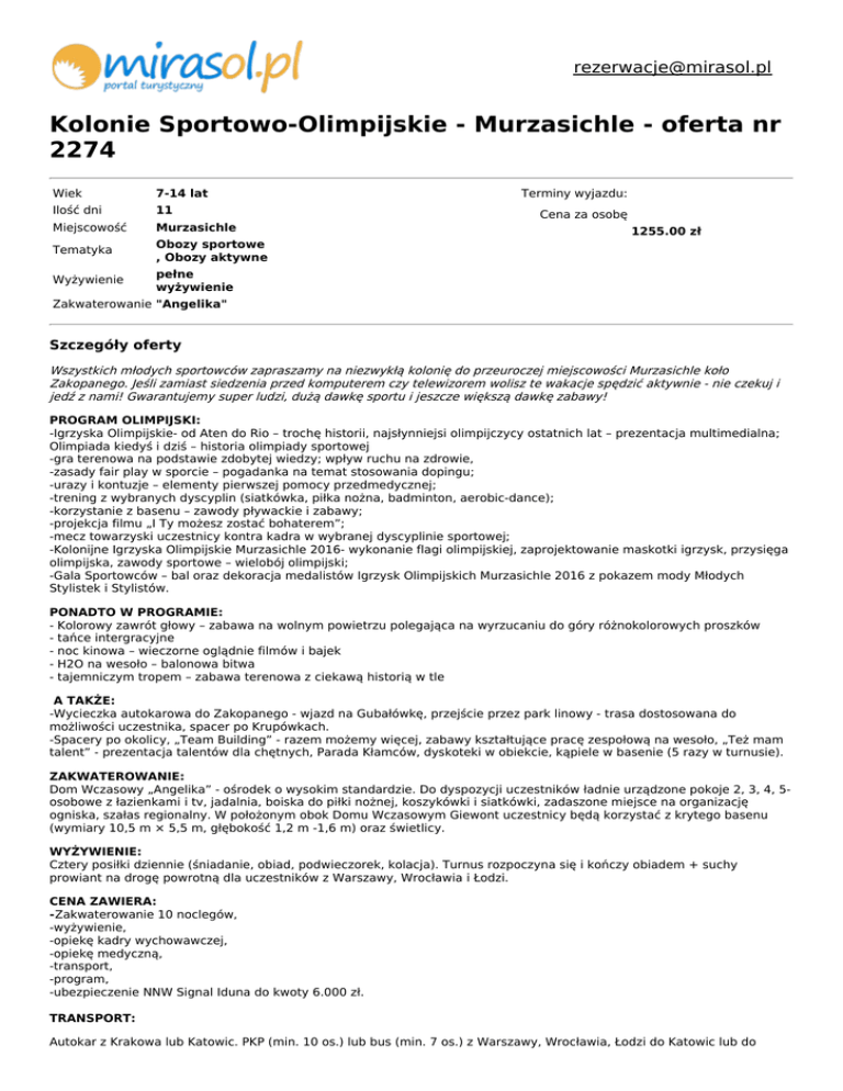 [email protected] Kolonie Sportowo-Olimpijskie - Murzasichle - oferta nr 2274 Wiek 7-14 lat Ilość dni 11 Miejscowość Murzasichle Tematyka Obozy sportowe , Obozy aktywne Wyżywienie pełne wyżywienie Terminy wyjazdu: Cena za osobę 1255.00 zł Zakwaterowanie "Angelika" Szczegóły oferty Wszystkich młodych sportowców zapraszamy na niezwykłą kolonię do przeuroczej miejscowości Murzasichle koło Zakopanego. Jeśli zamiast siedzenia przed komputerem czy telewizorem wolisz te wakacje spędzić aktywnie - nie czekuj i jedź z nami! Gwarantujemy super ludzi, dużą dawkę sportu i jeszcze większą dawkę zabawy! PROGRAM OLIMPIJSKI: -Igrzyska Olimpijskie- od Aten do Rio – trochę historii, najsłynniejsi olimpijczycy ostatnich lat – prezentacja multimedialna; Olimpiada kiedyś i dziś – historia olimpiady sportowej -gra terenowa na podstawie zdobytej wiedzy; wpływ ruchu na zdrowie, -zasady fair play w sporcie – pogadanka na temat stosowania dopingu; -urazy i kontuzje – elementy pierwszej pomocy przedmedycznej; -trening z wybranych dyscyplin (siatkówka, piłka nożna, badminton, aerobic-dance); -korzystanie z basenu – zawody pływackie i zabawy; -projekcja filmu „I Ty możesz zostać bohaterem”; -mecz towarzyski uczestnicy kontra kadra w wybranej dyscyplinie sportowej; -Kolonijne Igrzyska Olimpijskie Murzasichle 2016- wykonanie flagi olimpijskiej, zaprojektowanie maskotki igrzysk, przysięga olimpijska, zawody sportowe – wielobój olimpijski; -Gala Sportowców – bal oraz dekoracja medalistów Igrzysk Olimpijskich Murzasichle 2016 z pokazem mody Młodych Stylistek i Stylistów. PONADTO W PROGRAMIE: - Kolorowy zawrót głowy – zabawa na wolnym powietrzu polegająca na wyrzucaniu do góry różnokolorowych proszków - tańce intergracyjne - noc kinowa – wieczorne oglądnie filmów i bajek - H2O na wesoło – balonowa bitwa - tajemniczym tropem – zabawa terenowa z ciekawą historią w tle A TAKŻE: -Wycieczka autokarowa do Zakopanego - wjazd na Gubałówkę, przejście przez park linowy - trasa dostosowana do możliwości uczestnika, spacer po Krupówkach. -Spacery po okolicy, „Team Building” - razem możemy więcej, zabawy kształtujące pracę zespołową na wesoło, „Też mam talent” - prezentacja talentów dla chętnych, Parada Kłamców, dyskoteki w obiekcie, kąpiele w basenie (5 razy w turnusie). ZAKWATEROWANIE: Dom Wczasowy „Angelika” - ośrodek o wysokim standardzie. Do dyspozycji uczestników ładnie urządzone pokoje 2, 3, 4, 5osobowe z łazienkami i tv, jadalnia, boiska do piłki nożnej, koszykówki i siatkówki, zadaszone miejsce na organizację ogniska, szałas regionalny. W położonym obok Domu Wczasowym Giewont uczestnicy będą korzystać z krytego basenu (wymiary 10,5 m × 5,5 m, głębokość 1,2 m -1,6 m) oraz świetlicy. WYŻYWIENIE: Cztery posiłki dziennie (śniadanie, obiad, podwieczorek, kolacja). Turnus rozpoczyna się i kończy obiadem + suchy prowiant na drogę powrotną dla uczestników z Warszawy, Wrocławia i Łodzi. CENA ZAWIERA: -Zakwaterowanie 10 noclegów, -wyżywienie, -opiekę kadry wychowawczej, -opiekę medyczną, -transport, -program, -ubezpieczenie NNW Signal Iduna do kwoty 6.000 zł. TRANSPORT: Autokar z Krakowa lub Katowic. PKP (min. 10 os.) lub bus (min. 7 os.) z Warszawy, Wrocławia, Łodzi do Katowic lub do Krakowa, dalej autokarem do obiektu. Przy mniejszej ilości uczestników z wyżej wymienionych miast dopłata (+50 zł/os.). Jak rezerwować Aby wstępnie zarezerwować wyjazd, Klient powinien: -podać w wyszukiwarce parametry obozu/kolonii , którymi jest zainteresowany . (np. kraj, miasto, tematykę wyjazdu, wiek itp.) i kliknąć Wyszukaj oferty -po wyświetleniu wyników wyszukiwania przeczytać opisy wyjazdów, wybrać jeden z nich i kliknąć Przejdź do rezerwacji , gdzie znajduje się Formularz rezerwacyjny -wypełnić Formularz rezerwacyjny, w którym należy podać prawidłowe dane osobowe uczestników wyjazdu, niezbędne do dokonania rezerwacji -po wprowadzeniu danych zaakceptować Regulamin i Warunki uczestnictwa Organizatora imprezy turystycznej (znajdujące się przy opisie oferty) i kliknąć Wyślij Kolejne kroki: - po potwierdzeniu telefonicznym i mailowym przezKonsultanta mirasol.pl dostępności miejsc i otrzymaniu mailem Potwierdzenia rezerwacji, należy wpłacić wymaganą zaliczkę lub całą kwotę za wyjazd - w momencie dokonania wpłaty zawarta zostaje Umowa pomiędzy Klientem a Organizatorem imprezy za pośrednictwem Agenta (mirasol.pl) i jest to równoznaczne z akceptacją przez KlientaUmowy i Warunków Uczestnictwa Organizatora. - w ustalonym przez Organizatora terminie Klient zobowiązany jest dowpłacenia pełnej opłaty za wyjazd oraz do dostarczenia wymaganych przez Organizatora dokumentów -po przesłaniu pełnej wpłaty i dokumentów Klient otrzyma drogą mailową dokumenty podróżne (skierowanie), które zawierają wszystkie niezbędne informacje na temat imprezy turystycznej oraz dojazdu i są podstawą przyjęcia uczestnika na obóz / kolonię.