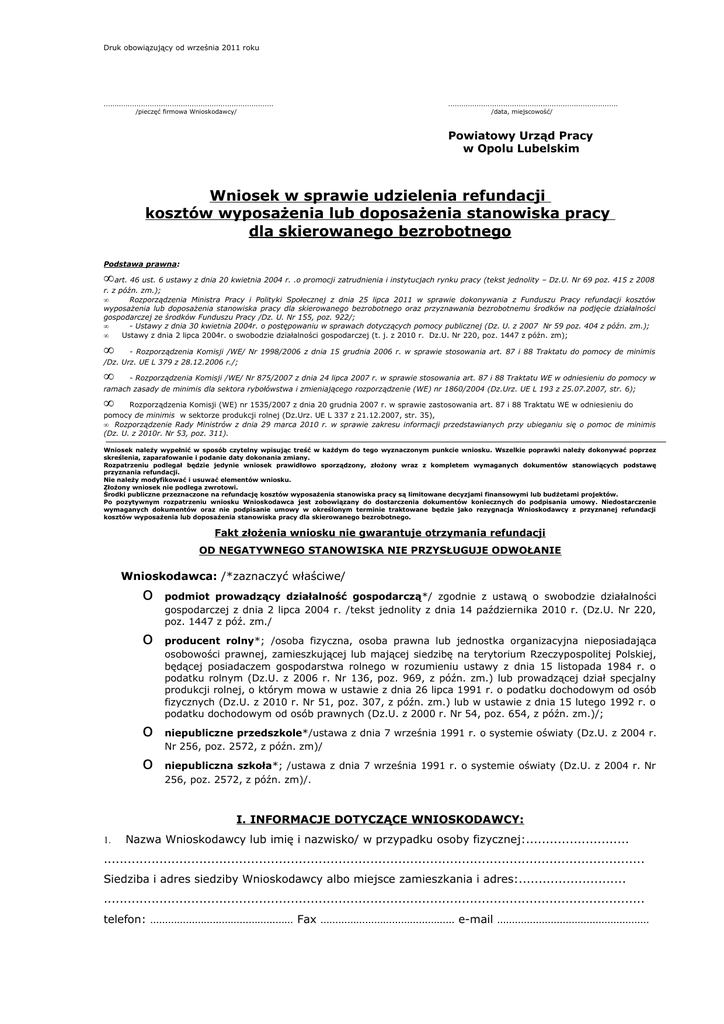 Druk obowiązujący od września 2011 roku ............................................................................. /pieczęć firmowa Wnioskodawcy/ ............................................................................. /data, miejscowość/ Powiatowy Urząd Pracy w Opolu Lubelskim Wniosek w sprawie udzielenia refundacji kosztów wyposażenia lub doposażenia stanowiska pracy dla skierowanego bezrobotnego Podstawa prawna: • art. 46 ust. 6 ustawy z dnia 20 kwietnia 2004 r. .o promocji zatrudnienia i instytucjach rynku pracy (tekst jednolity – Dz.U. Nr 69 poz. 415 z 2008 r. z późn. zm.); • Rozporządzenia Ministra Pracy i Polityki Społecznej z dnia 25 lipca 2011 w sprawie dokonywania z Funduszu Pracy refundacji kosztów wyposażenia lub doposażenia stanowiska pracy dla skierowanego bezrobotnego oraz przyznawania bezrobotnemu środków na podjęcie działalności gospodarczej ze środków Funduszu Pracy /Dz. U. Nr 155, poz. 922/; • - Ustawy z dnia 30 kwietnia 2004r. o postępowaniu w sprawach dotyczących pomocy publicznej (Dz. U. z 2007 Nr 59 poz. 404 z późn. zm.); • Ustawy z dnia 2 lipca 2004r. o swobodzie działalności gospodarczej (t. j. z 2010 r. Dz.U. Nr 220, poz. 1447 z późn. zm); • - Rozporządzenia Komisji /WE/ Nr 1998/2006 z dnia 15 grudnia 2006 r. w sprawie stosowania art. 87 i 88 Traktatu do pomocy de minimis /Dz. Urz. UE L 379 z 28.12.2006 r./; • - Rozporządzenia Komisji /WE/ Nr 875/2007 z dnia 24 lipca 2007 r. w sprawie stosowania art. 87 i 88 Traktatu WE w odniesieniu do pomocy w ramach zasady de minimis dla sektora rybołówstwa i zmieniającego rozporządzenie (WE) nr 1860/2004 (Dz.Urz. UE L 193 z 25.07.2007, str. 6); • Rozporządzenia Komisji (WE) nr 1535/2007 z dnia 20 grudnia 2007 r. w sprawie zastosowania art. 87 i 88 Traktatu WE w odniesieniu do pomocy de minimis w sektorze produkcji rolnej (Dz.Urz. UE L 337 z 21.12.2007, str. 35), • Rozporządzenie Rady Ministrów z dnia 29 marca 2010 r. w sprawie zakresu informacji przedstawianych przy ubieganiu się o pomoc de minimis (Dz. U. z 2010r. Nr 53, poz. 311). Wniosek należy wypełnić w sposób czytelny wpisując treść w każdym do tego wyznaczonym punkcie wniosku. Wszelkie poprawki należy dokonywać poprzez skreślenia, zaparafowanie i podanie daty dokonania zmiany. Rozpatrzeniu podlegał będzie jedynie wniosek prawidłowo sporządzony, złożony wraz z kompletem wymaganych dokumentów stanowiących podstawę przyznania refundacji. Nie należy modyfikować i usuwać elementów wniosku. Złożony wniosek nie podlega zwrotowi. Środki publiczne przeznaczone na refundację kosztów wyposażenia stanowiska pracy są limitowane decyzjami finansowymi lub budżetami projektów. Po pozytywnym rozpatrzeniu wniosku Wnioskodawca jest zobowiązany do dostarczenia dokumentów koniecznych do podpisania umowy. Niedostarczenie wymaganych dokumentów oraz nie podpisanie umowy w określonym terminie traktowane będzie jako rezygnacja Wnioskodawcy z przyznanej refundacji kosztów wyposażenia lub doposażenia stanowiska pracy dla skierowanego bezrobotnego. Fakt złożenia wniosku nie gwarantuje otrzymania refundacji OD NEGATYWNEGO STANOWISKA NIE PRZYSŁUGUJE ODWOŁANIE Wnioskodawca: /*zaznaczyć właściwe/ o o o o podmiot prowadzący działalność gospodarczą*/ zgodnie z ustawą o swobodzie działalności gospodarczej z dnia 2 lipca 2004 r. /tekst jednolity z dnia 14 października 2010 r. (Dz.U. Nr 220, poz. 1447 z póź. zm./ producent rolny*; /osoba fizyczna, osoba prawna lub jednostka organizacyjna nieposiadająca osobowości prawnej, zamieszkującej lub mającej siedzibę na terytorium Rzeczypospolitej Polskiej, będącej posiadaczem gospodarstwa rolnego w rozumieniu ustawy z dnia 15 listopada 1984 r. o podatku rolnym (Dz.U. z 2006 r. Nr 136, poz. 969, z późn. zm.) lub prowadzącej dział specjalny produkcji rolnej, o którym mowa w ustawie z dnia 26 lipca 1991 r. o podatku dochodowym od osób fizycznych (Dz.U. z 2010 r. Nr 51, poz. 307, z późn. zm.) lub w ustawie z dnia 15 lutego 1992 r. o podatku dochodowym od osób prawnych (Dz.U. z 2000 r. Nr 54, poz. 654, z późn. zm.)/; niepubliczne przedszkole*/ustawa z dnia 7 września 1991 r. o systemie oświaty (Dz.U. z 2004 r. Nr 256, poz. 2572, z późn. zm)/ niepubliczna szkoła*; /ustawa z dnia 7 września 1991 r. o systemie oświaty (Dz.U. z 2004 r. Nr 256, poz. 2572, z późn. zm)/. I. INFORMACJE DOTYCZĄCE WNIOSKODAWCY: 1. Nazwa Wnioskodawcy lub imię i nazwisko/ w przypadku osoby fizycznej:.......................... ........................................................................................................................................ Siedziba i adres siedziby Wnioskodawcy albo miejsce zamieszkania i adres:........................... ........................................................................................................................................ telefon: ………………………………………… Fax ……………………………………… e-mail …………………………………………… 1 2. Imiona i Nazwiska oraz stanowiska osób upoważnionych do reprezentacji /zgodnie z dokumentem rejestrowym/:............................................... ............................................... 3. 4. Numer ewidencyjny PESEL, w przypadku osoby fizycznej:................................................ . Numer NIP: ……………………………………………………………………………………………………………………………………… 5. Numer REGON:………………………………………………………………………………………………………………………………… 6. Nazwa banku i nr konta: ………………………………………………………………………………………………………………… 7. Data rozpoczęcia działalności ………………………………………………………