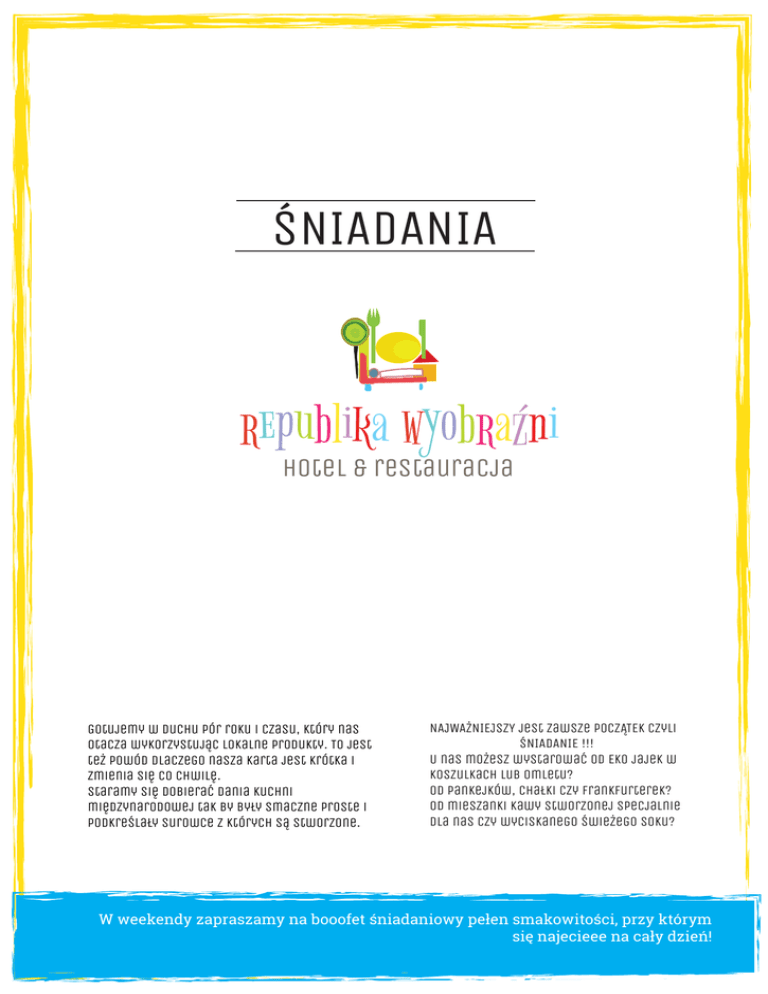 ŚNIADANIA republika wyobraźni hotel & restauracja Gotujemy w duchu pór roku i czasu, który nas otacza wykorzystując lokalne produkty. To jest też powód dlaczego nasza karta jest krótka i zmienia się co chwilę. Staramy się dobierać dania kuchni międzynarodowej tak by były smaczne proste i podkreślały surowce z których są stworzone. NAJWAŻNIEJSZY jest zawsze POCZĄTEK czyli ŚNIADANIE !!! U nas możesz wystarować od Eko jajek w koszulkach lub Omletu? Od Pankejków, Chałki czy Frankfurterek? Od mieszanki kawy stworzonej specjalnie dla nas czy wyciskanego świeżego soku? W weekendy zapraszamy na booofet śniadaniowy pełen smakowitości, przy którym się najecieee na cały dzień! DA -Chałka- Idealna z kawą, dżemem, miodem, nutellą 6 pln -Granola- Z owocami sezonowymi, orzechami i jogurtem greckim 10 pln -Pankejki- Na słodko – cytryna, limonka, miód 12 pln Na słono z boczkiem 12 pln -Owsianka- Na mleku kokosowym z miodem, goździkami i owocami 12 pln -jaja- Jajo albo dwa z wolnego wybiegu z koszykiem pieczywa Jajecznica z trzech jaj ze szczypiorkiem 10 pln Omlet z 5 jaj na słodko lub słono z jednym dodatkiem 15 pln Jajka w koszulkach na chrupiących tostach oblane sosem holenderskim z szynką lub szpinakiem 15 pln Jajka zapieczone w kokilkach z szynką i pomidorem lub szpinakiem i parmezanem 15 pln Jajko na miękko, twardo lub sadzone 4 pln/sztuka -DODATKI - do omletu, jajecznicy, pieczywa -Parmezan lub twaróg 5 pln -Deska serów lub deska wędlin od Czabana 10 pln -Szynka lub boczek 4 pln -Sałata 8 pln -Szpinak blanszowany 8 pln -Pomidorki mini 8 pln -Kiełbaski- Prawdziwe parówki z wody lub frankfurterki z patelni z pieczywem masłem i musztadą 15 pln -Kanapka- a może bułka prosto z piekarni Spytaj dzisiaj jakie dodatki 10 pln NI A NA PO -Koktail śniadaniowy- JE Mleko, nutella, banan, masło orzechowe 10 pln -Smooothis lub milk shake- Groszek + banan lub truskawka + rabarbar 10 pln -Napoje Ziiiimneeee- Kompoty z owoców od lokalnych sadowników 8 pln Wyciskany świeżo cytrusowy sok ze słomką lub bez 10 pln Tłoczone na zimno gęste soki z polskich owocow od Łosia 8 pln Cola Cola, tonik i inne takie 4 pln Woda Beskidska w szkle 4 pln ŻYCZYMY SMACZNEGO bon appetit