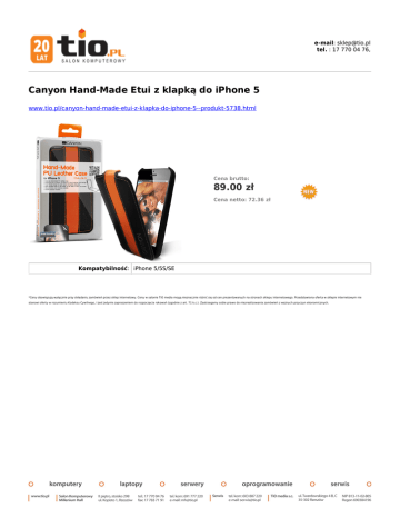 e-mail: [email protected] tel. : 17 770 04 76, Canyon Hand-Made Etui z klapką do iPhone 5 www.tio.pl/canyon-hand-made-etui-z-klapka-do-iphone-5--produkt-5738.html Cena brutto: 89.00 zł Cena netto: 72.36 zł Kompatybilność: iPhone 5/5S/SE *Ceny obowiązują wyłącznie przy składaniu zamówień przez sklep internetowy. Ceny w salonie TiO media mogą nieznacznie różnić się od cen prezentowanych na stronach sklepu internetowego. Przedstawiona oferta w sklepie internetowym nie stanowi oferty w rozumieniu Kodeksu Cywilnego, i jest jedynie zaproszeniem do rozpoczęcia rokowań (zgodnie z art. 71 k.c.). Zastrzegamy sobie prawo do niezrealizowania zamówień z ważnych przyczyn ekonomicznych.
