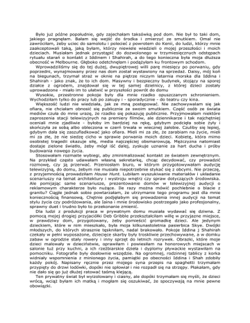 Było juŜ późne popołudnie, gdy zajechałam taksówką pod dom. Nie był to taki dom, jakiego pragnęłam. Bałam się wejść do środka i zmierzyć ze smutkiem. Omal nie zawróciłam, Ŝeby uciec do samolotu i polecieć z powrotem do Kenii, do ludzi, którzy mnie zaakceptowali taką, jaką byłam, którzy niewiele wiedzieli o mojej przeszłości i moich dzieciach. Musiałam jednak przystąpić do dozwolonego w trzymiesięcznych odstępach rytuału starań o kontakt z Iddinem i Shahirah, a do tego konieczna była moja dłuŜsza obecność w Melbourne. Głęboko odetchnęłam i podąŜyłam ku frontowym schodom. Wprowadziliśmy się do tej duŜej, dwupiętrowej willi parę miesięcy po porwaniu, gdy poprzedni, wynajmowany przez nas dom został wystawiony na sprzedaŜ. Daisy, mój koń na biegunach, trzymał straŜ w oknie na piętrze niczym latarnia morska dla Iddina i Shahirah - jako znak, Ŝe to ich dom. Masywny i bezpieczny budynek, stojący na sporej działce z ogrodem, znajdował się w tej samej dzielnicy, z której dzieci zostały uprowadzone - miało im to ułatwić w przyszłości powrót do domu Wysokie, przestronne pokoje były dla mnie rzadko opuszczanym schronieniem. Wychodziłam tylko do pracy lub po zakupy i - sporadycznie - do teatru czy kina. Większość ludzi nie wiedziała, jak ze mną postępować. Nie zachowywalam się jak ofiara, nie chciałam obnosić się publicznie ze swoim smutkiem. Część osób ze świata mediów czuła do mnie urazę, Ŝe rzadko się pokazuję publicznie. Przyjmowałam niektóre zaproszenia stacji telewizyjnych na premiery filmów, ale dziennikarze i tak najchętniej oceniali mnie zjadliwie - byłoby im bardziej na rękę, gdybym podcięła sobie Ŝyły i skończyła ze sobą albo obleczona w czerń trwała w wiecznej Ŝałobie. Czuliby się lepiej, gdybym dała się zaszufladkować jako ofiara. Mieli mi za złe, Ŝe zarabiam na Ŝycie, mieli mi za złe, Ŝe nie siedzę cicho w sprawie porwania moich dzieci. Kobietę, która mimo osobistej tragedii okazuje siłę, media najczęściej obsmarowują. MęŜczyzna natomiast dostaje zielone światło, Ŝeby mógł iść dalej, zyskuje uznanie za hart ducha i próby budowania nowego Ŝycia. Stosowałam rozmaite wybiegi, aby zminimalizować kontakt ze światem zewnętrznym. Na przykład często udawałam własną sekretarkę, chcąc decydować, czy prowadzić rozmowę, czy ją przerwać. Przeniosłam biuro, w którym przygotowywałam audycję telewizyjną, do domu, Ŝebym nie musiała niepotrzebnie stykać się z obcymi. Nie przeczę, z przyjemnością prowadziłam House Hunt. Lubiłam wyszukiwanie materiałów i układanie scenariuszy na temat architektury i wystroju wnętrz czy spraw dotyczących środowiska. Ale pomijając same scenariusze, prezentowanie domów w telewizyjnej audycji o reklamowym charakterze było nuŜące. Ile razy moŜna mówić pochlebnie o blacie z granitu? Ciągle jednak sobie powtarzałam, Ŝe utrzymanie tego programu jest dla mnie koniecznością finansową. Chętnie podjęłabym się prowadzenia innej audycji na temat stylu Ŝycia czy podróŜowania, ale Iaina i mnie środowisko postrzegało jako profesjonalny, sprawny duet i trudno było to przekonanie zmienić. Dla ludzi z produkcji praca w prywatnym domu musiała wydawać się dziwna. Z pomocą mojej drogiej przyjaciółki Deb Gribble przekształciłam willę w przyjazne miejsce, w prawdziwy dom, przygotowany, Ŝeby pomieścić gromadkę dzieci. Ale jedynym dzieckiem, które w nim mieszkało, była moja kilkunastoletnia pasierbica Skye. Dwójki młodszych, do których strasznie tęskniłam, nadal brakowało. Pokoje Iddina j Shahirah czekały w pełni wyposaŜone, dziecięce skarby były troskliwie przechowywane, a w domku zabaw w ogrodzie stały rowery i inny sprzęt do letnich rozrywek. Obrazki, które moje dzieci malowały w dzieciństwie, oprawiłam i powiesiłam na honorowych miejscach w salonie tuŜ przy kuchni, a ich rzeźbiarskie dzieła i dyplomy pływackie wystawiłam na pomocniku. Fotografie były dosłownie wszędzie. Na ogromnej, rodzinnej tablicy z korka widniały wspomnienia z minionego Ŝycia, pamiątki po obecności Iddina i Shah zdobiły kaŜdy pokój. Napisany ręcznie przez mojego syna przepis na spaghetti trzymałam przypięty do drzwi lodówki, dopóki nie spłowiał i nie rozpadł się na strzępy. Płakałam, gdy nie dało się go juŜ dłuŜej ratować taśmą klejącą. Ten prywatny świat był wyizolowany i ciasny, ale dopóki trzymałam się myśli, Ŝe dzieci wrócą, wciąŜ byłam ich matką i mogłam się oszukiwać, Ŝe spoczywają na mnie pewne obowiązki. W domu miałam teŜ kilka rzeczy, na które nie mogłam patrzeć albo o których nie mogłam myśleć spokojnie. Jedną z nich była maszyna do szycia. Robótki ręczne stanowiły tak waŜną część mojego wspólnego Ŝycia z dziećmi, Ŝe teraz samo jej dotykanie sprawiało mi wielki ból. Poza tym nie zostało we mnie nic z dawnej weny twórczej. Po uprowadzeniu dzieci szyłam na maszynie tylko dwukrotnie: raz, gdy przyjaciółka wychodziła za mąŜ i poprosiła mnie o stworzenie specjalnej kreacji dla jej maleńkiego synka, a potem, kiedy Skye nalegała, Ŝebym uszyła jej sukienkę na zabawę szkolną. Czerwoną krepę, którą wybrała sobie na wieczorowy strój, skroiłam na stole w jadalni, a potem pospinałam poszczególne kawałki szpilkami. W czasie pierwszej miary Skye zachwycała się tą sukienką, tak jak potrafią to robić tylko nastolatki. Natomiast mnie ogarnęło potworne przygnębienie. Przy pierwszej sposobności zamknęłam się w łazience na piętrze i udając, Ŝe biorę prysznic, wypłakałam cały Ŝal, całą tę niewiarygodnie duŜą dawkę smutku, która się we mnie zebrała. Chciałam szyć dla mojej pasierbicy, ale chciałam teŜ szyć dla moich biologicznych dzieci. Wykonywałam własnoręcznie ubranka i inne drobiazgi dla Iddina i Shah, jeszcze zanim przyszli na świat - te zajęcia stanowił