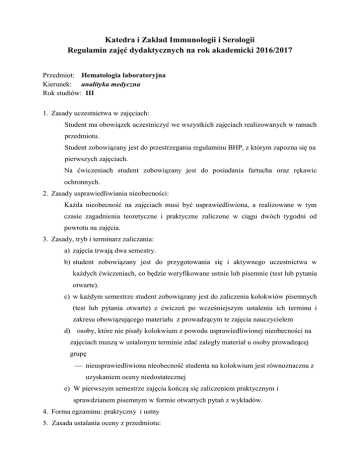 Katedra i Zakład Immunologii i Serologii Regulamin zajęć dydaktycznych na rok akademicki 2016/2017 Przedmiot: Hematologia laboratoryjna Kierunek: analityka medyczna Rok studiów: III 1. Zasady uczestnictwa w zajęciach: Student ma obowiązek uczestniczyć we wszystkich zajęciach realizowanych w ramach przedmiotu. Student zobowiązany jest do przestrzegania regulaminu BHP, z którym zapozna się na pierwszych zajęciach. Na ćwiczeniach student zobowiązany jest do posiadania fartucha oraz rękawic ochronnych. 2. Zasady usprawiedliwiania nieobecności: Każda nieobecność na zajęciach musi być usprawiedliwiona, a realizowane w tym czasie zagadnienia teoretyczne i praktyczne zaliczone w ciągu dwóch tygodni od powrotu na zajęcia. 3. Zasady, tryb i terminarz zaliczania: a) zajęcia trwają dwa semestry. b) student zobowiązany jest do przygotowania się i aktywnego uczestnictwa w każdych ćwiczeniach, co będzie weryfikowane ustnie lub pisemnie (test lub pytania otwarte). c) w każdym semestrze student zobowiązany jest do zaliczenia kolokwiów pisemnych (test lub pytania otwarte) z ćwiczeń po wcześniejszym ustaleniu ich terminu i zakresu obowiązującego materiału z prowadzącym te zajęcia nauczycielem d) osoby, które nie pisały kolokwium z powodu usprawiedliwionej nieobecności na zajęciach muszą w ustalonym terminie zdać zaległy materiał u osoby prowadzącej grupę nieusprawiedliwiona nieobecność studenta na kolokwium jest równoznaczna z uzyskaniem oceny niedostatecznej e) W pierwszym semestrze zajęcia kończą się zaliczeniem praktycznym i sprawdzianem pisemnym w formie otwartych pytań z wykładów. 4. Forma egzaminu: praktyczny i ustny 5. Zasada ustalania oceny z przedmiotu: Ocena z przedmiotu ustalana jest na podstawie oceny z egzaminu praktycznego i teoretycznego. 6. Sposób informowania studentów o uzyskanych wynikach zaliczeń: Wyniki zaliczenia student uzyskuje osobiście u osoby prowadzącej zajęcia 7. Sposób konsultacji z nauczycielem akademickim: Godziny konsultacji z nauczycielem ustalane są ze studentami na pierwszych zajęciach. Informacja ta podana jest w gablocie Katedry. 8. Możliwość wglądu do prac pisemnych studenta: Zgodnie z § 14 pkt. 20 Regulaminu studiów "Student ma prawo do wglądu do swojej ocenionej pracy zaliczeniowej lub egzaminacyjnej wraz z treścią pytań i kluczem odpowiedzi, w terminie 5 dni od ogłoszenia wyników zaliczenia lub egzaminu.