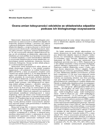 OCHRONA ŚRODOWISKA Vol. 33 2011 Nr 2 Mirosław Szyłak-Szydłowski Ocena zmian toksyczności odcieków ze składowiska odpadów podczas ich biologicznego oczyszczania Opracowanie skutecznych metod zapobiegania przedostawaniu się zanieczyszczeń ze składowisk odpadów do środowiska gruntowo-wodnego i powietrza jest jednym z głównych problemów inżynierii środowiska. Odcieki ze składowisk odpadów, z uwagi na obecność w nich licznych zanieczyszczeń chemicznych i mikrobiologicznych, stanowią także poważne zagrożenie sanitarno-epidemiologiczne. W celu oczyszczenia odcieków składowiskowych stosuje się ich recyrkulację na składowisku, odprowadza do kanalizacji, po czym poddaje się je łącznemu oczyszczaniu ze ściekami miejskimi, a często unieszkodliwia oddzielnie w oczyszczalni zlokalizowanej na terenie składowiska, wykorzystującej metody mechaniczne, chemiczne, fizycznochemiczne, biologiczne. Stosuje się także układy połączone z wykorzystaniem tych metod. Skuteczność metod biologicznych zależy głównie od składu chemicznego ścieków, w tym rodzaju związków organicznych i ich podatności na rozkład biochemiczny ([BZT5]/[ChZT]), a także od zawartości związków azotu i fosforu oraz metali ciężkich [1, 2]. Na skład odcieków ma wpływ wiek składowiska, stąd też metody biologiczne są głównie przydatne do oczyszczania odcieków pochodzących z młodych składowisk, w których związki organiczne występują w postaci łatwo biodegradowalnej. Klasyczne metody osadu czynnego i złóż biologicznych nie zapewniają jednak pełnego usunięcia z odcieków zanieczyszczeń chemicznych i biologicznych. Dlatego w ostatnich latach zwraca się dużą uwagę na wykorzystanie do tego celu metody osadu czynnego w sekwencyjnych reaktorach porcjowych (SBR). Zaletą tych reaktorów jest możliwość wprowadzania modyfikacji technologicznych w trakcie eksploatacji, takich jak zmiana czasu trwania poszczególnych faz, długości cyklu pracy czy sposobu doprowadzania ścieków [3]. Charakteryzują się one również małą wrażliwością na obecność substancji toksycznych, prostotą obsługi, wysoką jakością ścieków oczyszczonych, optymalnym zużyciem energii i małą powierzchnią w stosunku do reaktorów przepływowych. Biorąc pod uwagę fakt, iż rutynowe badania chemiczne ścieków dopływających i odpływających z reaktorów biologicznych nie uwzględniają obecności wszystkich związków występujących w ściekach, w niniejszej pracy określono toksyczność ścieków w odniesieniu do czterech przedstawicieli organizmów wodnych. Celem pracy było określenie możliwości zastosowania wybranych testów Dr inż. M. Szyłak-Szydłowski: Politechnika Warszawska, Wydział Inżynierii Środowiska, Zakład Ochrony i Kształtowania Środowiska, ul. Nowowiejska 20, 00–653 Warszawa, [email protected] toksykologicznych do oceny zmiany toksyczności odcieków ze składowiska odpadów podczas ich biologicznego oczyszczania. Obiekt i metodyka badań Do badań zastosowano odcieki odprowadzane systemem drenażowym do studni zbiorczej znajdującej się przy składowisku odpadów innych niż obojętne i niebezpieczne, tzw. komunalnych, zlokalizowanym w południowo-wschodniej części Otwocka. Składowisko odpadów funkcjonuje od 1998 r., a planowane zakończenie jego eksploatacji przewidywane jest w 2028 r. Deponowane są w nim odpady komunalne o dużej zawartości biodegradowalnych substancji organicznych w ilości około 110 t/d. Planowana wielkość składowiska wynosi 1,2 mln t, natomiast obecnie zdeponowano 520 tys. t odpadów. Podłoże składowiska jest izolowane geomembraną PEHD o grubości 2 mm. Składowanie odpadów jest kwaterowe, na działkach o miąższości 1,5÷2 m, przy czym miąższość warstw izolacyjnych wynosi 0,15 m. Na terenie składowiska prowadzony jest monitoring odcieków oraz ilości powstającego gazu składowiskowego, a także stanu jakości wód powierzchniowych i podziemnych w pobliżu składowiska. Odcieki ze składowiska charakteryzowały się następującymi wskaźnikami: ChZT – 3080 gO2/m3, ogólny węgiel organiczny – 133÷1661 gC/m3, [BZT5]/[ChZT]=0,092÷0,475, siarczany – 58÷357 gSO42–/m3, [SO42–]/[Cl–]=0,026÷0,131, miedź – 0,014÷0,428 gCu/m3, cynk – 0,096÷6,943 gZn/m3, ołów – 0,049÷0,526 gPb/m3, kadm – 0,003÷0,049 gCd/m3, chrom – 0,038÷0,720 gCr/m3, rtęć – 0,001÷0,006 gHg/m3, przewodność właściwa – 7,4÷22,1 mS/cm, pH=7,2÷7,7 [4]. Proces oczyszczania odcieków prowadzono w modelowym sekwencyjnym reaktorze porcjowym (SBR) o pojemności roboczej 6,9 dm3, wyposażonym w mieszadło oraz system napowietrzania drobnopęcherzykowego, zapewniający zawartość tlenu w ilości 2 gO2/m3. Jako zaszczepienie reaktora zastosowano osad czynny pobrany z oczyszczalni ścieków komunalnych w Piasecznie pod Warszawą. Zawartość osadu w reaktorze utrzymywano w zakresie 3÷4 g/dm3 (w stosunku do całej objętości reaktora). Zawartość zawiesin lotnych w osadzie wynosiła średnio 67%, a mineralnych 33%. Proces oczyszczania prowadzono przy hydraulicznym czasie przetrzymania odcieków wynoszącym 16 h, przy obciążeniu osadu ładunkiem ChZT w zakresie 0,23÷1,64 gO2/g·d, uzyskiwanym przez zwiększenie udziału odcieków (1%, 3%, 5%, 10%, 15%, 20% i 30%) w mieszaninie ze ściekami syntetycznymi przygotowanymi 66 M. Szyłak-Szydłowski zgodnie z recepturą podaną w pracy [5]. Układ badawczy pracował w systemie trzech 8-godz. cykli na dobę. Każdy z nich składał się z 45-min. fazy napełniania, 30-min. mieszania, 130-min. napowietrzania, 45-min. mieszania, 110-min. napowietrzania, 90-min. sedymentacji i 30-min. dekantacji (w tym dekantacja 25 min i faza martwa 5 min). Parametry te określono doświadczalnie w badaniach monitoringowych, polegających na wielokrotnej kontroli charakterystyki odcieków podczas trwania cyklu w zmiennych warunkach tlenowych. Reaktor pracował w temperaturze 20÷