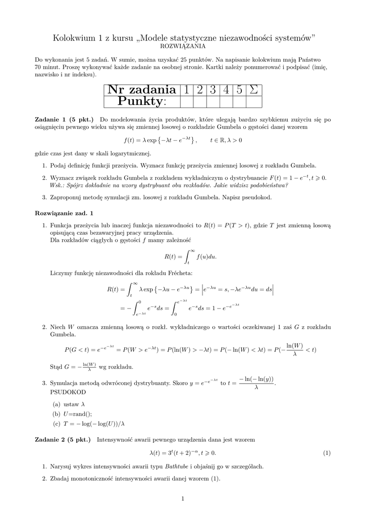 Kolokwium 1 z kursu „Modele statystyczne niezawodności systemów”