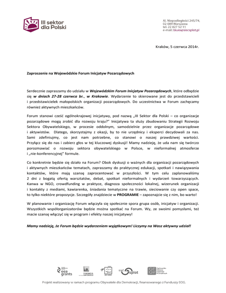 Kraków, 5 czerwca 2014r. Zaproszenie na Wojewódzkie Forum Inicjatyw Pozarządowych Serdecznie zapraszamy do udziału w Wojewódzkim Forum Inicjatyw Pozarządowych, które odbędzie się w dniach 27-28 czerwca br., w Krakowie. Wydarzenie to skierowane jest do przedstawicieli i przedstawicielek małopolskich organizacji pozarządowych. Do uczestnictwa w Forum zachęcamy również aktywnych mieszkańców. Forum stanowi cześć ogólnokrajowej inicjatywy, pod nazwą „III Sektor dla Polski – co organizacje pozarządowe mogą zrobić dla rozwoju kraju?” Inicjatywa ta służy zbudowaniu Strategii Rozwoju Sektora Obywatelskiego, w procesie oddolnym, samodzielnie przez organizacje pozarządowe i aktywistów. Dlatego, skorzystajmy z okazji, by to nie urzędnicy i eksperci decydowali za nas. Sami zdefiniujmy, co jest nam potrzebne, co stanowi o naszej prawdziwej wartości. Przyłącz się do nas i zabierz głos w tej kluczowej dyskusji! Mamy nadzieję, że uda nam się twórczo porozmawiać o rozwoju sektora obywatelskiego w Polsce, w nieformalnej atmosferze i „nie-konferencyjnej” formule. Co konkretnie będzie się działo na Forum? Obok dyskusji o ważnych dla organizacji pozarządowych i aktywnych mieszkańców tematach, zapraszamy do praktycznej edukacji, spotkań i nawiązywania kontaktów, które mają szansę zaprocentować w przyszłości. W tym celu zaplanowaliśmy 2 dni z bogatą ofertą warsztatów, debat, spotkań nieformalnych i wydarzeń towarzyszących. Kanwa w NGO, crowdfunding w praktyce, diagnoza społeczności lokalnej, wizerunek organizacji i kontakty z mediami, kawiarenka, śniadania tematyczne na trawie, sieciowanie czy open space, to tylko niektóre propozycje. Szczegóły znajdziecie w PROGRAMIE – zapoznajcie się z nim, bo warto! W planowanie i organizację Forum włączyła się społecznie spora grupa osób, inicjatyw i organizacji. Wszystkich współorganizatorów będzie można spotkać na Forum. Wy, ze swoimi pomysłami, też macie szansę włączyć się w program i efekty naszej inicjatywy! Mamy nadzieję, że Forum będzie wydarzeniem wyjątkowym! Liczymy na Wasz aktywny udział! Aby zgłosić chęć uczestnictwa w Wojewódzkim Forum Inicjatyw Pozarządowych należy uzupełnić i wysłać elektroniczny FORMULARZ ZGŁOSZENIA, w terminie do dnia 18 czerwca br. Ważne jest, aby zgłaszający się wzięli udział w całym wydarzeniu. Dla ułatwienia, dla osób z poza Krakowa, oferujemy możliwość skorzystania z noclegu. Jednak ze względu na ograniczoną pulę miejsc noclegowych, decydować będzie kolejność zgłoszeń. Nie zwracamy kosztów dojazdu. Uczestników Forum będzie gościł Instytut Socjologii UJ – większość spotkań i warsztatów zostanie zorganizowanych w siedzibie Instytutu, przy ul. Grodzkiej 52, w Krakowie. Do zobaczenia na Wojewódzkim Forum Inicjatyw Pozarządowych! Organizatorzy: Fundacja Biuro Inicjatyw Społecznych Instytut Socjologii Uniwersytetu Jagiellońskiego Współorganizatorzy: Regionalne Centrum Wolontariatu w Krakowie Pracownia Obywatelska TEAM Kraków - Together Everyone Achieves More Free Hugs Kraków Więcej informacji nt. Wojewódzkiego Forum Inicjatyw Pozarządowych można znaleźć na stronie internetowej www.bis-krakow.pl. Wojewódzkie Forum Inicjatyw Pozarządowych organizowane jest w ramach debaty III sektor dla Polski oraz Tygodnia Obywatelskiego w Krakowie.