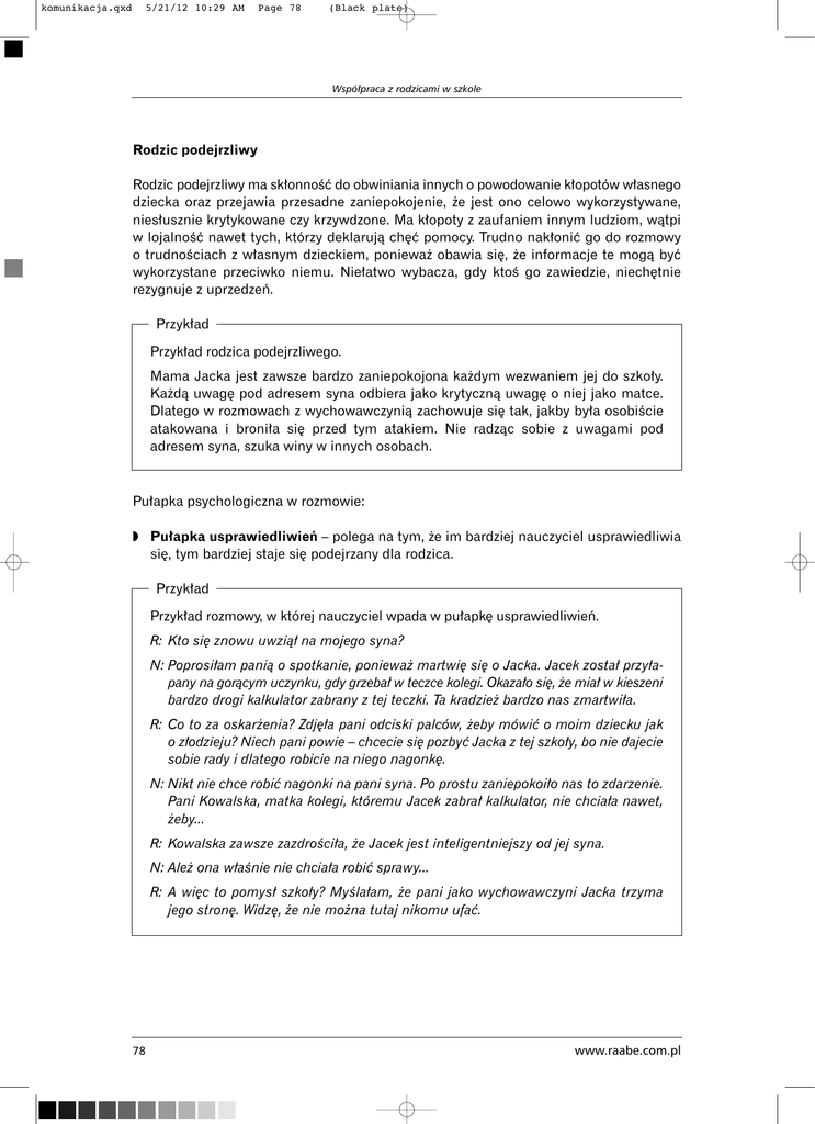 komunikacja.qxd 5/21/12 10:29 AM Page 78 (Black plate) Wspó∏praca z rodzicami w szkole Rodzic podejrzliwy Rodzic podejrzliwy ma sk∏onnoÊç do obwiniania innych o powodowanie k∏opotów w∏asnego dziecka oraz przejawia przesadne zaniepokojenie, ˝e jest ono celowo wykorzystywane, nies∏usznie krytykowane czy krzywdzone. Ma k∏opoty z zaufaniem innym ludziom, wàtpi w lojalnoÊç nawet tych, którzy deklarujà ch´ç pomocy. Trudno nak∏oniç go do rozmowy o trudnoÊciach z w∏asnym dzieckiem, poniewa˝ obawia si´, ˝e informacje te mogà byç wykorzystane przeciwko niemu. Nie∏atwo wybacza, gdy ktoÊ go zawiedzie, niech´tnie rezygnuje z uprzedzeƒ. Przyk∏ad Przyk∏ad rodzica podejrzliwego. Mama Jacka jest zawsze bardzo zaniepokojona ka˝dym wezwaniem jej do szko∏y. Ka˝dà uwag´ pod adresem syna odbiera jako krytycznà uwag´ o niej jako matce. Dlatego w rozmowach z wychowawczynià zachowuje si´ tak, jakby by∏a osobiÊcie atakowana i broni∏a si´ przed tym atakiem. Nie radzàc sobie z uwagami pod adresem syna, szuka winy w innych osobach. Pu∏apka psychologiczna w rozmowie: ◗ Pu∏apka usprawiedliwieƒ – polega na tym, ˝e im bardziej nauczyciel usprawiedliwia si´, tym bardziej staje si´ podejrzany dla rodzica. Przyk∏ad Przyk∏ad rozmowy, w której nauczyciel wpada w pu∏apk´ usprawiedliwieƒ. R: Kto si´ znowu uwzià∏ na mojego syna? N: Poprosi∏am panià o spotkanie, poniewa˝ martwi´ si´ o Jacka. Jacek zosta∏ przy∏apany na goràcym uczynku, gdy grzeba∏ w teczce kolegi. Okaza∏o si´, ˝e mia∏ w kieszeni bardzo drogi kalkulator zabrany z tej teczki. Ta kradzie˝ bardzo nas zmartwi∏a. R: Co to za oskar˝enia? Zdj´∏a pani odciski palców, ˝eby mówiç o moim dziecku jak o z∏odzieju? Niech pani powie – chcecie si´ pozbyç Jacka z tej szko∏y, bo nie dajecie sobie rady i dlatego robicie na niego nagonk´. N: Nikt nie chce robiç nagonki na pani syna. Po prostu zaniepokoi∏o nas to zdarzenie. Pani Kowalska, matka kolegi, któremu Jacek zabra∏ kalkulator, nie chcia∏a nawet, ˝eby... R: Kowalska zawsze zazdroÊci∏a, ˝e Jacek jest inteligentniejszy od jej syna. N: Ale˝ ona w∏aÊnie nie chcia∏a robiç sprawy... R: A wi´c to pomys∏ szko∏y? MyÊla∏am, ˝e pani jako wychowawczyni Jacka trzyma jego stron´. Widz´, ˝e nie mo˝na tutaj nikomu ufaç. 78 www.raabe.com.pl komunikacja.qxd 5/21/12 10:29 AM Page 79 (Black plate) Wspó∏praca z rodzicami w szkole Wskazówki post´powania: ◗ Traktuj rodzica ˝yczliwie i uprzejmie, ale bez uleg∏oÊci. To sprzyja budowaniu atmosfery zaufania i ograniczeniu podejrzeƒ. ◗ Informuj o faktach – to pozwala nieco zmniejszyç podejrzliwoÊç. ◗ Przyjmuj do wiadomoÊci zastrze˝enia, podejrzenia i uprzedzenia rodzica, ale nie potwierdzaj ich, nie próbuj si´ te˝ t∏umaczyç czy usprawiedliwiaç. ◗ Nie staraj si´ przeforsowaç swojego stanowiska za wszelkà cen´. Wycofuj si´ z dyskusji, które wydajà ci si´ bezowocne. ◗ Uwa˝aj z poczuciem humoru – mo˝e byç odczytany jako lekcewa˝enie. ◗ Zapewnij rodzica o swoim zaanga˝owaniu na rzecz jego dziecka, nawet jeÊli czujesz si´ niesprawiedliwie potraktowany. Przyk∏ad Przyk∏ad udanego przebiegu rozmowy. R: Kto si´ znowu uwzià∏ na mojego syna? N: Poprosi∏am panià o spotkanie, poniewa˝ martwi´ si´ o Jacka. Fakty sà takie, ˝e Jacek zosta∏ przy∏apany przeze mnie na goràcym uczynku, gdy grzeba∏ w teczce kolegi. Okaza∏o si´, ˝e mia∏ w kieszeni bardzo drogi kalkulator zabrany z tej teczki. Ta kradzie˝ bardzo mnie zmartwi∏a. R: Co to za oskar˝enia? Zdj´∏a pani odciski palców, ˝eby mówiç o moim dziecku jak o z∏odzieju? Niech pani powie – chcecie si´ pozbyç Jacka z tej szko∏y, bo nie dajecie sobie rady i dlatego robicie na niego nagonk´. N: Rozumiem, ˝e to jest bardzo bolesny fakt. Ja te˝ jestem tym zmartwiona. Jednak faktem jest, ˝e Jacek zabra∏ nie swojà w∏asnoÊç z teczki Adama Kowalskiego. R: Ta Kowalska mnie nie lubi i teraz opini´ mi chce zepsuç. N: Rozumiem, ˝e pani uwa˝a, ˝e Kowalska pani nie lubi. Mnie martwi to, co zrobi∏ Jacek i widz´, ˝e pani te˝ bardzo zale˝y na opinii syna. On b´dzie musia∏ ponieÊç konsekwencje. Ale oprócz tego mo˝emy si´ zastanowiç, co zrobiç w tej sytuacji. R: Mój syn nie jest z∏odziejem! N: Nie chc´ pot´piaç syna jako cz∏owieka, ale pot´piam ten czyn. To, co zrobi∏, to by∏a kradzie˝. I o tym musimy porozmawiaç, bo szkoda by by∏o, ˝eby to zdarzenie ca∏kiem przes∏oni∏o obraz jego osoby. Rodzic wycofany Rodzic wycofujàcy si´ mo˝e byç nieÊmia∏y, zagubiony, zawstydzony, z poczuciem alienacji itp. Mo˝e mieç niskie poczucie w∏asnej wartoÊci, p∏ynàce z niekorzystnych dla siebie porównaƒ spo∏ecznych. Mo˝e te˝ nie lubiç sytuacji spo∏ecznej ekspozycji, takich jak zabieranie g∏osu na forum (np. na zebraniu). Innym powodem wycofania mo˝e byç przyt∏oczenie problemami i obni˝enie nastroju. Obni˝enie energii i motywacji mo˝e sprawiaç, ˝e rodzic wycofujàcy si´ zachowuje wi´kszy dystans ni˝ inni rodzice. Mo˝emy wziàç pod uwag´ tak˝e hipotez´, ˝e wycofanie jest zwyk∏à próbà uciekania od odpowiedzialnoÊci. www.raabe.com.pl 79 komunikacja.qxd 5/21/12 10:29 AM Page 80 (Black plate) Wspó∏praca z rodzicami w szkole Przyk∏ad Przyk∏ad rodzica wycofanego. Gdy zapyta∏em wychowawczyni´ I klasy gimnazjum, co mo˝e powiedzieç mi o ojcu Joasi, zacz´∏a goràczkowo szukaç w pami´ci, o kim mówi´. Z trudnoÊcià przypomnia∏a sobie, jak wyglàda, tak ma∏o rzuca∏ si´ w oczy. Wreszcie powiedzia∏a, ˝e w zasadzie nic o nim nie wie. Pu∏apki psychologiczne w rozmowie: ◗ Pu∏apka rezygnacji z kontaktu – polega na zaniechaniu prób nawiàzania kontaktu z rodzicem. Mo˝e spowodowaç, ˝e dystans rodzic – nauczyciel b´dzie si´ powi´ksza∏ zamiast zmniejszaç. Rodzice wycofani cz´sto potrzebujà uwagi, wsparcia i otuchy. Jednak trudno im si