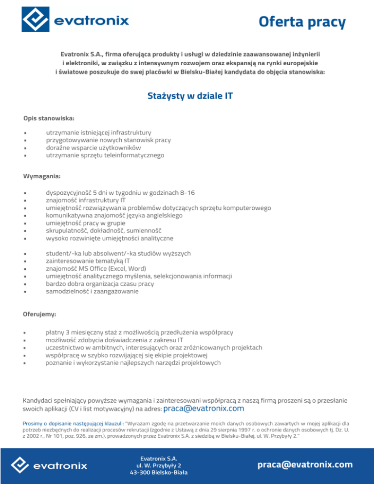 Oferta pracy Evatronix S.A., firma oferująca produkty i usługi w dziedzinie zaawansowanej inżynierii i elektroniki, w związku z intensywnym rozwojem oraz ekspansją na rynki europejskie i światowe poszukuje do swej placówki w Bielsku-Białej kandydata do objęcia stanowiska: Stażysty w dziale IT Opis stanowiska: • • • • utrzymanie istniejącej infrastruktury przygotowywanie nowych stanowisk pracy doraźne wsparcie użytkowników utrzymanie sprzętu teleinformatycznego Wymagania: • • • • • • • dyspozycyjność 5 dni w tygodniu w godzinach 8-16 znajomość infrastruktury IT umiejętność rozwiązywania problemów dotyczących sprzętu komputerowego komunikatywna znajomość języka angielskiego umiejętność pracy w grupie skrupulatność, dokładność, sumienność wysoko rozwinięte umiejętności analityczne • • • • • • student/-ka lub absolwent/-ka studiów wyższych zainteresowanie tematyką IT znajomość MS Office (Excel, Word) umiejętność analitycznego myślenia, selekcjonowania informacji bardzo dobra organizacja czasu pracy samodzielność i zaangażowanie Oferujemy: • • • • • płatny 3 miesięczny staż z możliwością przedłużenia współpracy możliwość zdobycia doświadczenia z zakresu IT uczestnictwo w ambitnych, interesujących oraz zróżnicowanych projektach współpracę w szybko rozwijającej się ekipie projektowej poznanie i wykorzystanie najlepszych narzędzi projektowych Kandydaci spełniający powyższe wymagania i zainteresowani współpracą z naszą firmą proszeni są o przesłanie swoich aplikacji (CV i list motywacyjny) na adres: [email protected] Prosimy o dopisanie następującej klauzuli: "Wyrażam zgodę na przetwarzanie moich danych osobowych zawartych w mojej aplikacji dla potrzeb niezbędnych do realizacji procesów rekrutacji (zgodnie z Ustawą z dnia 29 sierpnia 1997 r. o ochronie danych osobowych tj. Dz. U. z 2002 r., Nr 101, poz. 926, ze zm.), prowadzonych przez Evatronix S.A. z siedzibą w Bielsku-Białej, ul. W. Przybyły 2." Evatronix S.A. ul. W. Przybyły 2 43-300 Bielsko-Biała [email protected]