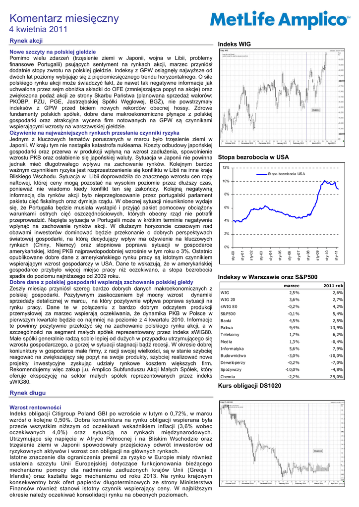 Komentarz miesięczny 4 kwietnia 2011 Rynek długu Wzrost rentowności Indeks obligacji Citigroup Poland GBI po wzroście w lutym o 0,72%, w marcu wzrósł o kolejne 0,50%. Dobra koniunktura na rynku obligacji wspierana była przede wszystkim niższym od oczekiwań wskaźnikiem inflacji (3,6% wobec oczekiwanych 4,0%) oraz sytuacją na rynkach międzynarodowych. Utrzymujące się napięcie w Afryce Północnej i na Bliskim Wschodzie oraz trzęsienie ziemi w Japonii spowodowały przejściowy odwrót inwestorów od ryzykownych aktywów i wzrost cen obligacji na głównych rynkach. Istotne znaczenie dla ograniczenia premii za ryzyko w Europie miały również ustalenia szczytu Unii Europejskiej dotyczące funkcjonowania bieżącego mechanizmu pomocy dla nadmiernie zadłużonych krajów Unii (Grecja i Irlandia) oraz kształtu tego mechanizmu od roku 2013. Na rynku krajowym konsekwentny brak ofert papierów długoterminowych ze strony Ministerstwa Finansów również stanowi istotny czynnik wspierający ceny. W najbliższym okresie należy oczekiwać konsolidacji rynku na obecnych poziomach. Indeks WIG Stopa bezrobocia w USA 12% St opa bezrobocia US A 10% 8% 6% 4% 2% sty- 11 sty-10 s ty-09 sty- 08 sty-07 sty -06 sty- 05 sty-04 sty -03 s ty-02 0% sty-01 Nowe szczyty na polskiej giełdzie Pomimo wielu zdarzeń (trzęsienie ziemi w Japonii, wojna w Libii, problemy finansowe Portugalii) psujących sentyment na rynkach akcji, marzec przyniósł dodatnie stopy zwrotu na polskiej giełdzie. Indeksy z GPW osiągnęły najwyższe od dwóch lat poziomy wybijając się z pięciomiesięcznego trendu horyzontalnego. O sile polskiego rynku akcji może świadczyć fakt, że nawet tak negatywne informacje jak uchwalona przez sejm obniżka składki do OFE (zmniejszająca popyt na akcje) oraz zwiększona podaż akcji ze strony Skarbu Państwa (planowana sprzedaż walorów: PKOBP, PZU, PGE, Jastrzębskiej Spółki Węglowej, BGŻ), nie powstrzymały indeksów z GPW przed biciem nowych rekordów obecnej hossy. Zdrowe fundamenty polskich spółek, dobre dane makroekonomiczne płynące z polskiej gospodarki oraz atrakcyjna wycena firm notowanych na GPW są czynnikami wspierającymi wzrosty na warszawskiej giełdzie. Ożywienie na najważniejszych rynkach przesłania czynniki ryzyka Jednym z kluczowych tematów poruszanych w marcu było trzęsienie ziemi w Japonii. W kraju tym nie nastąpiła katastrofa nuklearna. Koszty odbudowy japońskiej gospodarki oraz przerwa w produkcji wpłyną na wzrost zadłużenia, spowolnienie wzrostu PKB oraz osłabienie się japońskiej waluty. Sytuacja w Japonii nie powinna jednak mieć długotrwałego wpływu na zachowanie rynków. Kolejnym bardzo ważnym czynnikiem ryzyka jest rozprzestrzenienie się konfliktu w Libii na inne kraje Bliskiego Wschodu. Sytuacja w Libii doprowadziła do znacznego wzrostu cen ropy naftowej, której ceny mogą pozostać na wysokim poziomie przez dłuższy czas, ponieważ nie wiadomo kiedy konflikt ten się zakończy. Kolejną negatywną informacją dla rynków akcji było nieprzegłosowanie przez portugalski parlament pakietu cięć fiskalnych oraz dymisja rządu. W obecnej sytuacji nieuniknione wydaje się, że Portugalia będzie musiała wystąpić i przyjąć pakiet pomocowy obciążony warunkami ostrych cięć oszczędnościowych, których obecny rząd nie potrafił przeprowadzić. Napięta sytuacja w Portugalii może w krótkim terminie negatywnie wpłynąć na zachowanie rynków akcji. W dłuższym horyzoncie czasowym nad obawami inwestorów dominować będzie przekonanie o dobrych perspektywach światowej gospodarki, na którą decydujący wpływ ma ożywienie na kluczowych rynkach (Chiny, Niemcy) oraz stopniowa poprawa sytuacji w gospodarce amerykańskiej, której PKB najprawdopodobniej wzrośnie w tym roku o 3%. Ostatnio opublikowane dobre dane z amerykańskiego rynku pracy są istotnym czynnikiem wspierającym wzrost gospodarczy w USA. Dane te wskazują, że w amerykańskiej gospodarce przybyło więcej miejsc pracy niż oczekiwano, a stopa bezrobocia spadła do poziomu najniższego od 2009 roku. Dobre dane z polskiej gospodarki wspierają zachowanie polskiej giełdy Zeszły miesiąc przyniósł szereg bardzo dobrych danych makroekonomicznych z polskiej gospodarki. Pozytywnym zaskoczeniem był mocny wzrost dynamiki sprzedaży detalicznej w marcu, na który pozytywnie wpływa poprawa sytuacji na rynku pracy. Dane te w połączeniu z bardzo dobrym odczytem produkcji przemysłowej za marzec wspierają oczekiwania, że dynamika PKB w Polsce w pierwszym kwartale będzie co najmniej na poziomie z 4 kwartału 2010. Informacje te powinny pozytywnie przełożyć się na zachowanie polskiego rynku akcji, a w szczególności na segment małych spółek reprezentowany przez indeks sWIG80. Małe spółki generalnie radzą sobie lepiej od dużych w przypadku utrzymującego się wzrostu gospodarczego, a gorzej w sytuacji stagnacji bądź recesji. W okresie dobrej koniunktury w gospodarce małe firmy, z racji swojej wielkości, są w stanie szybciej reagować na zwiększający się popyt na swoje produkty, szybciej realizować nowe projekty inwestycyjne zyskując udziały rynkowe kosztem większych firm. Rekomendujemy więc zakup j.u. Amplico Subfunduszu Akcji Małych Spółek, który oferuje ekspozycję na sektor małych spółek reprezentowanych przez indeks sWIG80. sty -00 Rynek akcji Indeksy w Warszawie oraz S&P500 marzec 2011 r ok WIG 2,5 % 2, 6% WIG 20 3,6 % 2, 7% s WIG 8 0 -0,2 % 4, 2% S& P50 0 -0,1 % 5, 4% Banki 4,5 % 2, 5% Pa liwa 9,4 % 1 3, 9% T elekom y 1,7 % 6, 2% Med ia 1,3 % -0, 4% Inform atyka 5,6 % 7, 9% Budo wnictwo -3,0 % -1 0, 0% -0,2 % -7, 0% De we lo perz y Sp oż ywcz y Chem ia Kurs obligacji DS1020 -1 0,0 % -4, 8% -2,2 % 2 9, 0% Komentarz miesięczny 4 kwietnia 2011 Niniejsze opracowanie wyraża wiedzę oraz poglądy jego autorów, według stanu na dzień jego sporządzenia i ma wyłącznie charakter informacyjny. Przedmiotowe opracowani