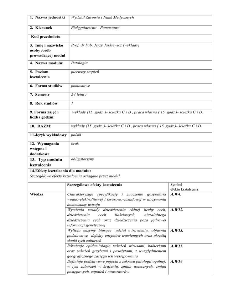 1. Nazwa jednostki Wydział Zdrowia i Nauk Medycznych 2. Kierunek Pielęgniarstwo - Pomostowe Kod przedmiotu 3. Imię i nazwisko osoby /osób prowadzącej moduł Prof. dr hab. Jerzy Jaśkiewicz (wykłady) 4. Nazwa modułu: Patologia 5. Poziom kształcenia pierwszy stopień 6. Forma studiów pomostowe 7. Semestr 2 ( letni ) 8. Rok studiów 1 9. Forma zajęć i liczba godzin: wykłady (15 godz. )- ścieżka C i D , praca własna ( 15 godz.)- ścieżka C i D. 10. RAZM: wykłady (15 godz. )- ścieżka C i D , praca własna ( 15 godz.)- ścieżka C i D. 11.Język wykładowy polski 12. Wymagania wstępne i dodatkowe brak 13. Typ modułu kształcenia obligatoryjny 14.Efekty kształcenia dla modułu: Szczegółowe efekty kształcenia osiągane przez moduł. Wiedza Szczegółowe efekty kształcenia Symbol efektu kształcenia Charakteryzuje specyfikację i znaczenie gospodarki wodno-elektrolitowej i kwasowo-zasadowej w utrzymaniu homeostazy ustroju Wymienia zasady dziedziczenia różnej liczby cech, dziedziczenia cech ilościowych, niezależnego dziedziczenia cech oraz dziedziczenia poza jądrowej informacji genetycznej Wylicza enzymy biorące udział w trawieniu, objaśnia podstawowe defekty enzymów trawiennych oraz określą skutki tych zaburzeń Różnicuje epidemiologię zakażeń wirusami, bakteriami oraz zakażeń grzybami i pasożytami, z uwzględnieniem geograficznego zasięgu ich występowania Definiuje podstawowe pojęcia z zakresu patologii ogólnej, w tym zaburzeń w krążeniu, zmian wstecznych, zmian postępowych, zapaleń i nowotworów A.W4. A.W12. A.W13. A.W15. A.W19 Umiejętności Omawia wybrane zagadnienia z zakresu patologii A.W20. narządowej układu krążenia, układu oddechowego, trawiennego, moczowo-płciowego i nerwowego Wymienia czynniki chorobotwórcze zewnętrzne i A.W21. wewnętrzne, modyfikowalne i niemodyfikowalne Prognozuje kierunek procesów biochemicznych w A.U3. poszczególnych stanach klinicznych Szacuje ryzyko ujawnienia się danej choroby w oparciu o zasady dziedziczenia i wpływ czynników środowiskowych A.U6. Ocenia wpływ leczenia farmakologicznego na A.U8. fizjologiczne i biochemiczne procesy zachodzące w poszczególnych narządach Opisuje zmiany w funkcjonowaniu organizmu jako całości A.U11. w sytuacji zaburzenia jego homeostazy Powiązuje obrazy uszkodzeń tkankowych i narządowych z objawami klinicznymi choroby, wywiadem i wynikami badań diagnostycznych Wykorzystuje wiedzę na temat chorób uwarunkowanych genetycznie w profilaktyce nowotworów oraz diagnostyce prenatalnej Szacuje niebezpieczeństwo toksykologiczne w określonych grupach wiekowych oraz w różnych stanach klinicznych Kompetencje społeczne 15. Stosowane metody dydaktyczne A.U12. A.U13. A.U16. Systematycznie wzbogaca wiedzę zawodową i kształtuje A.K2. umiejętności dążąc do profesjonalizmu Prezentuje otwartość na rozwój podmiotowości własnej i A.K9. pacjenta Wykład informacyjny przygotowany w formie prezentacji multimedialnych. 16. Metody sprawdzania i kryteria oceny efektów kształcenia SYMBOL Efektu Kształcenia A.W4. Formy sprawdzenia osiągnięcia efektu A.W12. test wielokrotnego wyboru (egzamin) A.W13. test wielokrotnego wyboru (egzamin) A.W15. test wielokrotnego wyboru (egzamin) A.W19 Pytania otwarte (kolokwium), test wielokrotnego wyboru (egzamin) A.W20. Pytania otwarte (kolokwium), test wielokrotnego wyboru (egzamin) A.W21. test wielokrotnego wyboru (egzamin) test wielokrotnego wyboru (egzamin) A.U3. test wielokrotnego wyboru (egzamin) A.U6. test wielokrotnego wyboru (egzamin) A.U8. test wielokrotnego wyboru (egzamin) A.U11. Pytania otwarte (kolokwium), test wielokrotnego wyboru (egzamin) A.U12. Pytania otwarte (kolokwium), test wielokrotnego wyboru (egzamin) A.U13. test wielokrotnego wyboru (egzamin) A.U16. test wielokrotnego wyboru (egzamin) A.K2. Prezentacja wybranego zagadnienia w formie referatu. Obserwacja przez nauczyciela Prezentacja wybranego zagadnienia w formie referatu. Obserwacja przez nauczyciela Zasady dopuszczenia do egzaminu: zaliczenie ćwiczeń, dla których warunkiem jest obecność na zajęciach (dopuszczalna jedna nieusprawiedliwiona nieobecność), pozytywne oceny ze wszystkich kolokwiów cząstkowych oraz przygotowanie prezentacji na wybrany temat. Warunkiem zaliczenia modułu jest zaliczenie min. 50% testu (test wielokrotnego wyboru). A.K9. 17. Forma i warunki zaliczenia modułu, zasady dopuszczenia do egzaminu oraz zaliczenia poszczególnych zajęć, jeśli takie wchodzą w zakres danego modułu 19. Treści merytoryczne modułu 20. Wykaz literatury obowiązkowej i uzupełniającej Wykłady: Definicja zdrowia i choroby. Objawy charakterystyczne dla stanów chorobowych. Schorzenia metaboliczne – cukrzyca, otyłość. Patomechanizm zaburzeń odporności. Patomechanizm infekcji bakteryjnych i wirusowych, choroby tkanki łącznej. Schorzenia degeneracyjne układu nerwowego. Następstwa uzależnień – alkoholizm, narkomania. Zaburzenia gospodarki wodnoelektrolitowej i RKZ. Patomechanizm schorzeń narządowych: układ oddechowy, układ krążenia, układ pokarmowy. Zaburzenia wydzielania i funkcji hormonów. Samokształcenie: Wybrane schorzenia układu sercowo- naczyniowego, pokarmowego, oddechowego i nerwowego. Podstawowa 1.Vinay Kumar, Ramzi S. Cotran, Stanley L. Robbins [red. wyd. pol.] Olszewski T. W. Patologia Robbinsa Elsevier Urban & Partner, 2005 2.Thor P., Podstawy patofizjologii człowieka, Vesalius, 2007, wyd.2 Uzupełniająca 3.Krauss H., Sosnowski P. Fizjologia człowieka z elementami patologii, Poznań, 2009 4.Kruś S. Patologia. Podręcznik dla licencjackich studiów medycznych, PZWL, Warszawa, 2003