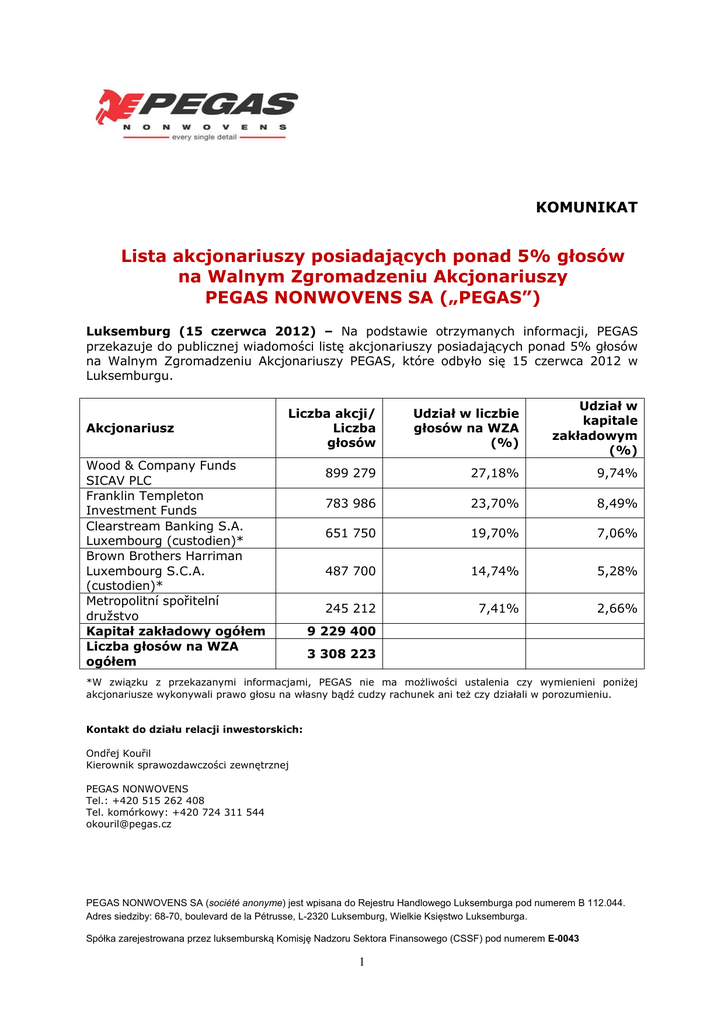 KOMUNIKAT Lista akcjonariuszy posiadających ponad 5% głosów na Walnym Zgromadzeniu Akcjonariuszy PEGAS NONWOVENS SA („PEGAS”) Luksemburg (15 czerwca 2012) – Na podstawie otrzymanych informacji, PEGAS przekazuje do publicznej wiadomości listę akcjonariuszy posiadających ponad 5% głosów na Walnym Zgromadzeniu Akcjonariuszy PEGAS, które odbyło się 15 czerwca 2012 w Luksemburgu. Akcjonariusz Liczba akcji/ Liczba głosów Udział w liczbie głosów na WZA (%) Udział w kapitale zakładowym (%) 899 279 27,18% 9,74% 783 986 23,70% 8,49% 651 750 19,70% 7,06% 487 700 14,74% 5,28% 245 212 7,41% 2,66% Wood & Company Funds SICAV PLC Franklin Templeton Investment Funds Clearstream Banking S.A. Luxembourg (custodien)* Brown Brothers Harriman Luxembourg S.C.A. (custodien)* Metropolitní spořitelní družstvo Kapitał zakładowy ogółem Liczba głosów na WZA ogółem 9 229 400 3 308 223 *W związku z przekazanymi informacjami, PEGAS nie ma możliwości ustalenia czy wymienieni poniżej akcjonariusze wykonywali prawo głosu na własny bądź cudzy rachunek ani też czy działali w porozumieniu. Kontakt do działu relacji inwestorskich: Ondřej Kouřil Kierownik sprawozdawczości zewnętrznej PEGAS NONWOVENS Tel.: +420 515 262 408 Tel. komórkowy: +420 724 311 544 [email protected] PEGAS NONWOVENS SA (société anonyme) jest wpisana do Rejestru Handlowego Luksemburga pod numerem B 112.044. Adres siedziby: 68-70, boulevard de la Pétrusse, L-2320 Luksemburg, Wielkie Księstwo Luksemburga. Spółka zarejestrowana przez luksemburską Komisję Nadzoru Sektora Finansowego (CSSF) pod numerem E-0043 1 PEGAS NONWOVENS S.A., société anonyme, to spółka holdingowa z siedzibą w Luksemburgu, posiadająca spółki operacyjne w Znojmo i i Bučovicach, w Czechach. PEGAS NONWOVENS jest producentem włóknin polipropylenowych i polietylenowych dla sektora artykułów higienicznych, a także dla sektorów przemysłowego, budowlanego, rolniczego i medycznego oraz innych specjalistycznych gałęzi przemysłu. Produkowane przez Spółkę włókniny są wykorzystywane przede wszystkim do produkcji pieluszek dziecięcych, kobiecych artykułów higienicznych oraz środków higienicznych dla osób dorosłych cierpiących na inkontynencję. Spółka aktywnie opracowuje nowe produkty, na które istnieje popyt na rynku, dzięki czemu utrzymuje pozycję technologicznego lidera na europejskim rynku włóknin. Obecnie PEGAS NONWOVENS zatrudnia ponad 420 osób. Akcje PEGAS NONWOVENS SA notowane są na Giełdzie Papierów Wartościowych w Pradze i na Giełdzie Papierów Wartościowych w Warszawie. PEGAS NONWOVENS SA (société anonyme) jest wpisana do Rejestru Handlowego Luksemburga pod numerem B 112.044. Adres siedziby: 68-70, boulevard de la Pétrusse, L-2320 Luksemburg, Wielkie Księstwo Luksemburga. Spółka zarejestrowana przez luksemburską Komisję Nadzoru Sektora Finansowego (CSSF) pod numerem E-0043 2